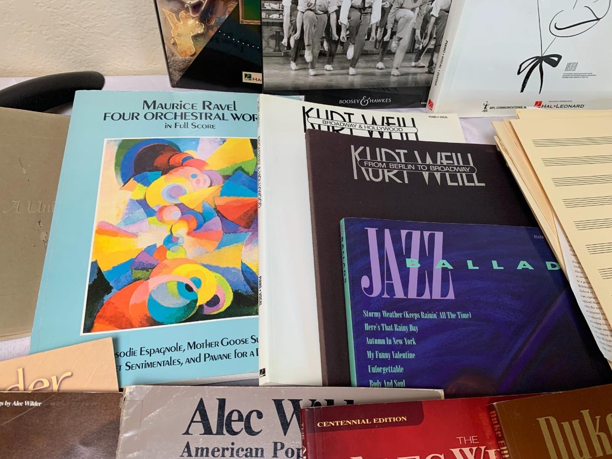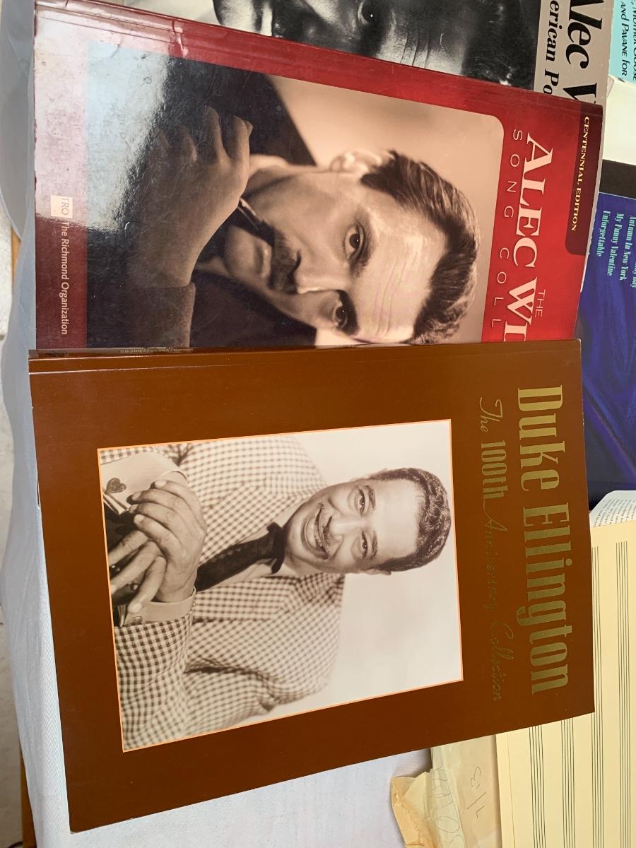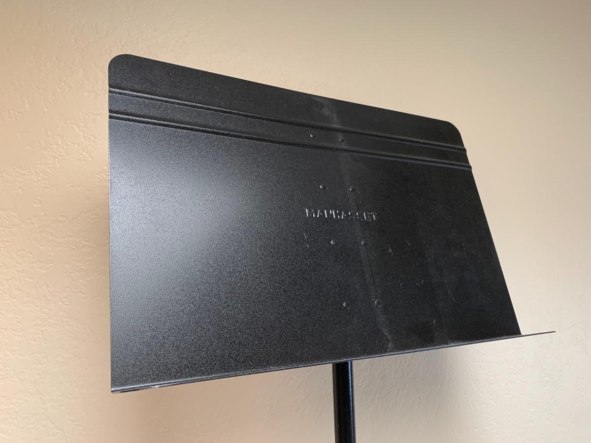 Lot includes a black metal sheet music full size stand by Manhasset. Also included are a collection of songbooks and a stack of blank sheet music pages.