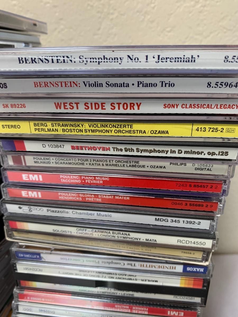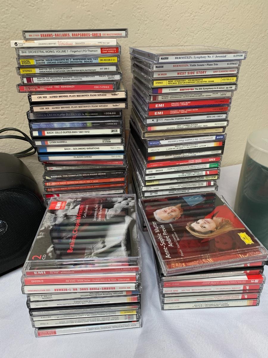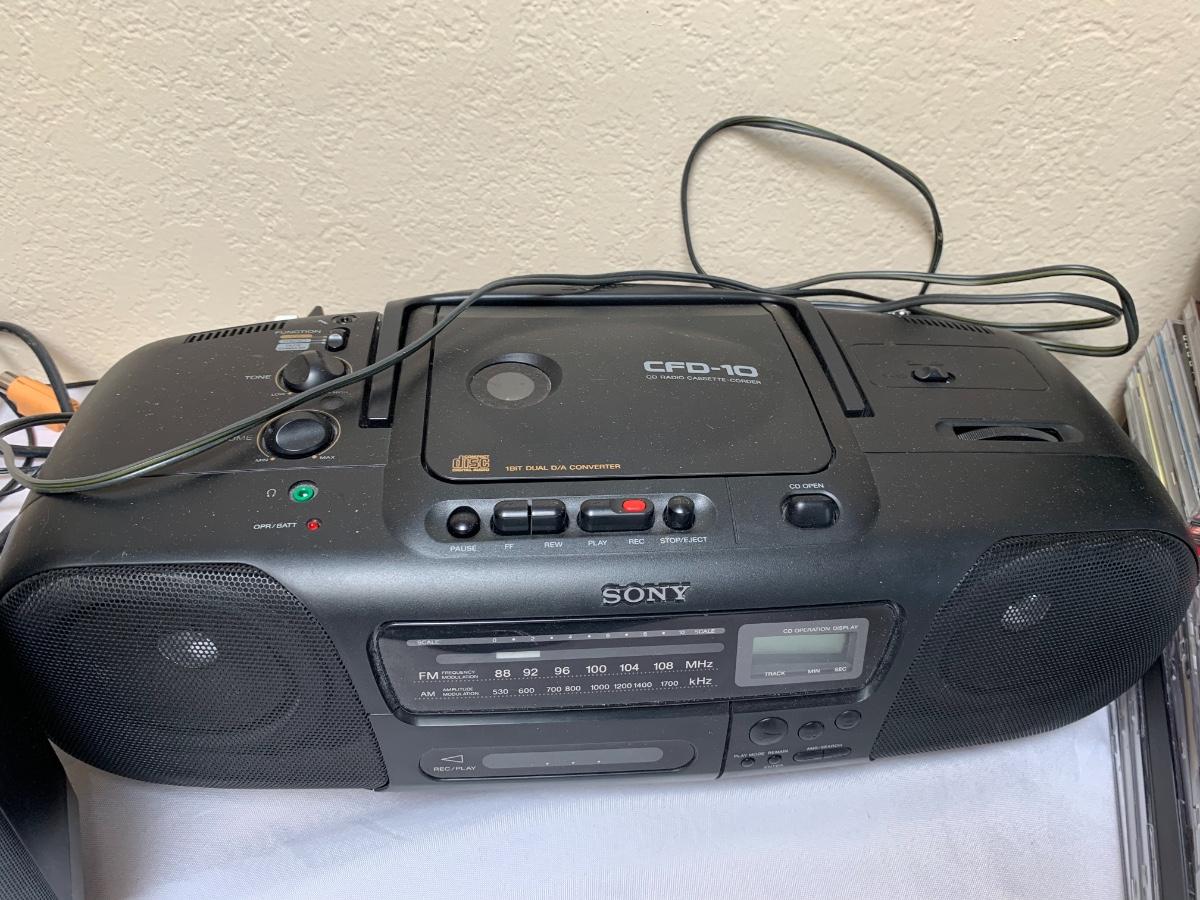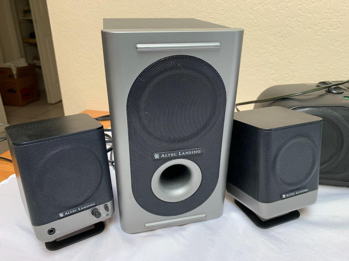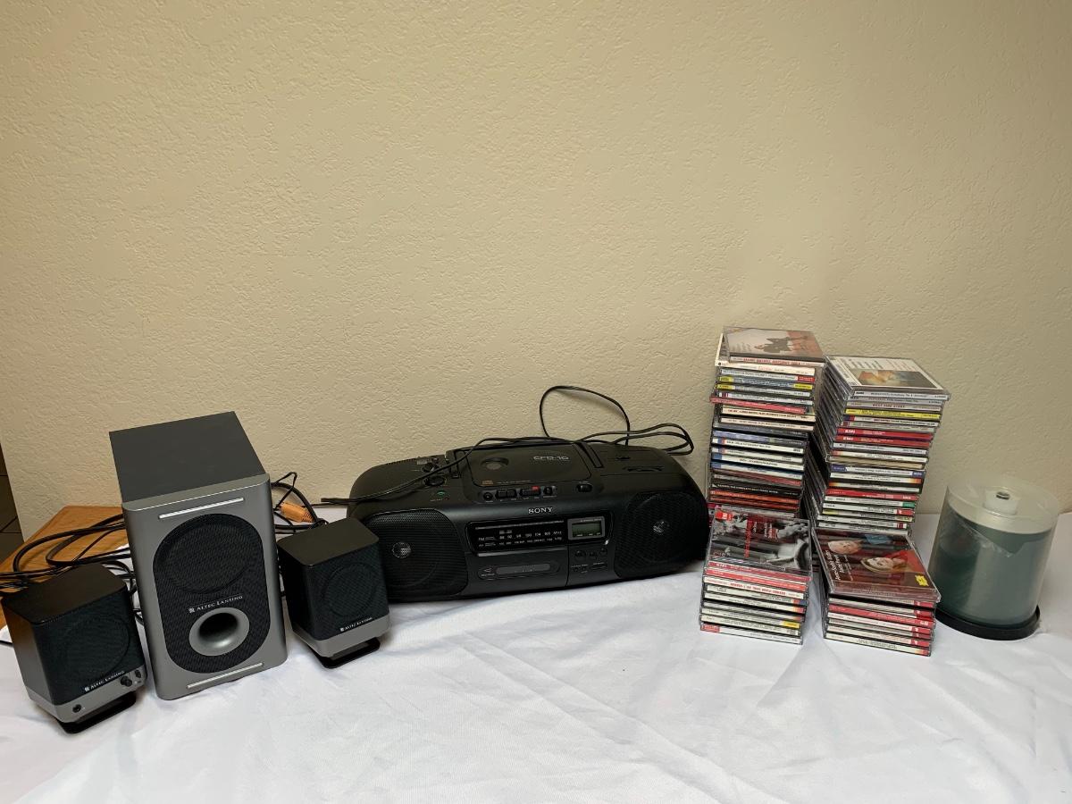 Assortment of CDs, one Sony boom box *not tested*, Altec lansing subwoofer and two small speakers *not tested*