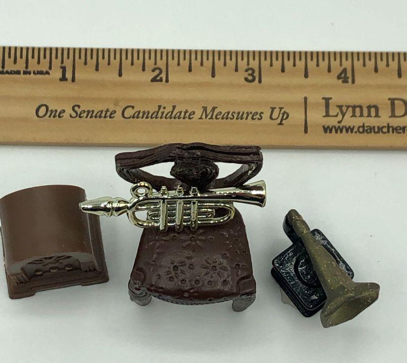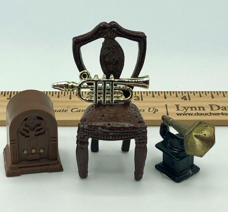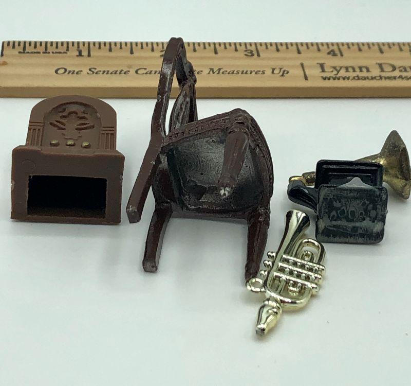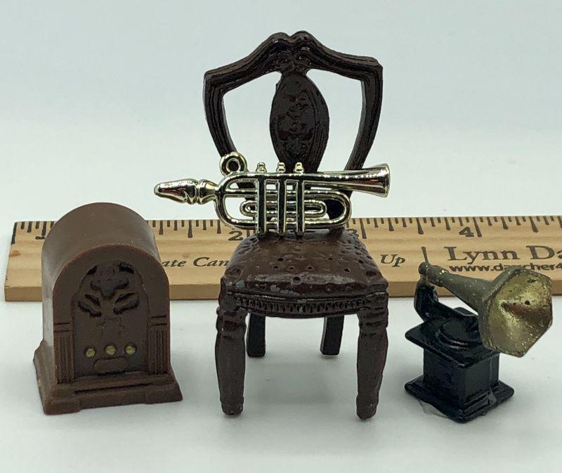 Music Room Dollhouse Miniatures Lot - heavy metal chair, Victrola Phonograph, Vintage Radio, Saxaphone