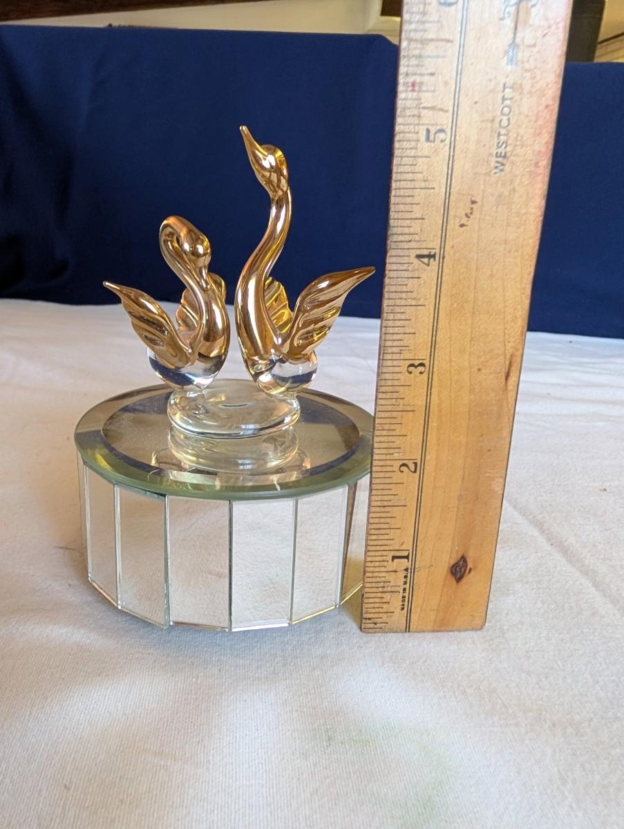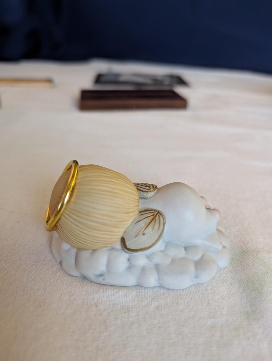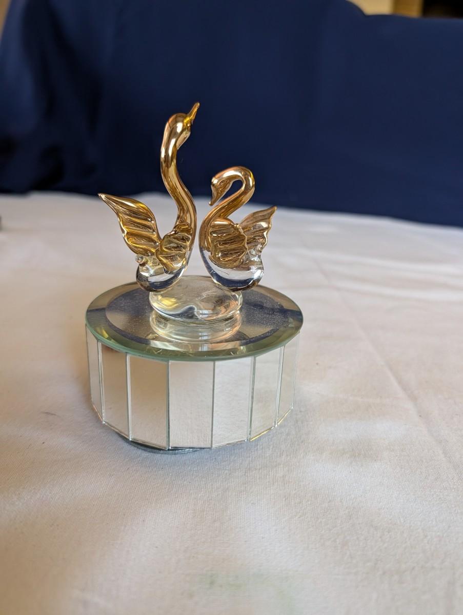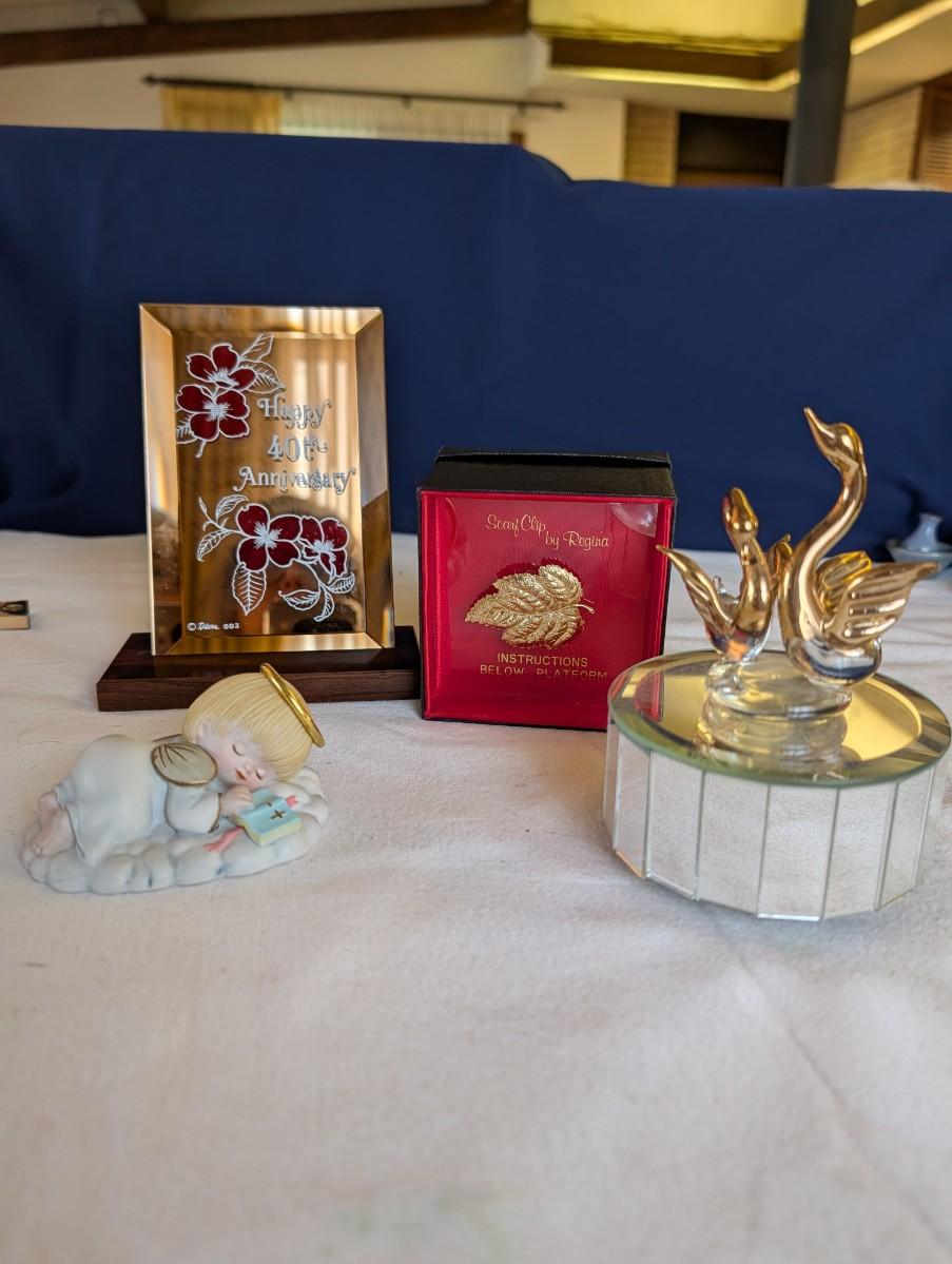 Musical swans, sleeping angel, 40th anniversary plaque, a gold leaf scarf holder.