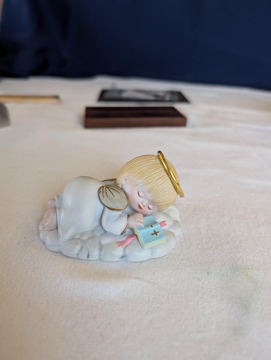 Porcelain angel, musical swan, Happy Anniversary plaque, gold leave scarf holder.