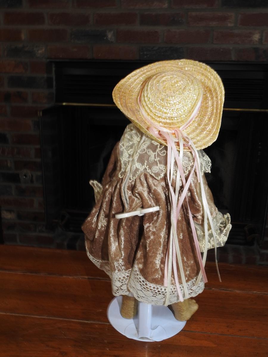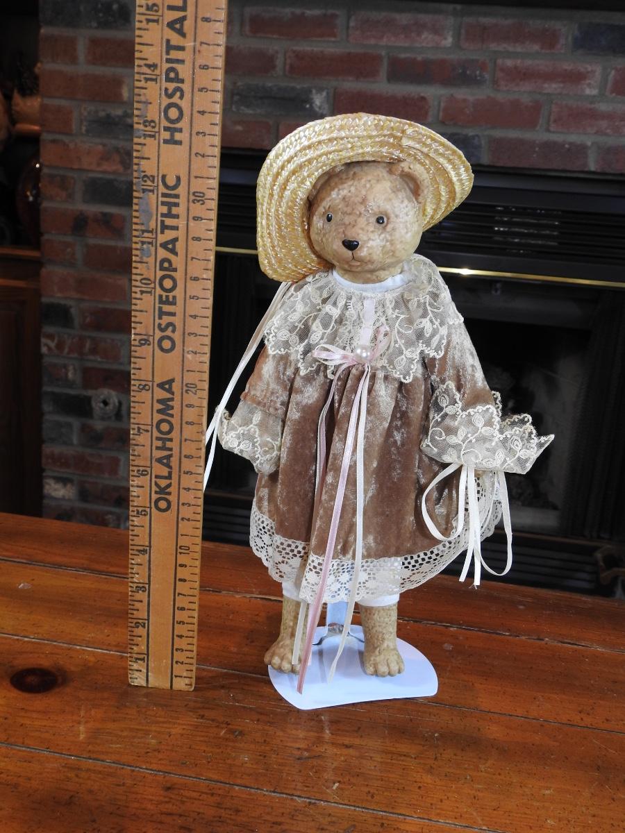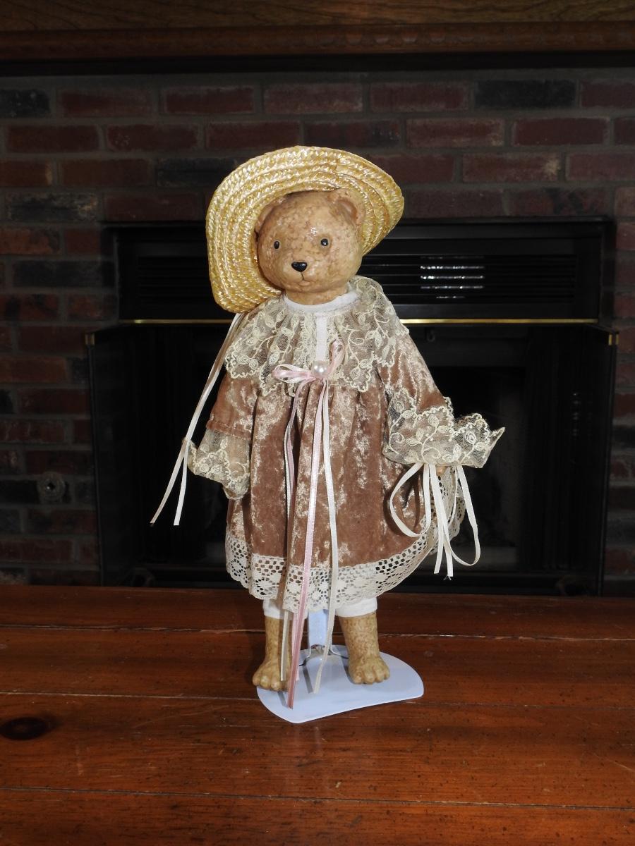 ENCO musical bear. Sits on durable stand. Adorned with straw hat and ribbons. Good working condition.