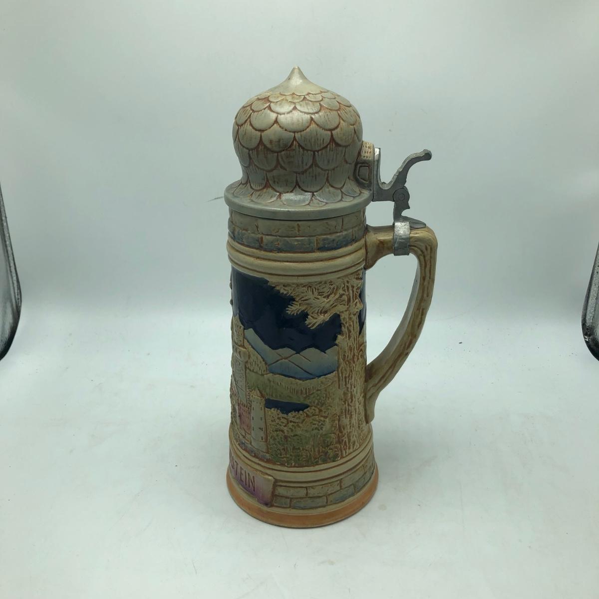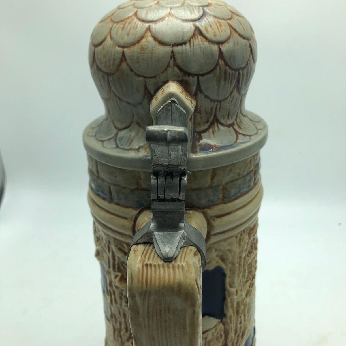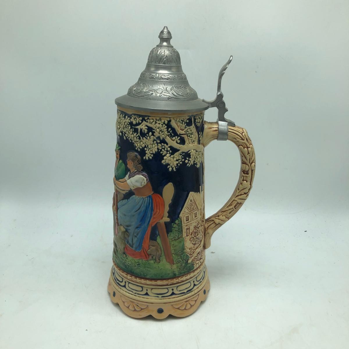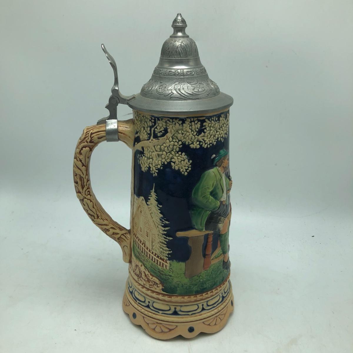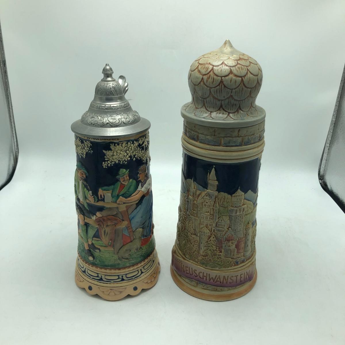 Lot includes a musical beer stein that plays Harry Line theme and a Goebel brand German stein. Tallest stein measures 4.5” x 6” x 12”.