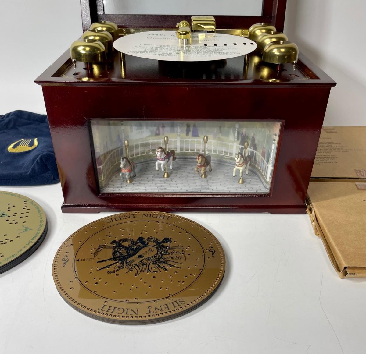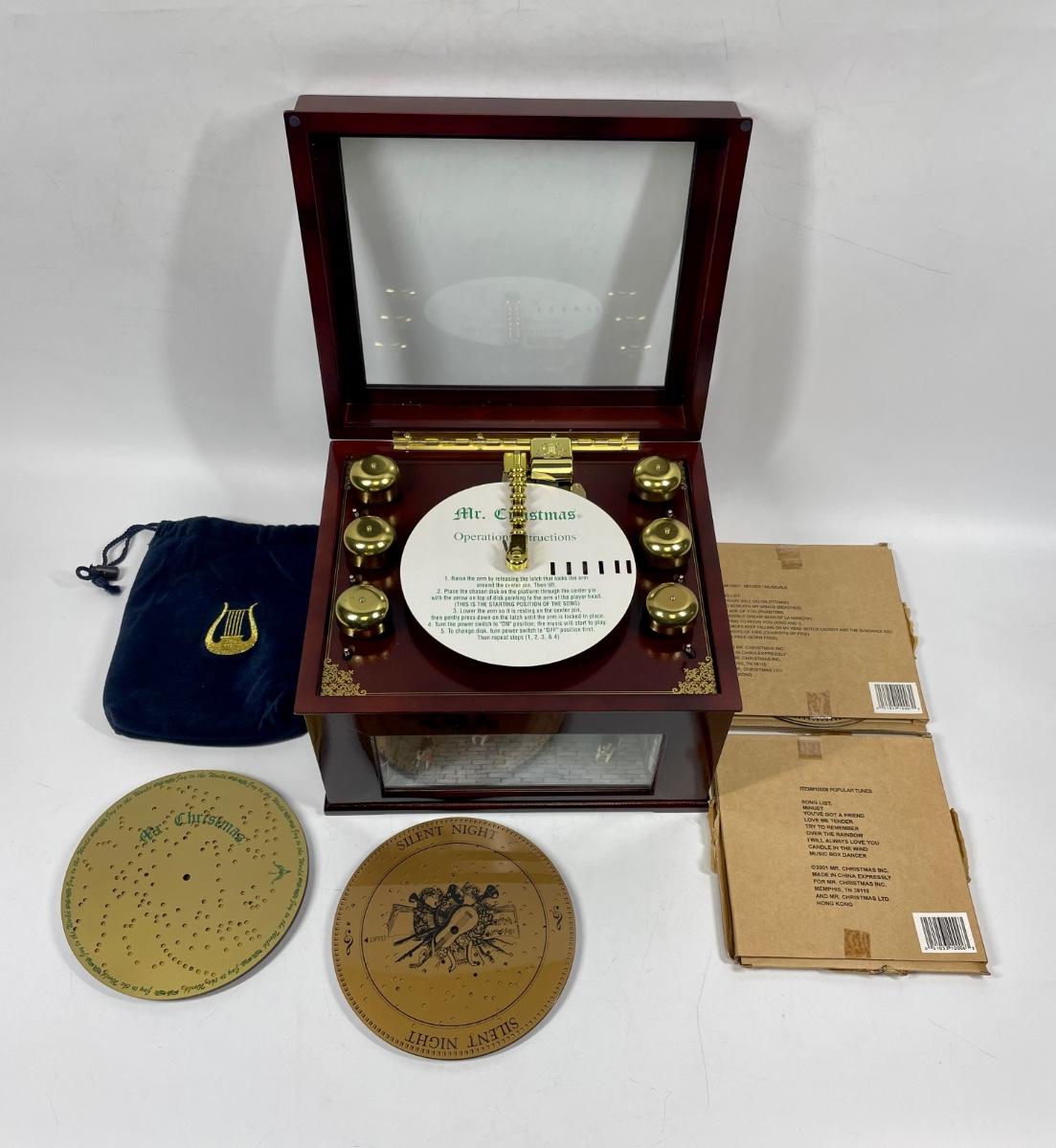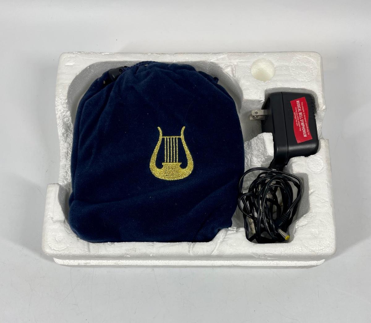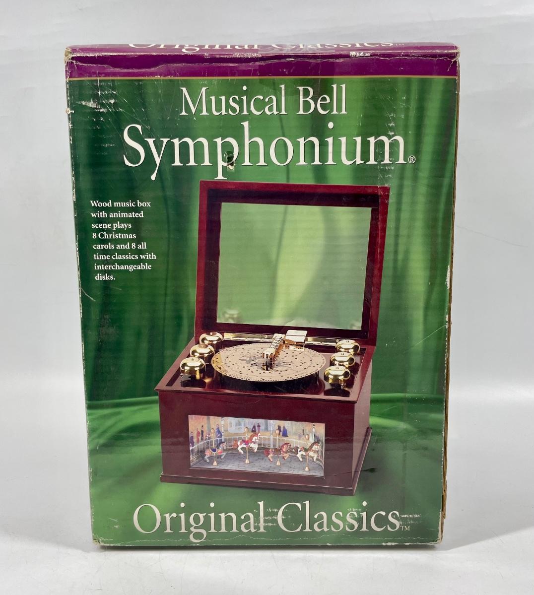 Musical Bell Symphonium Wood Music Box. Hinged lid with glass top. Includes 48 plastic song discs, felt bag for disc storage and power cord.