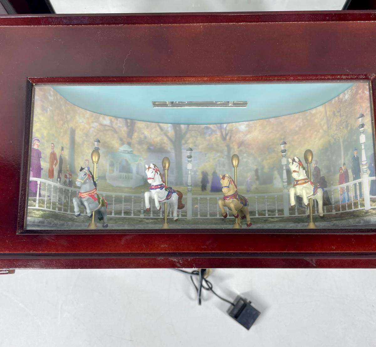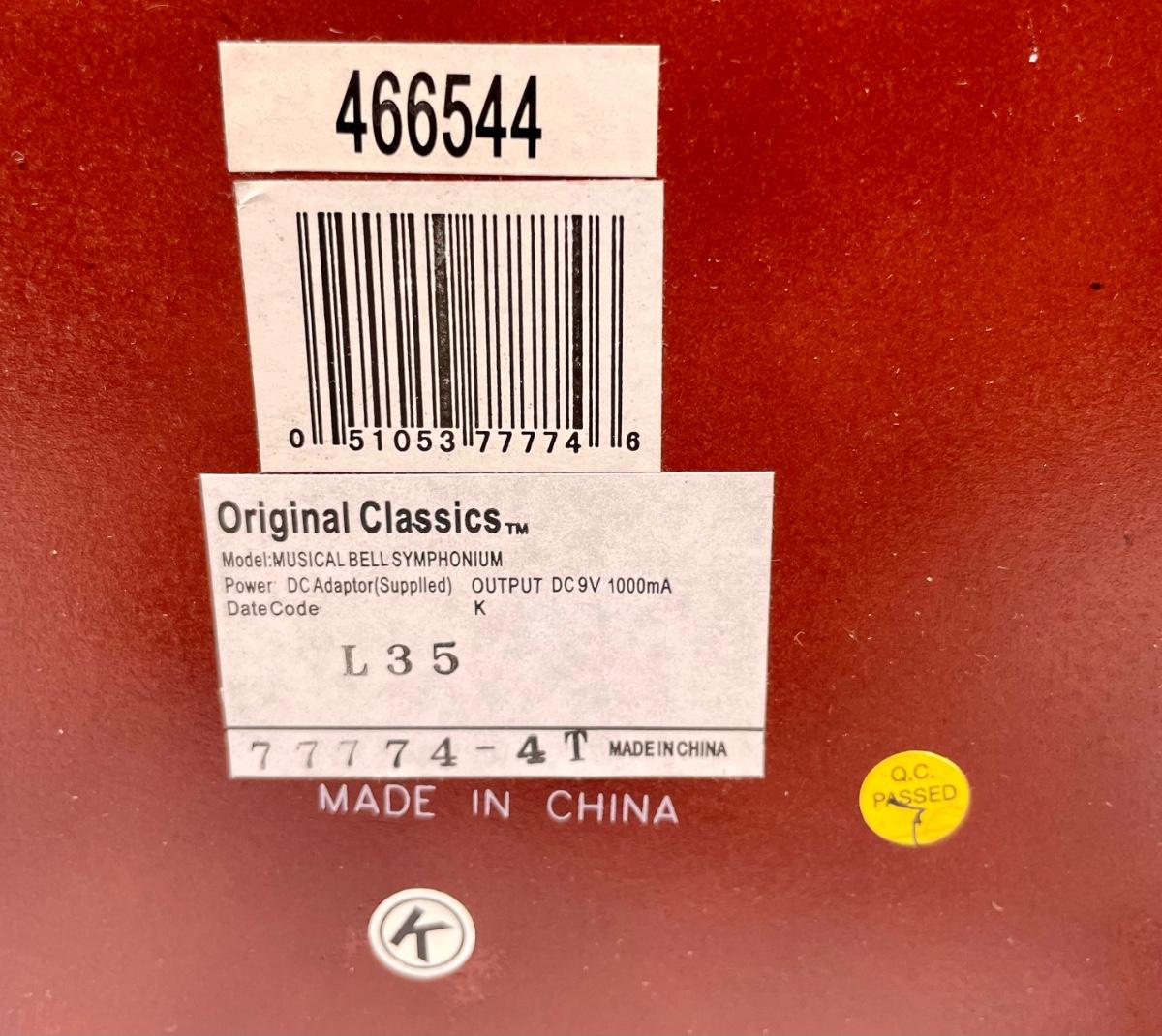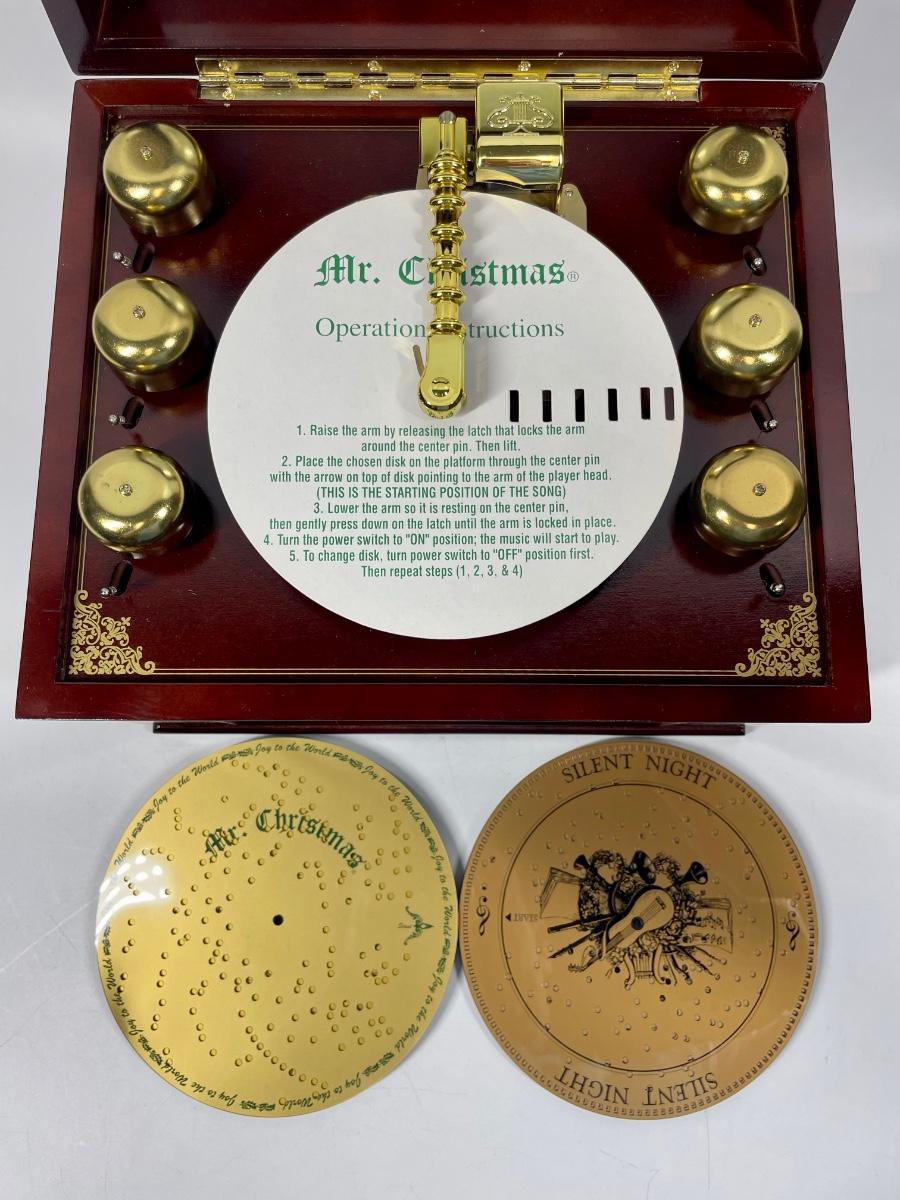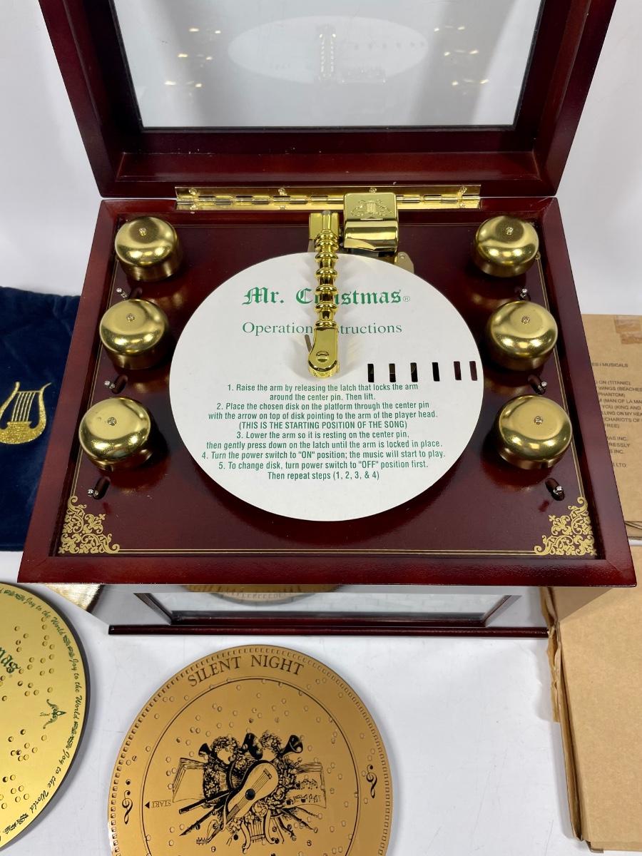 Musical Bell Symphonium Wood Music Box. Hinged lid with glass top. Includes 48 plastic song discs, felt bag for disc storage and power cord.