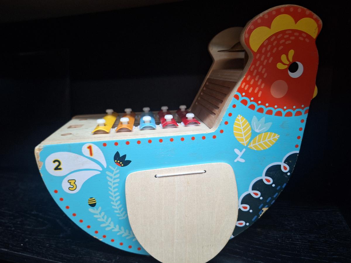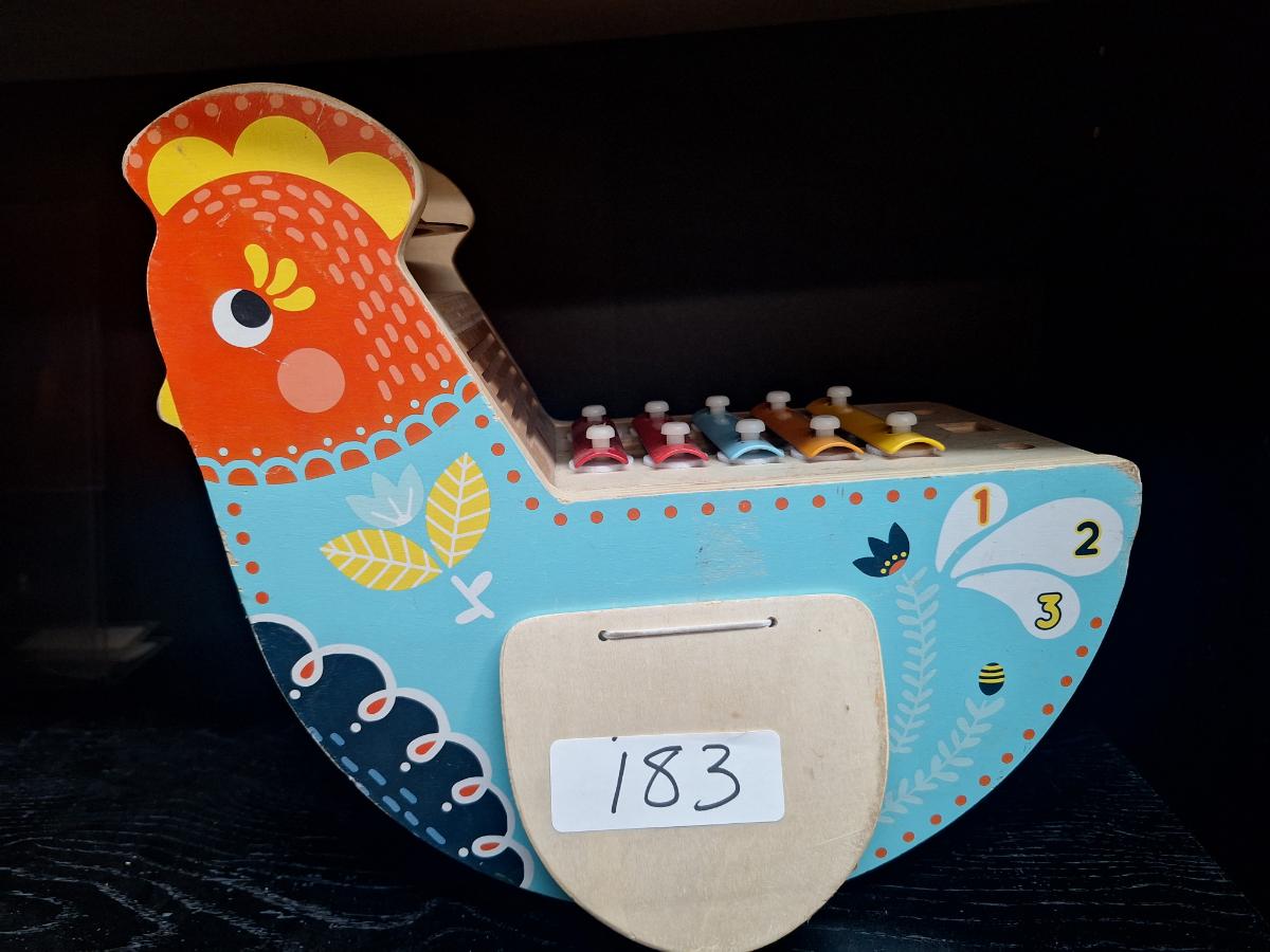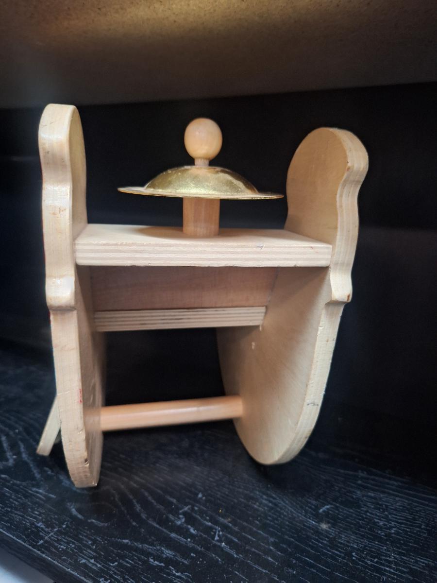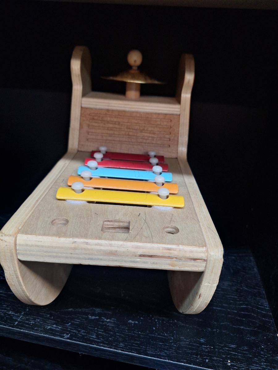 this does not have a stick of any kind for hitting the bells but it's still very cute- hand your toddler a wooden spoon they will love it.