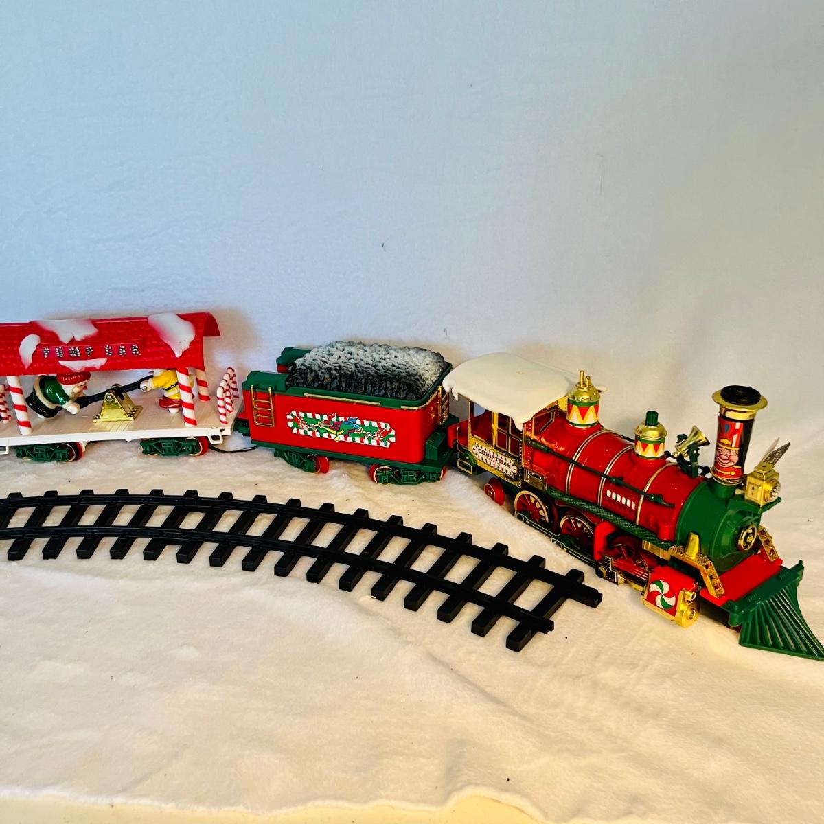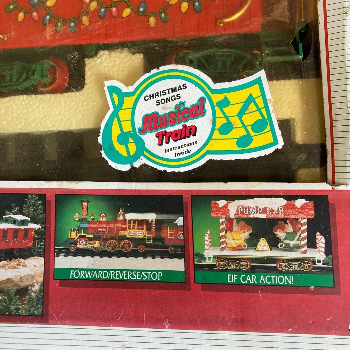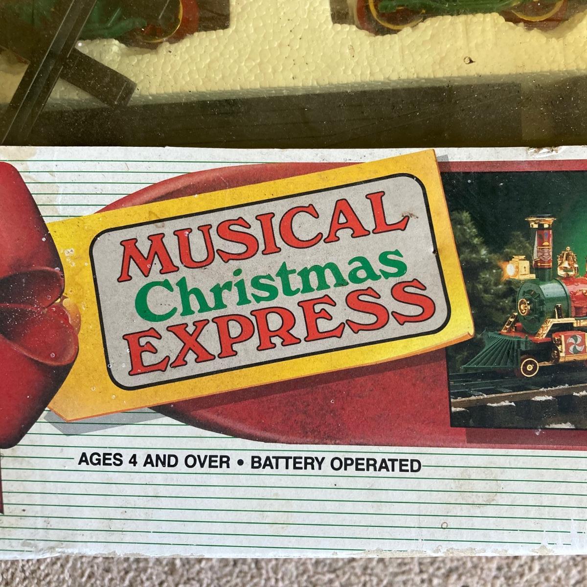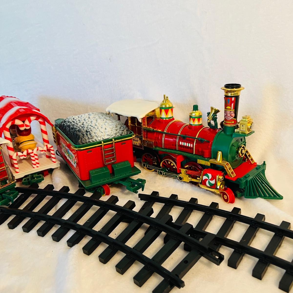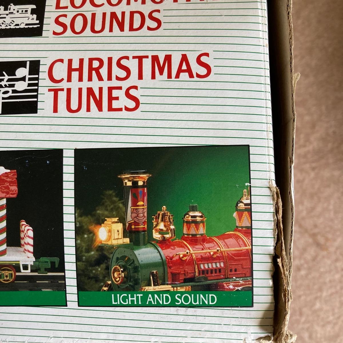 Plays Christmas Tunes, Realistic Locomotive Sounds that is battery operated. Box is worn but train set appears to have never been used. Box measures 25”x19”.