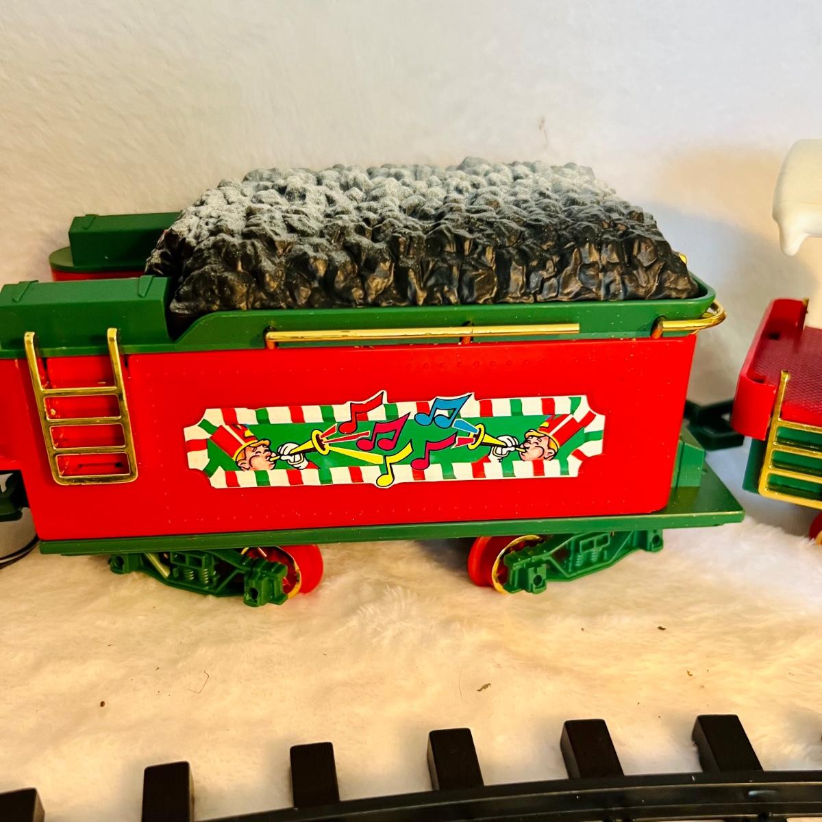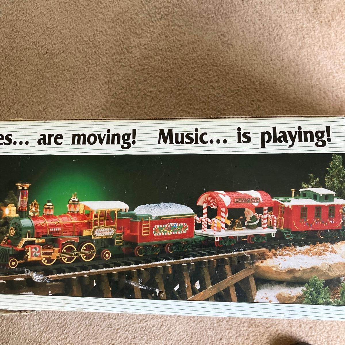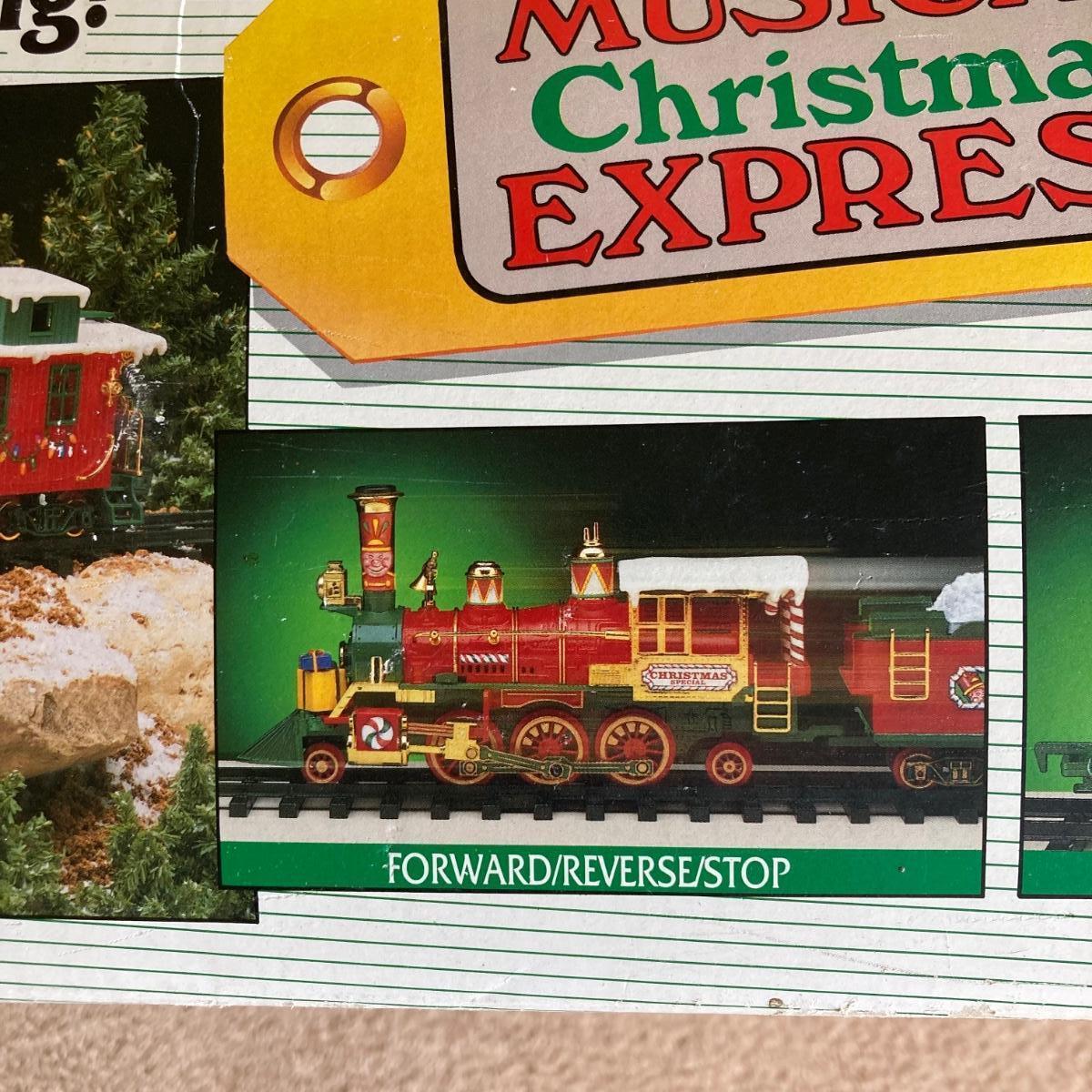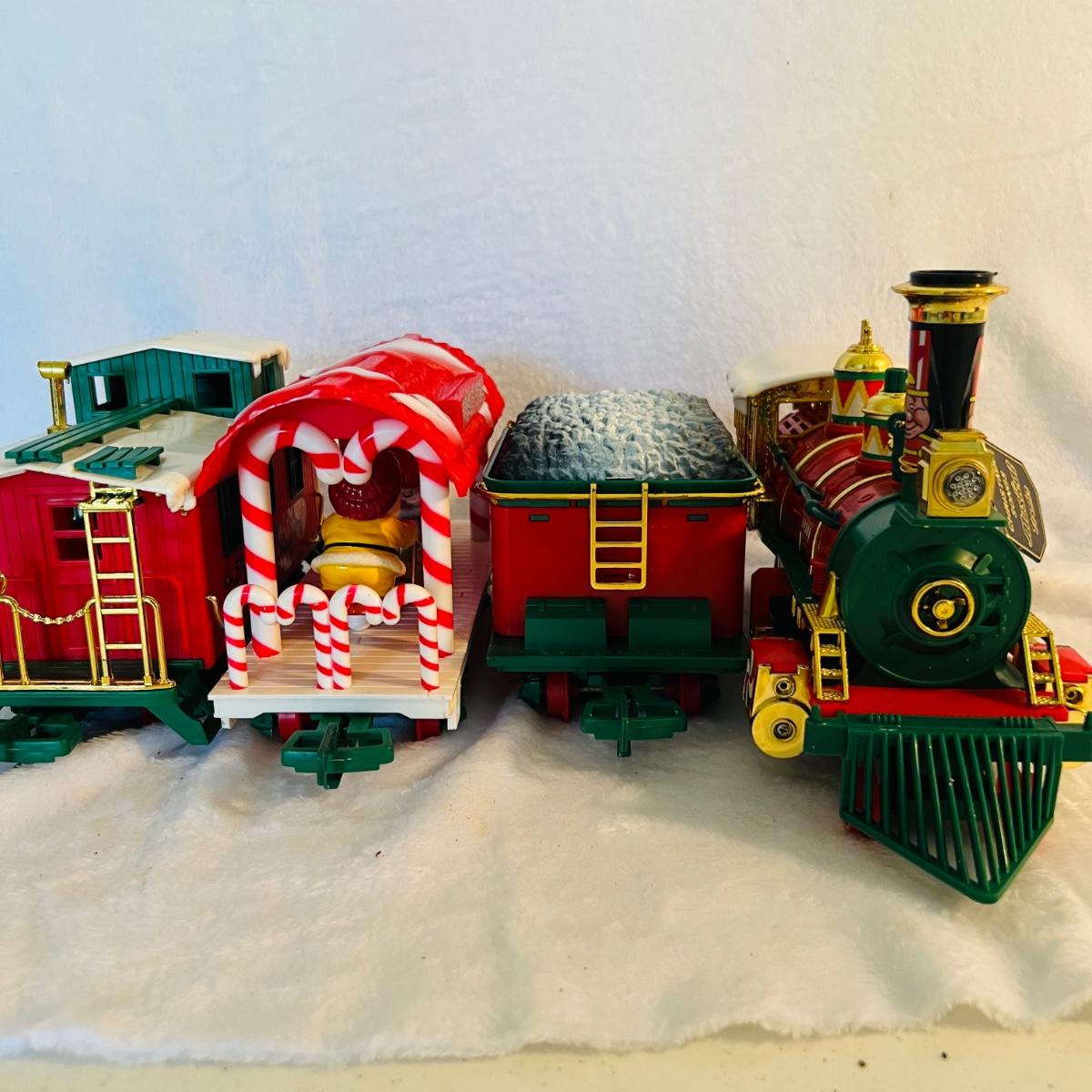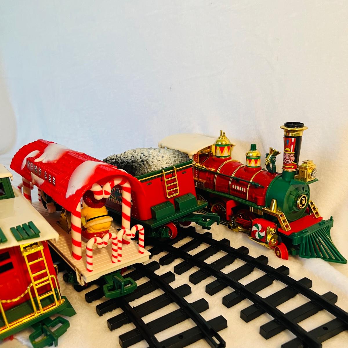 Plays Christmas Tunes, Realistic Locomotive Sounds that is battery operated. Box is worn but train set appears to have never been used. Box measures 25”x19”.