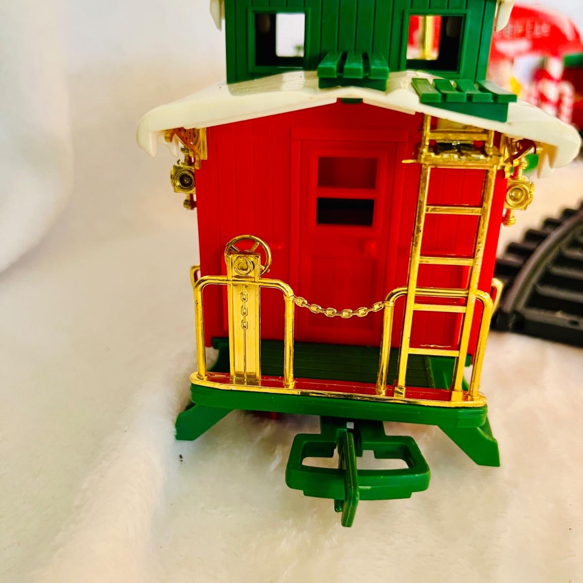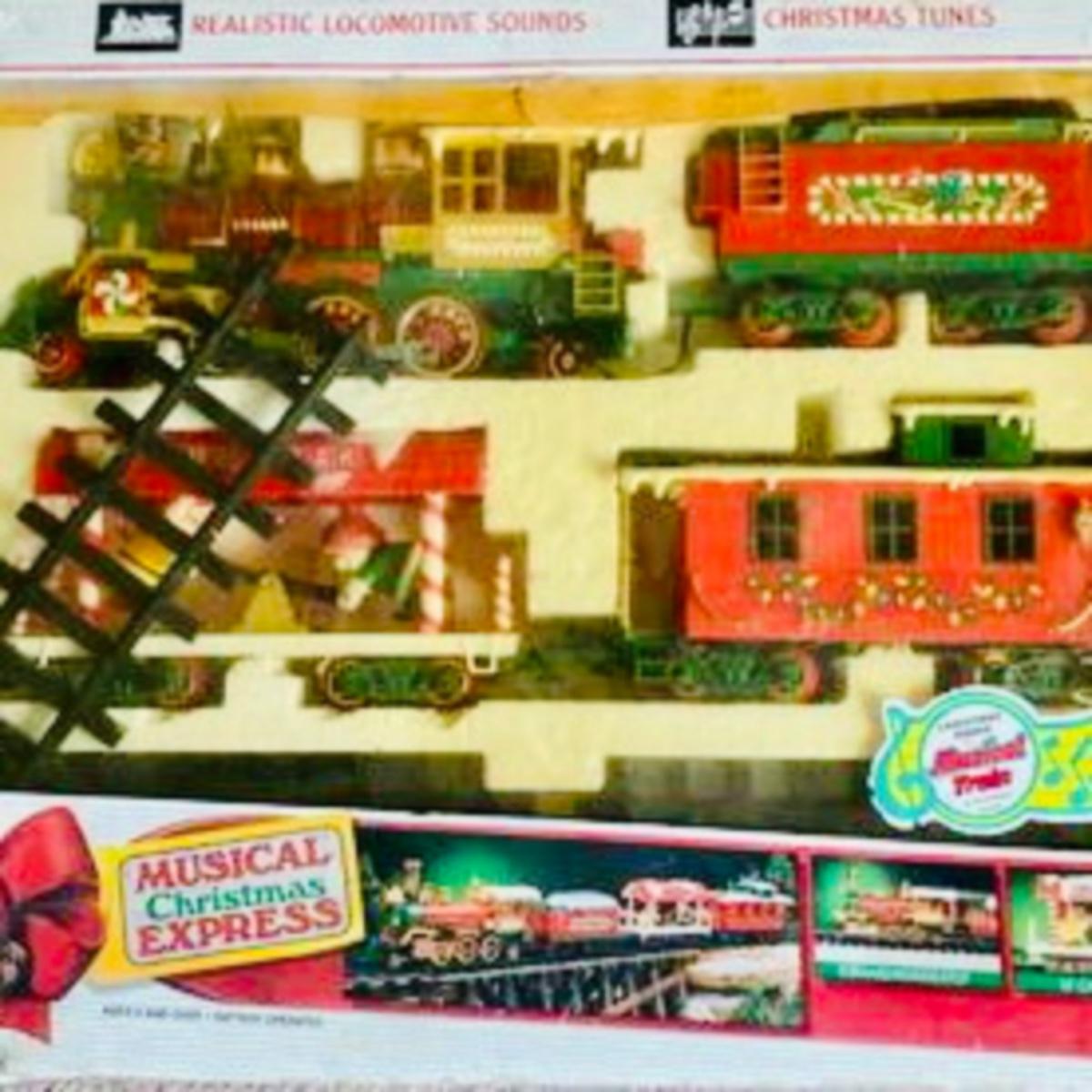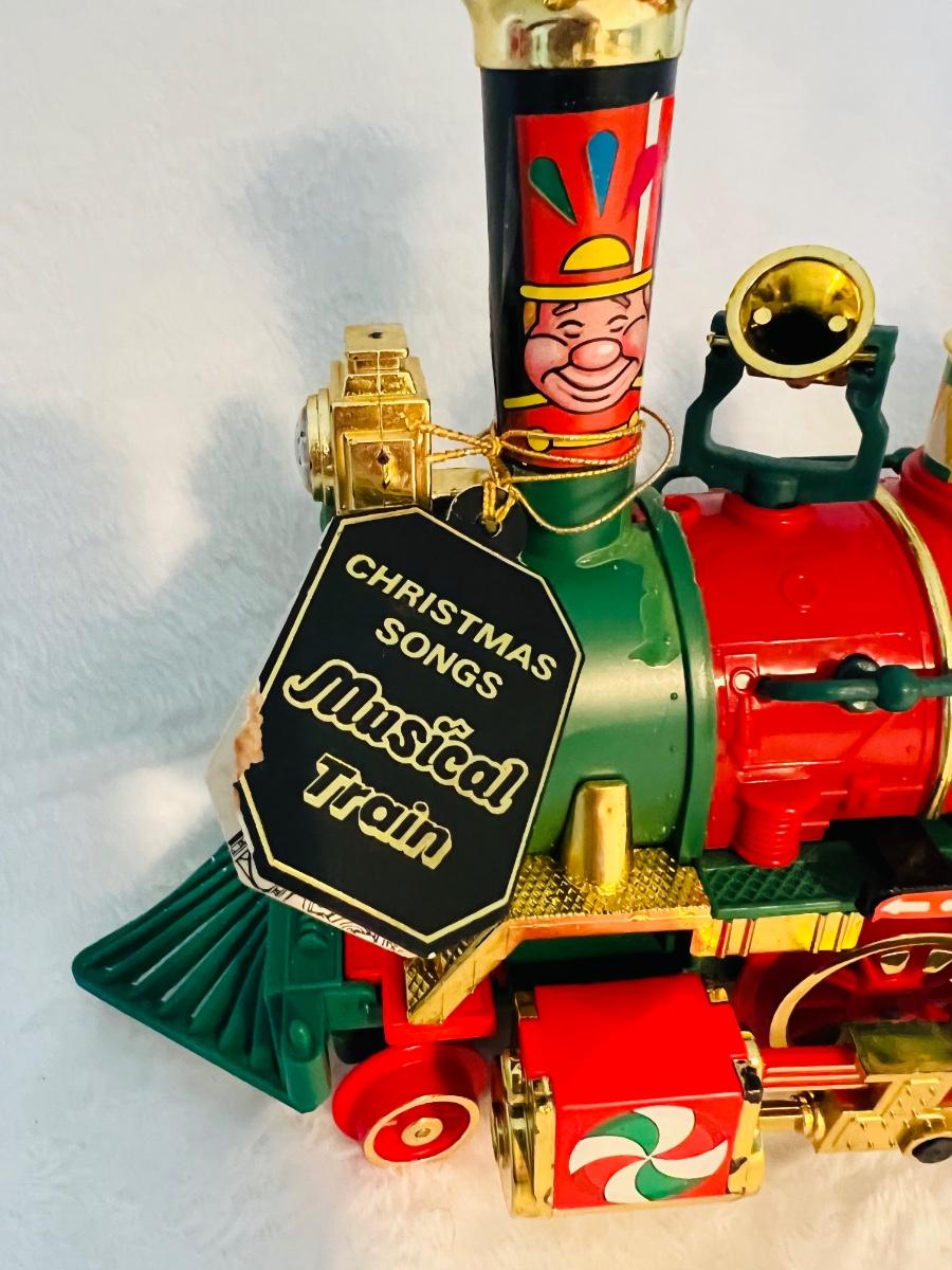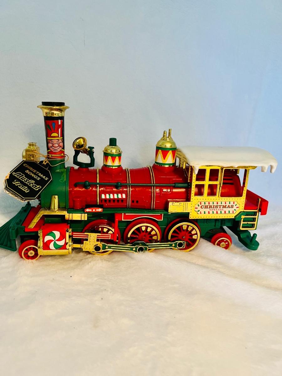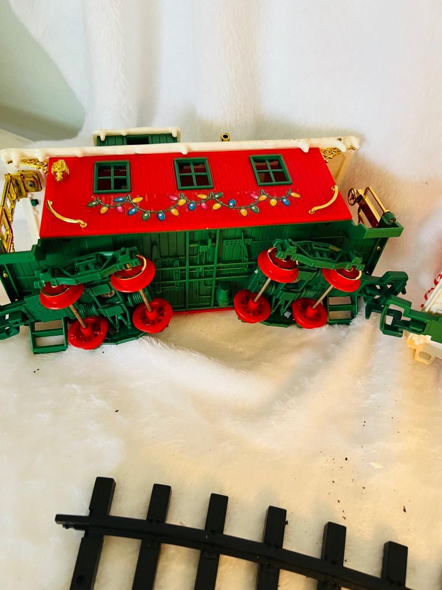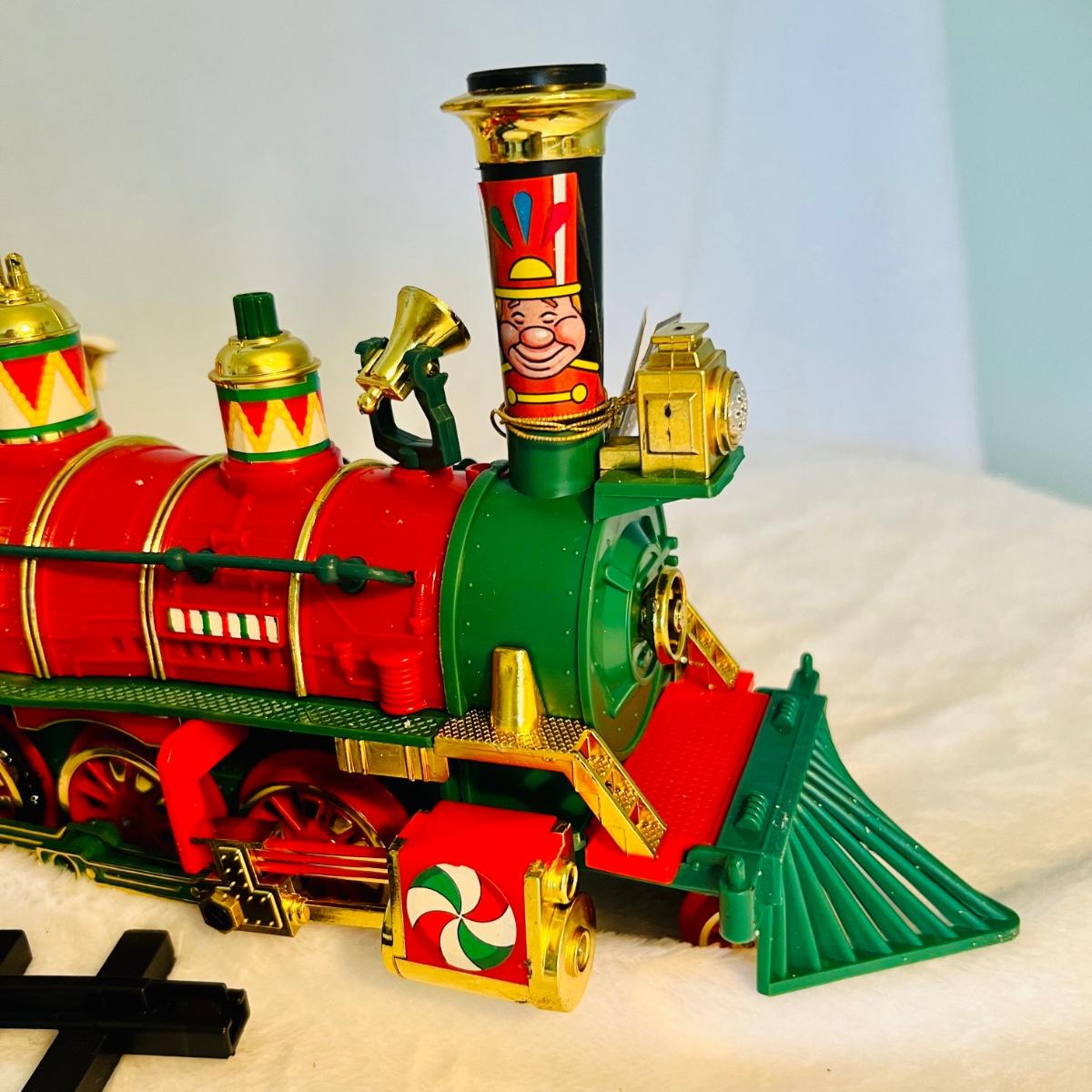 Plays Christmas Tunes, Realistic Locomotive Sounds that is battery operated. Box is worn but train set appears to have never been used. Box measures 25”x19”.