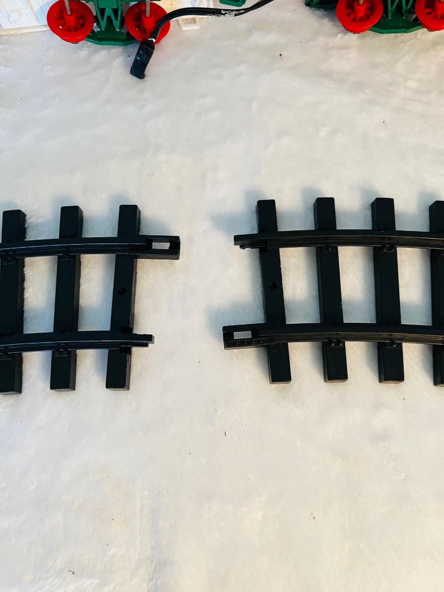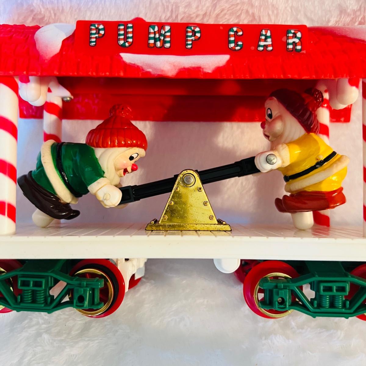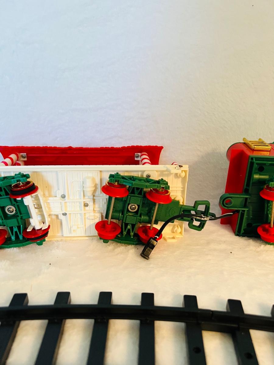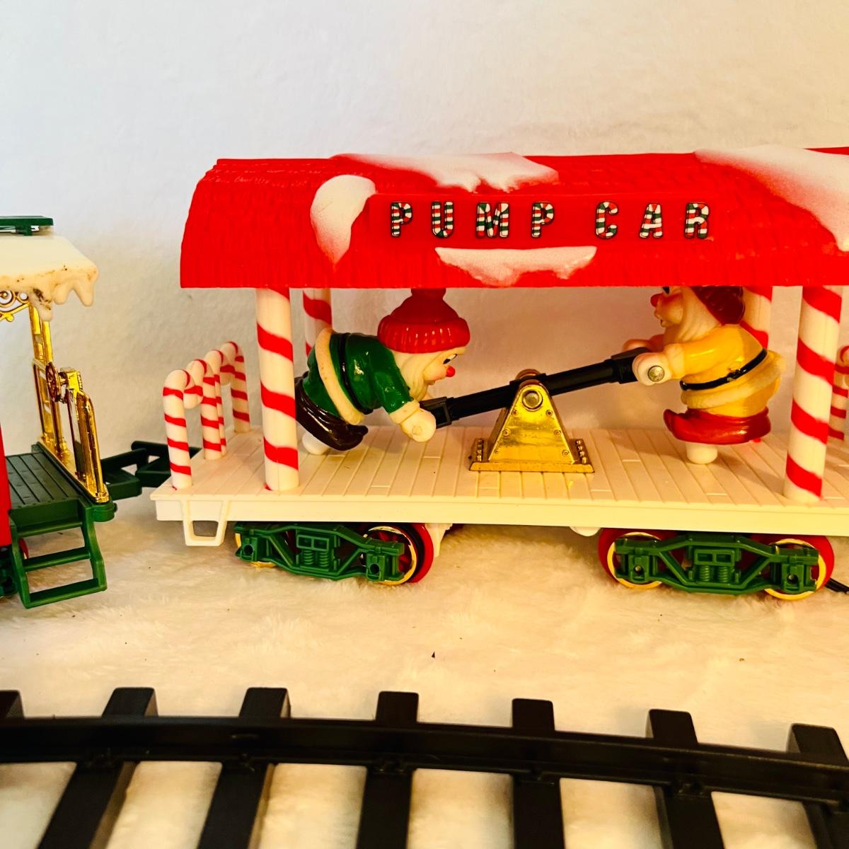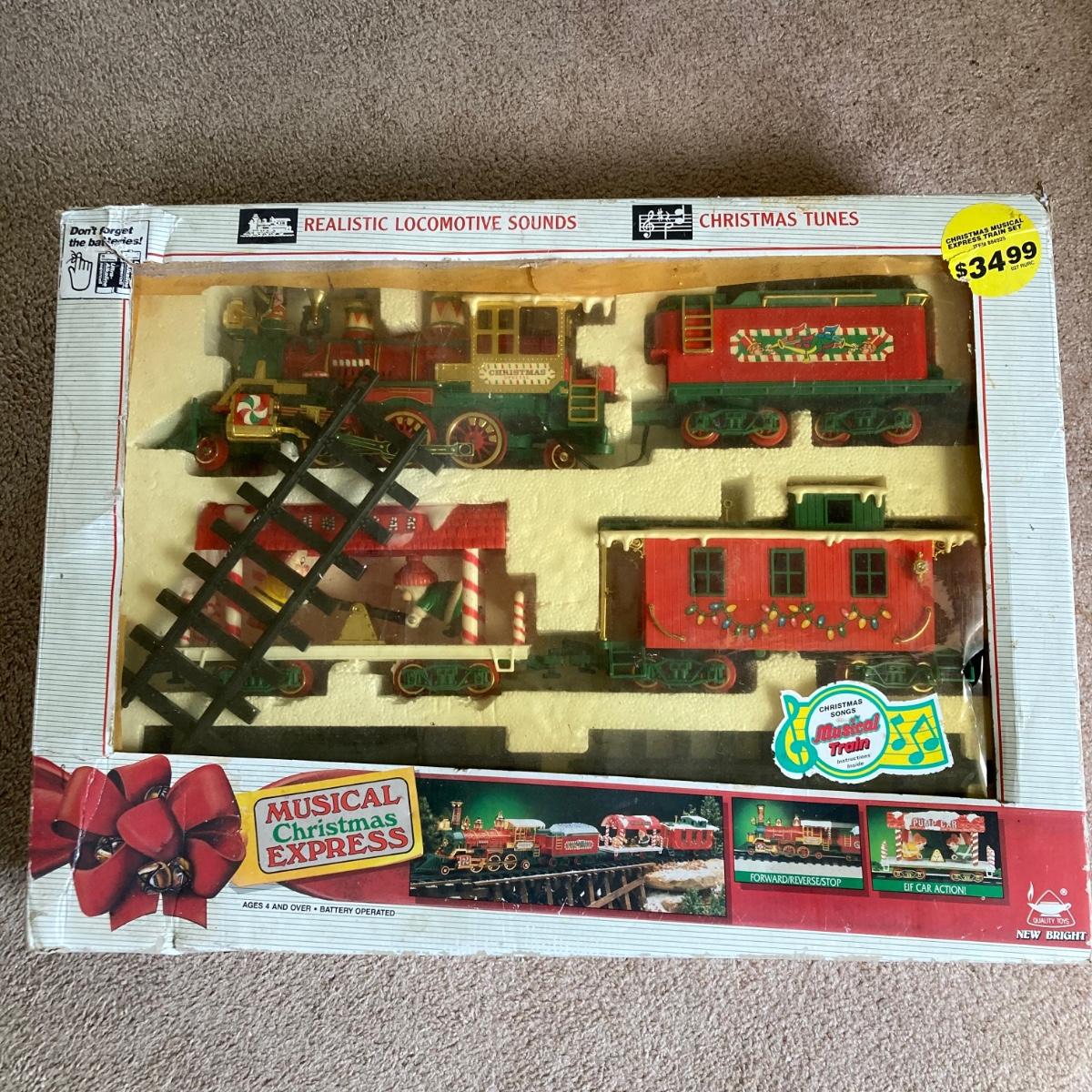 Plays Christmas Tunes, Realistic Locomotive Sounds that is battery operated. Box is worn but train set appears to have never been used. Box measures 25”x19”.