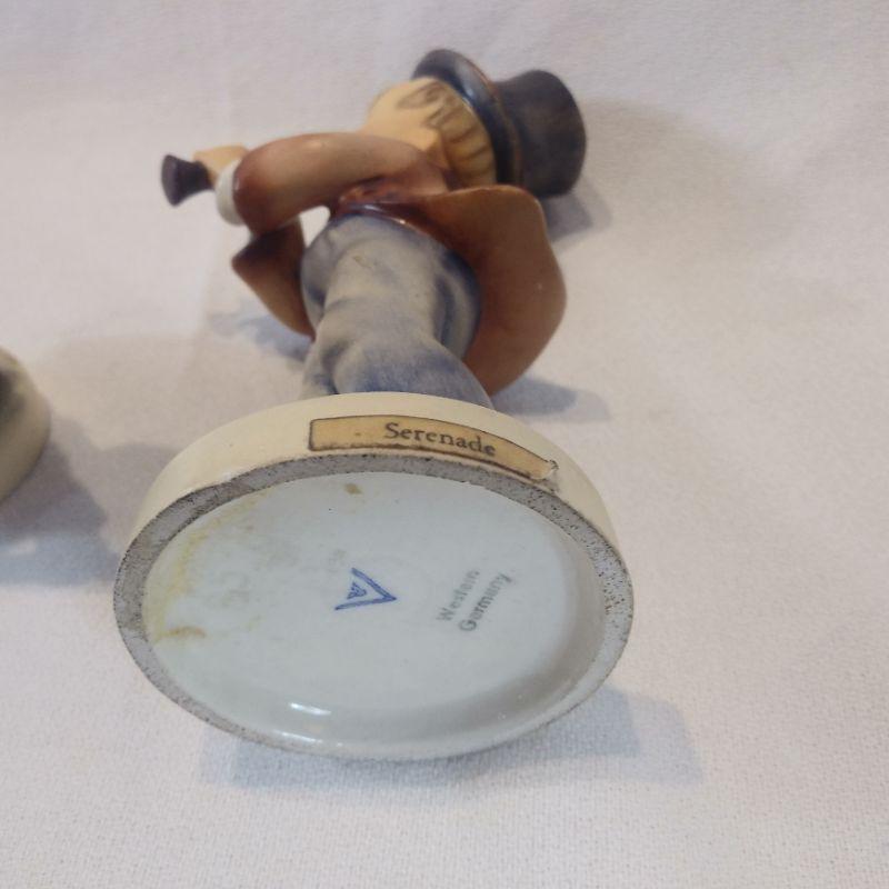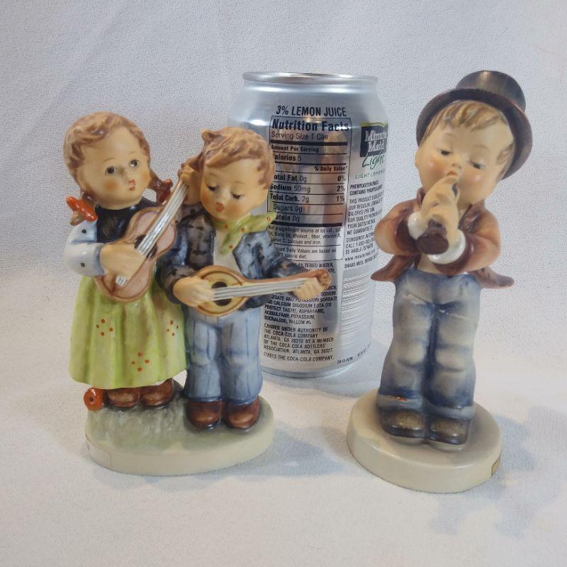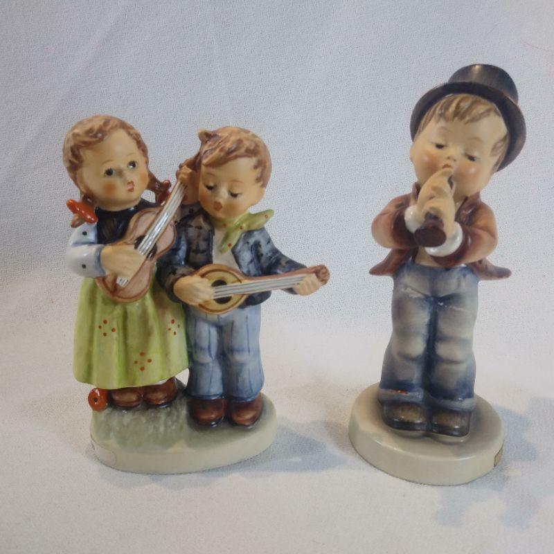 Two beautiful Hummel figurines. The boy is "Serenade" and measures 5-inches tall X 2 1/2-inches wide. The couple is "Happy Days" - signed Regi. They measure 4 1/2-inches tall X 3 3/4-inches wide. Both figurines are in very good condition.