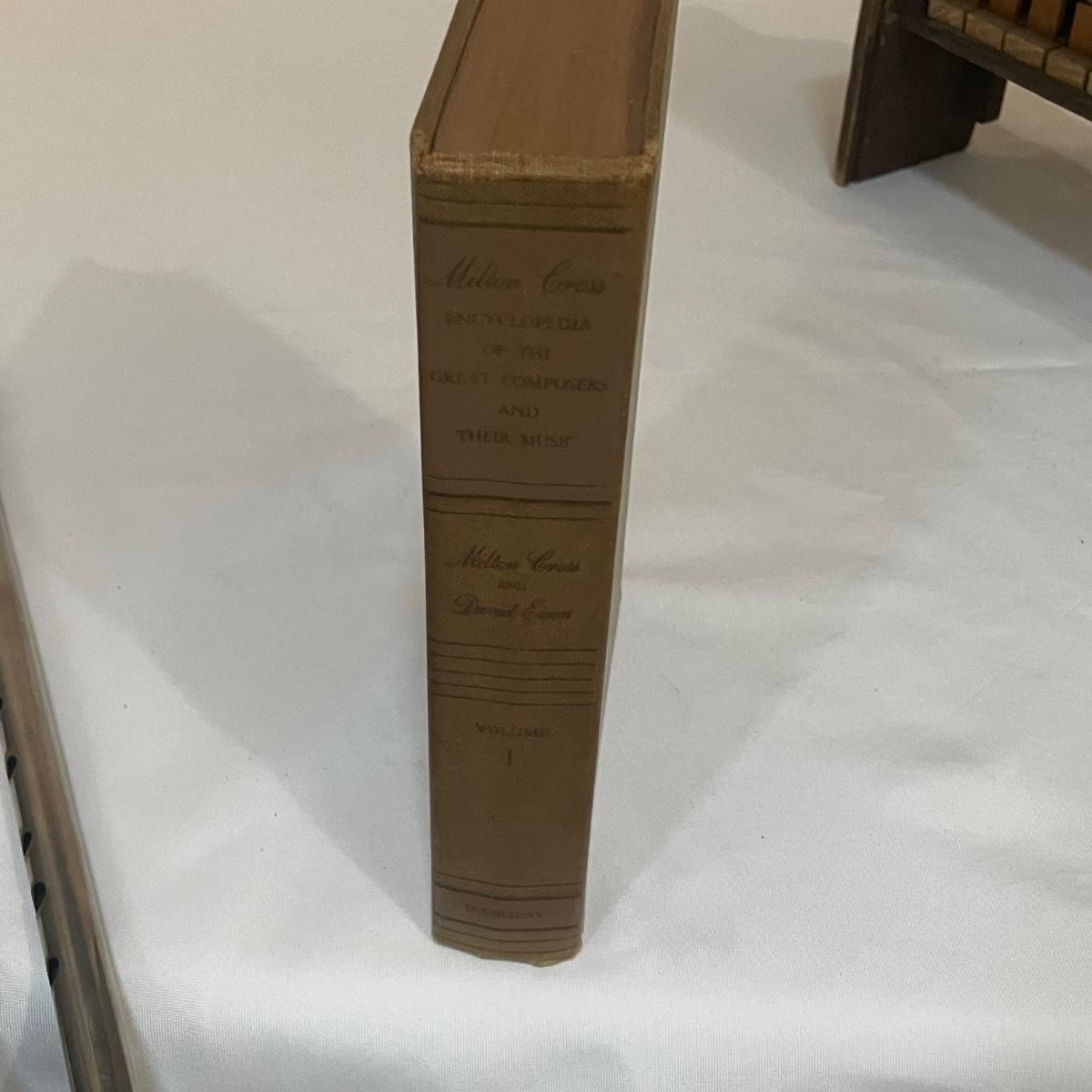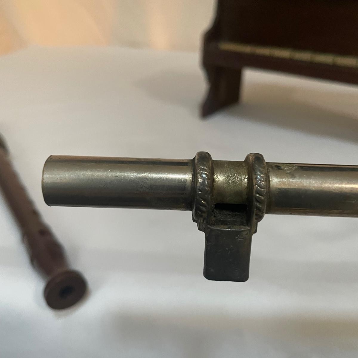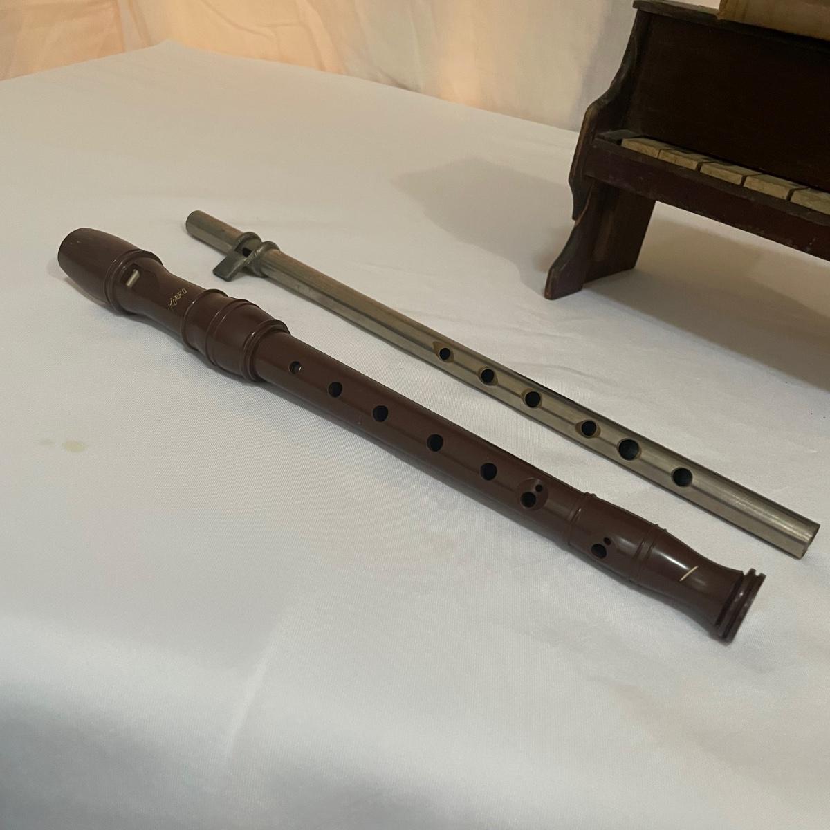 This musical assortment includes a currently not working plastic metronome which is possibly over wound, metal flute, plastic recorder, a lovely wood/metal tambourine, a unique miniature piano with a split in the wood and not all the keys make notes as they are missing pieces, see images, it measures 9” x 5” x 7”. Lot also includes a Hohner International Harmonica and an Encyclopedia of the Great Composers and Their Music.