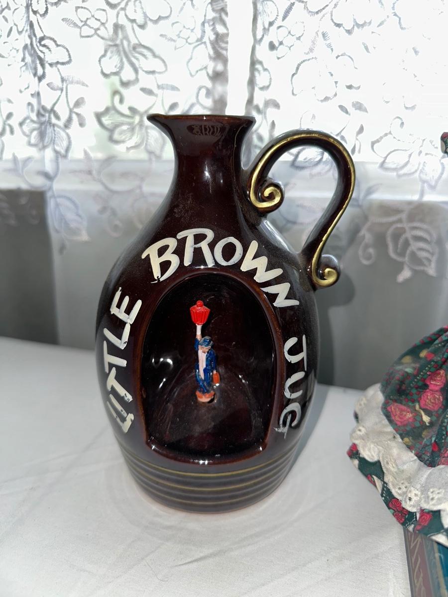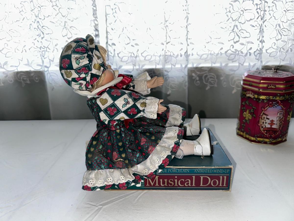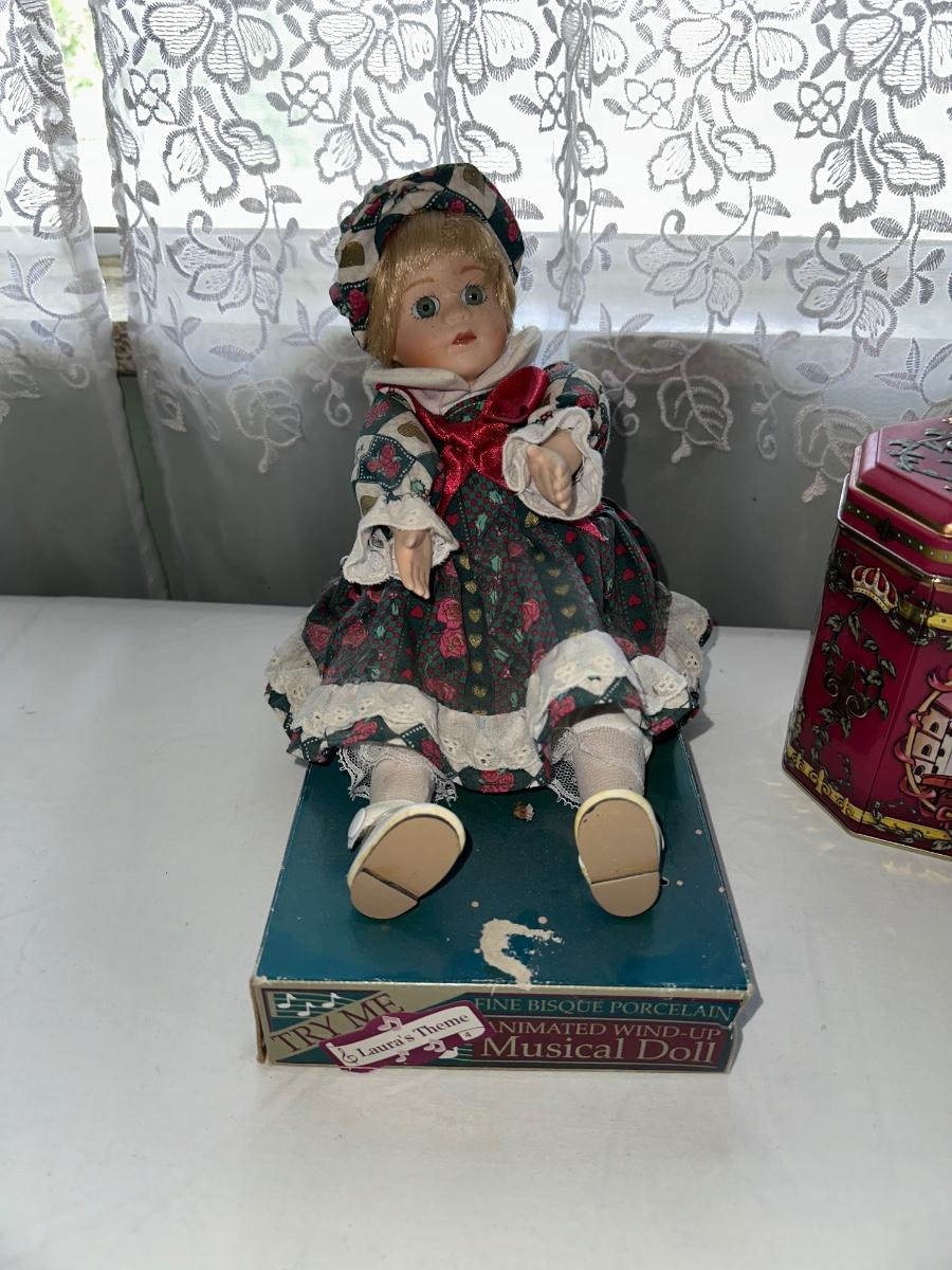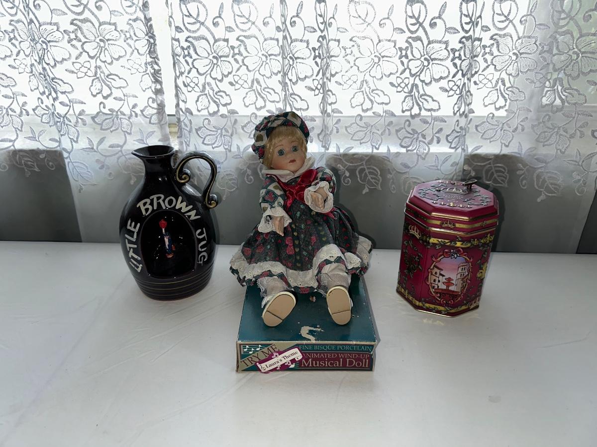 MUSICAL LITTLE BROWN JUG, DOLL AND METAL TIN