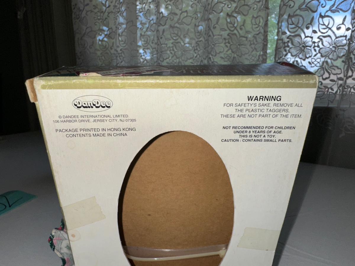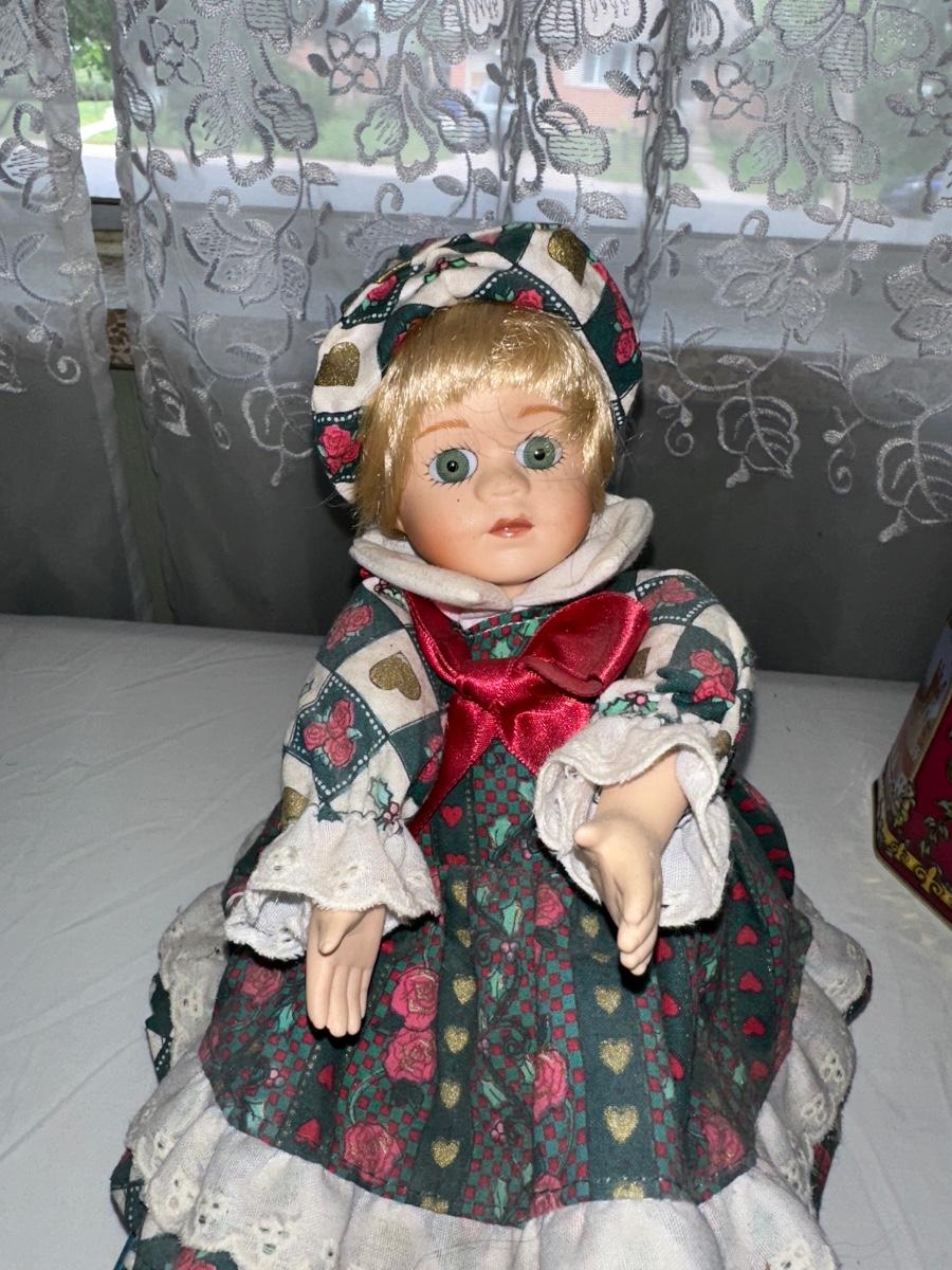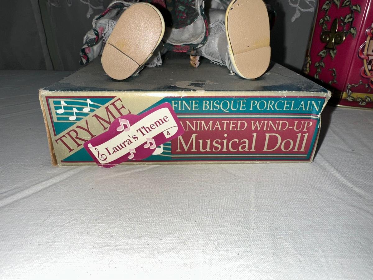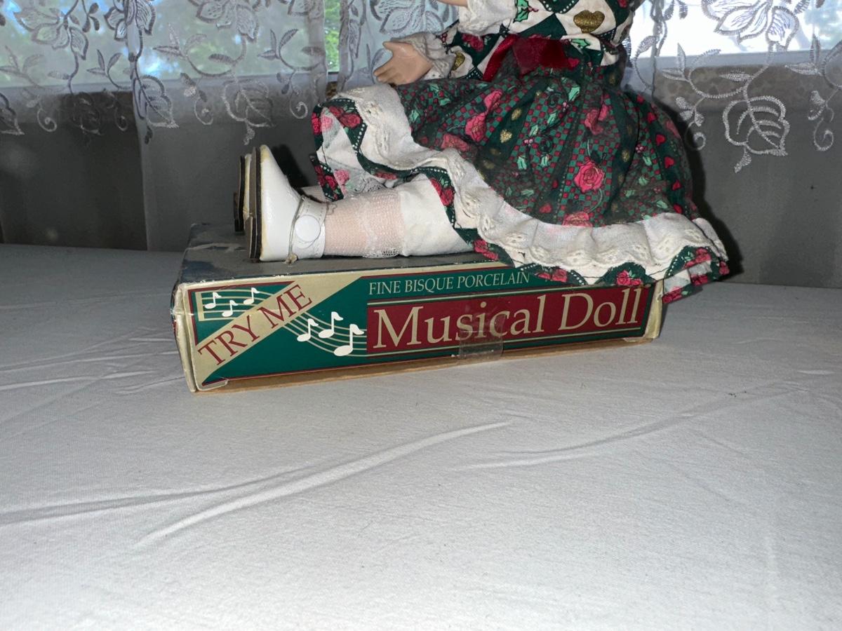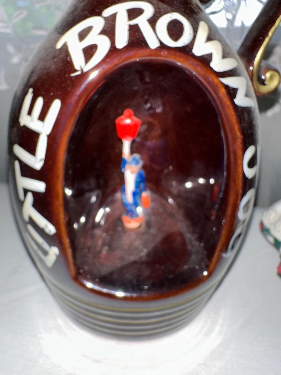MUSICAL LITTLE BROWN JUG, DOLL AND METAL TIN
