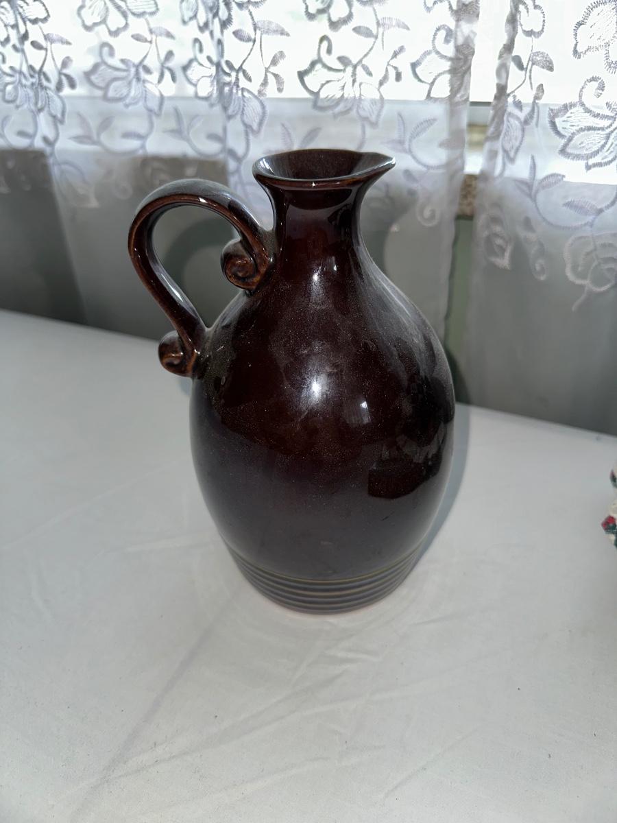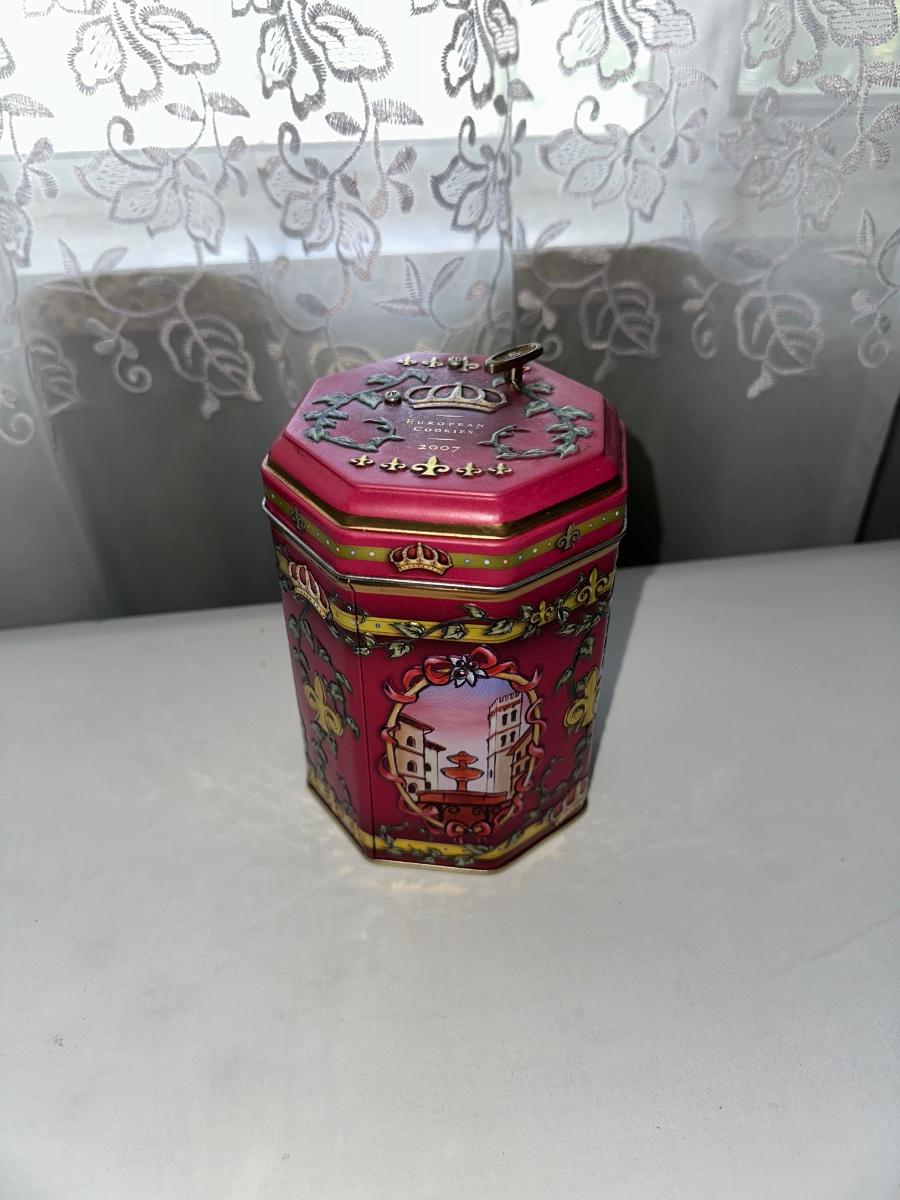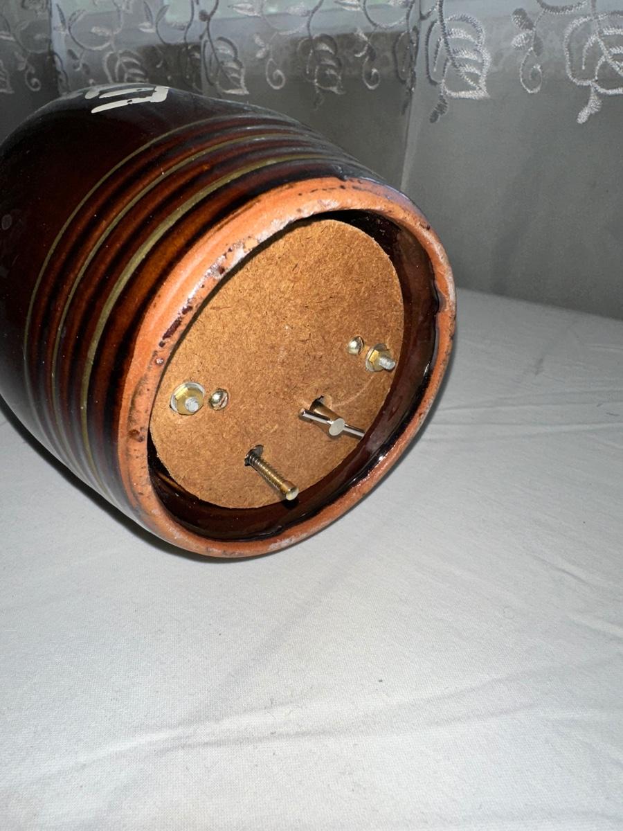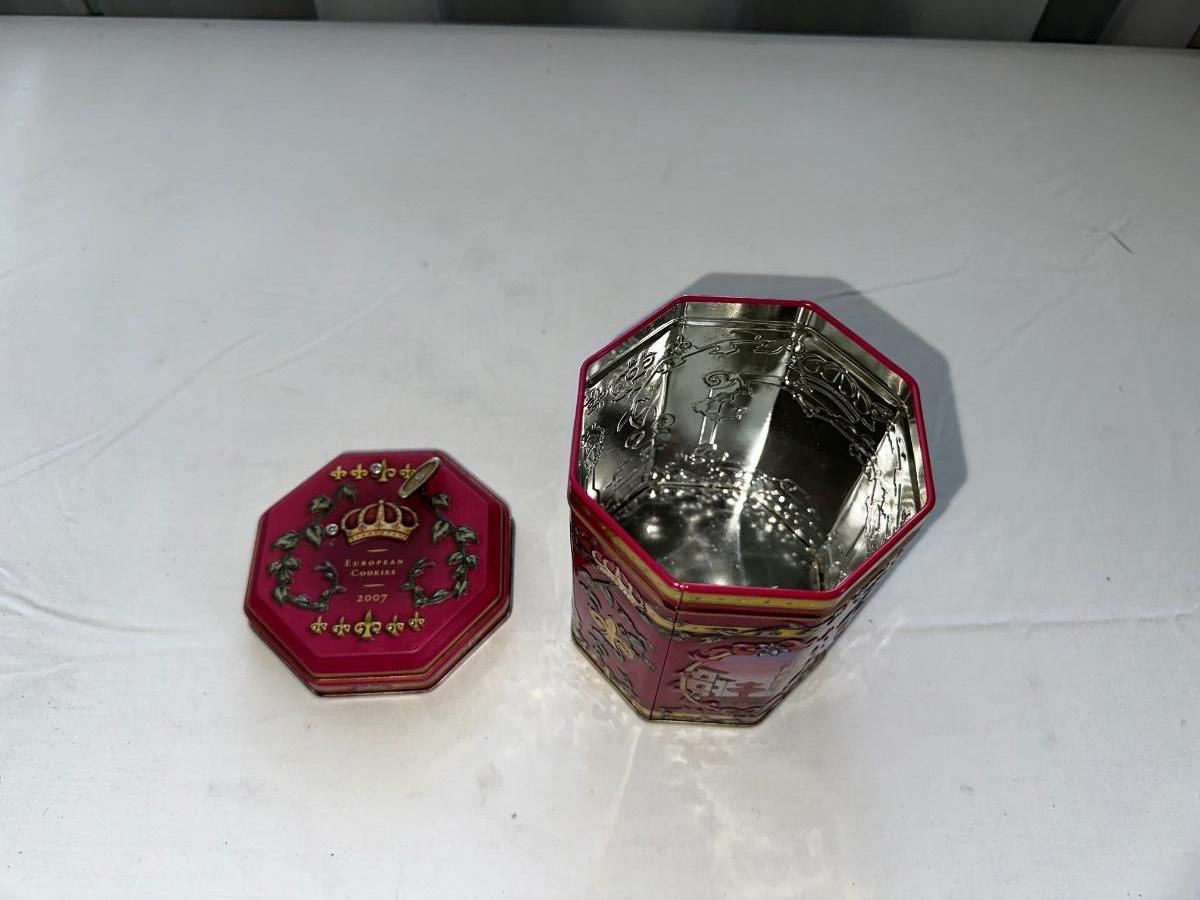 MUSICAL LITTLE BROWN JUG, DOLL AND METAL TIN