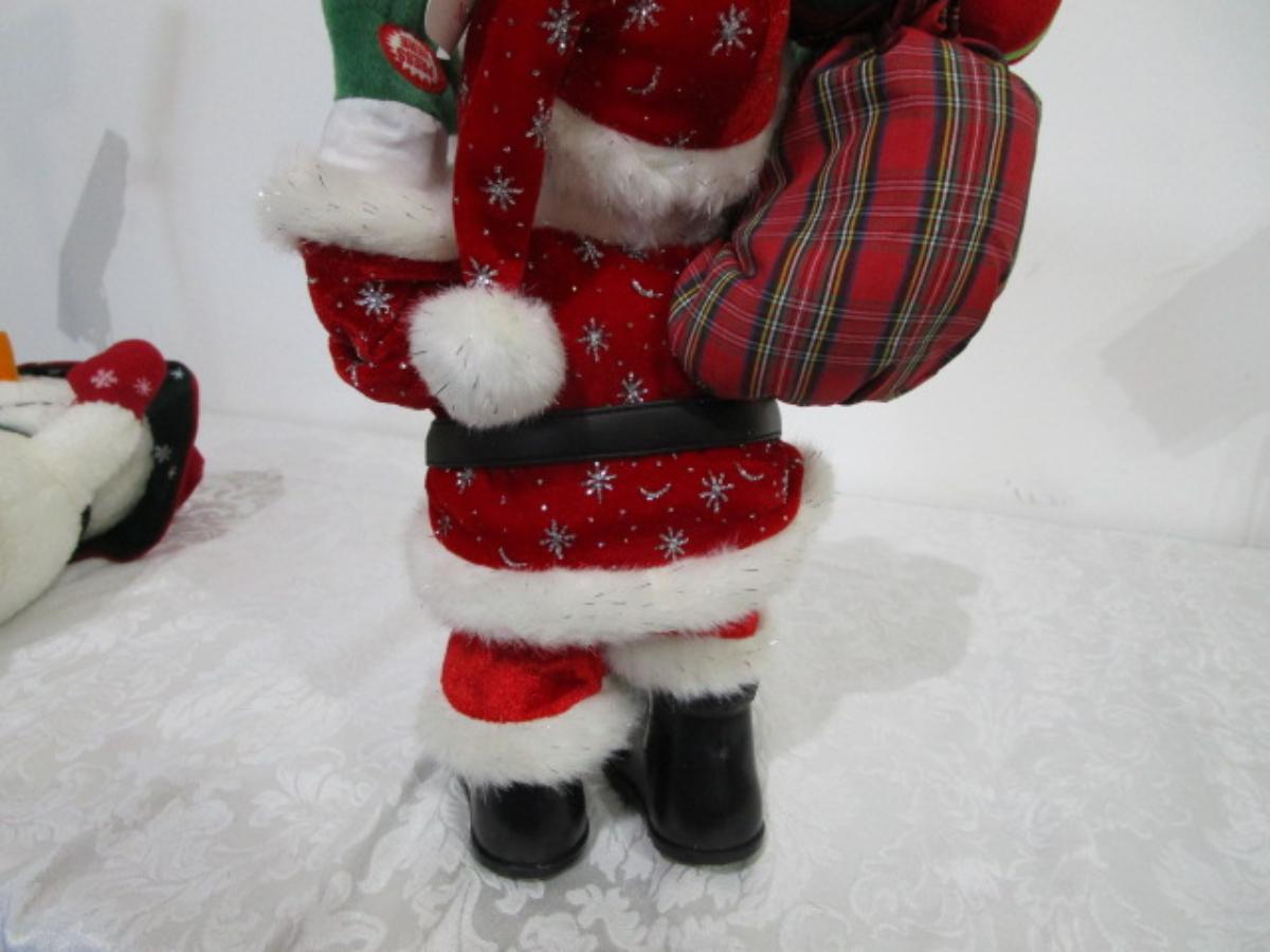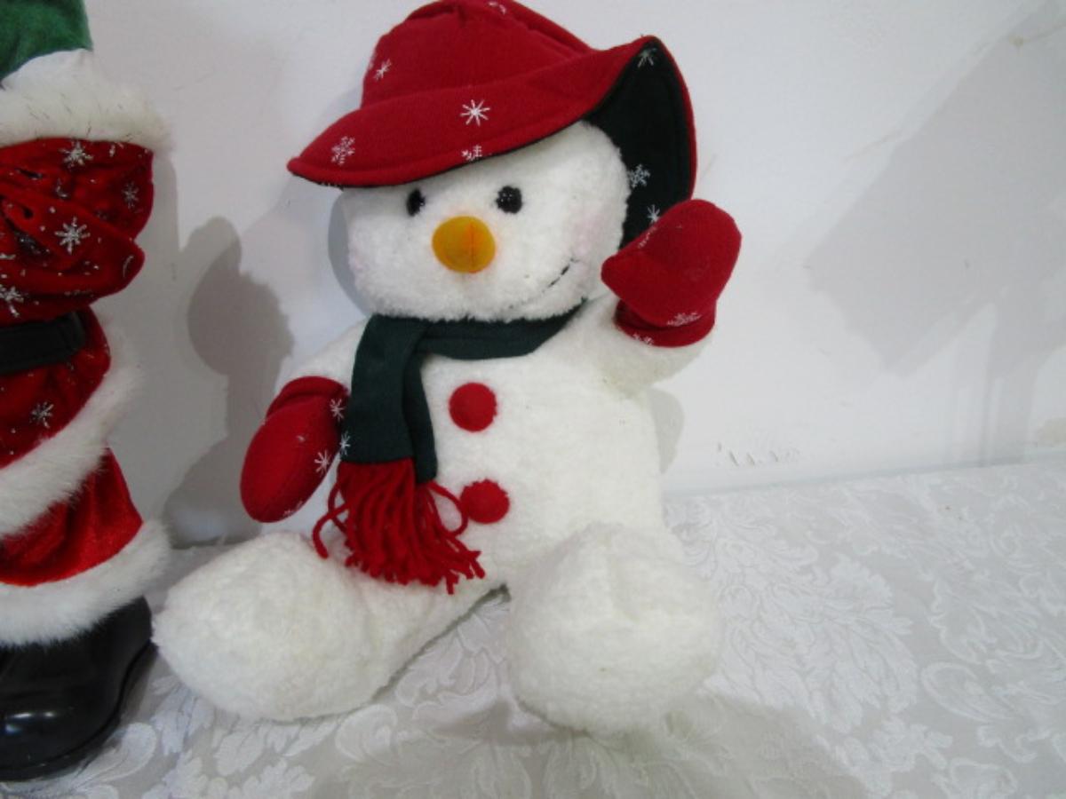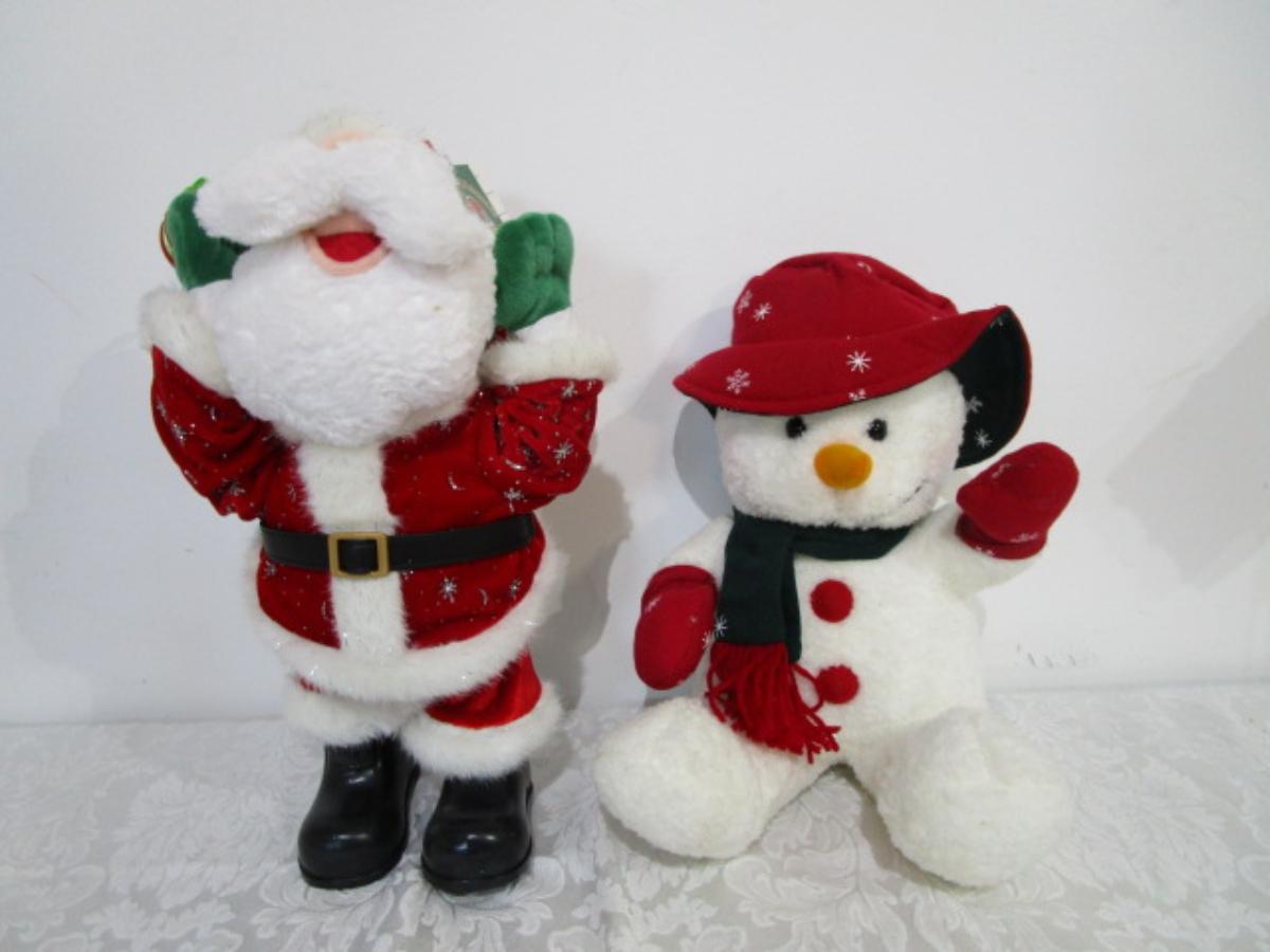 15" Snowman plays various Christmas tunes takes AA batteries not included, 14" Santa is supposed to dance, but doesn't work, but is a great decoration, E