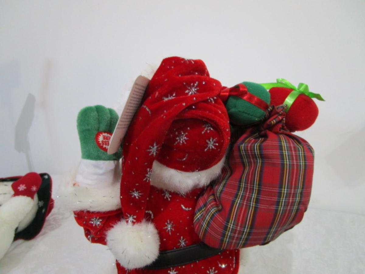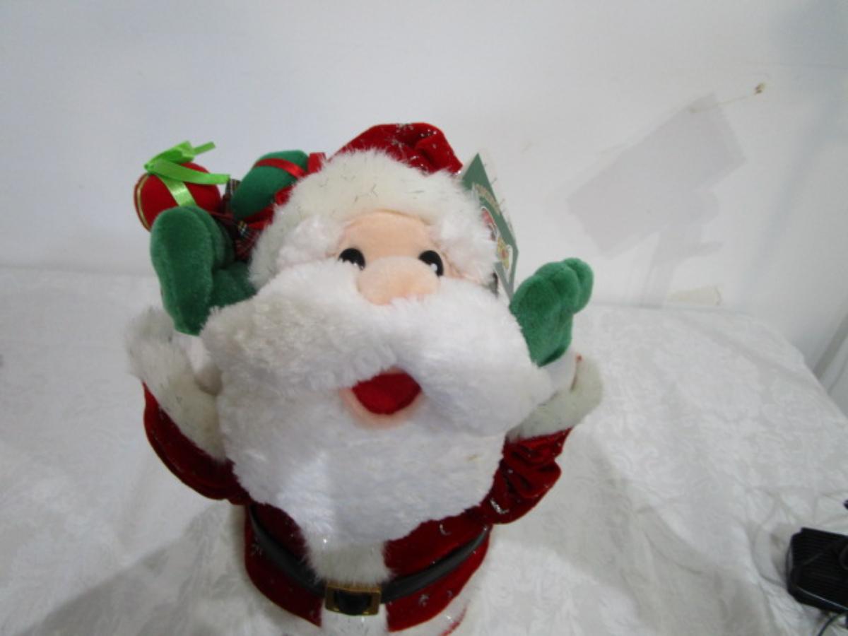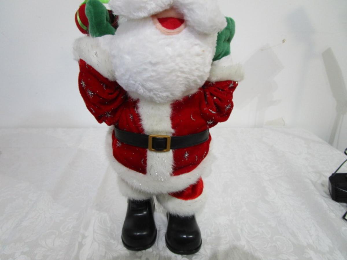 15" Snowman plays various Christmas tunes takes AA batteries not included, 14" Santa is supposed to dance, but doesn't work, but is a great decoration, E