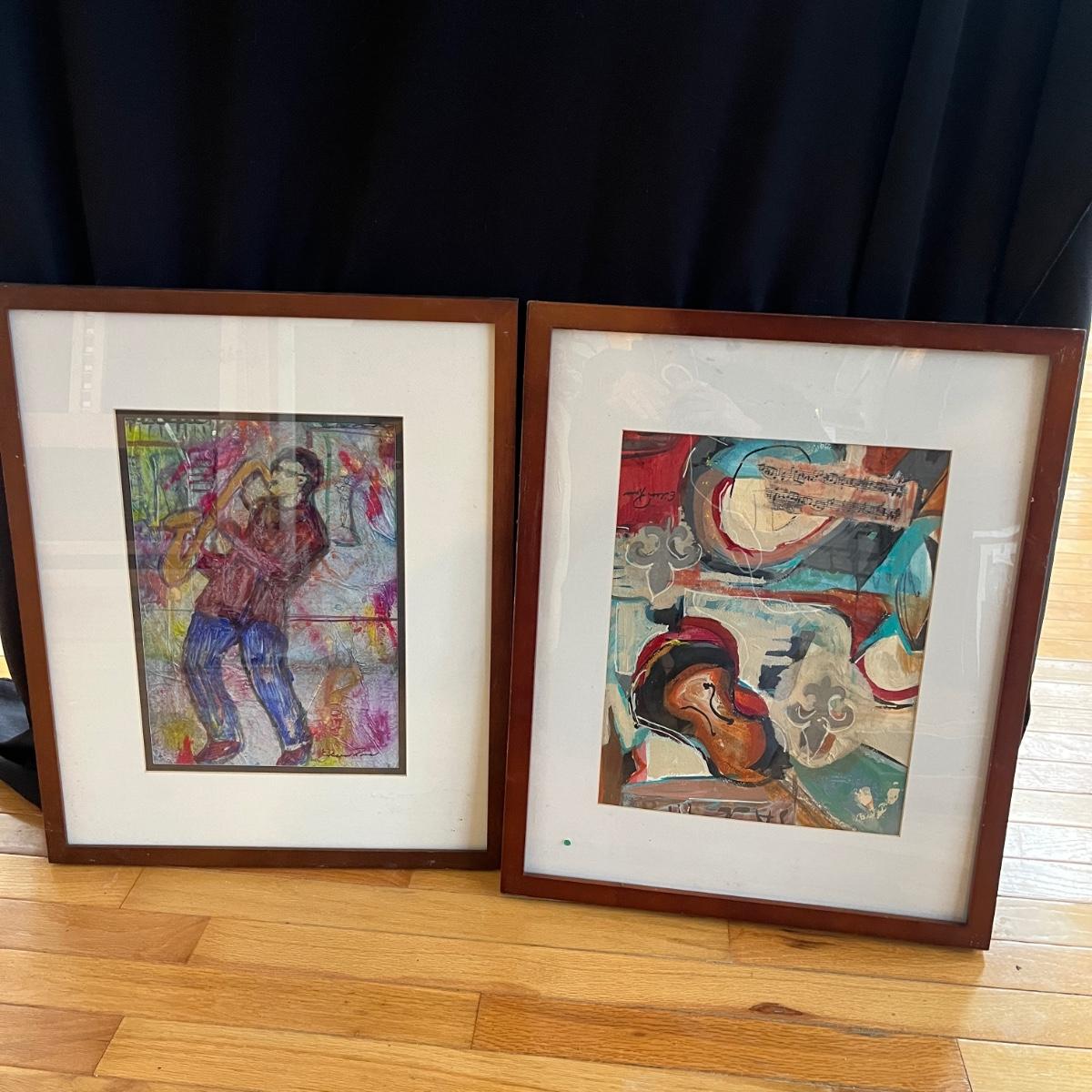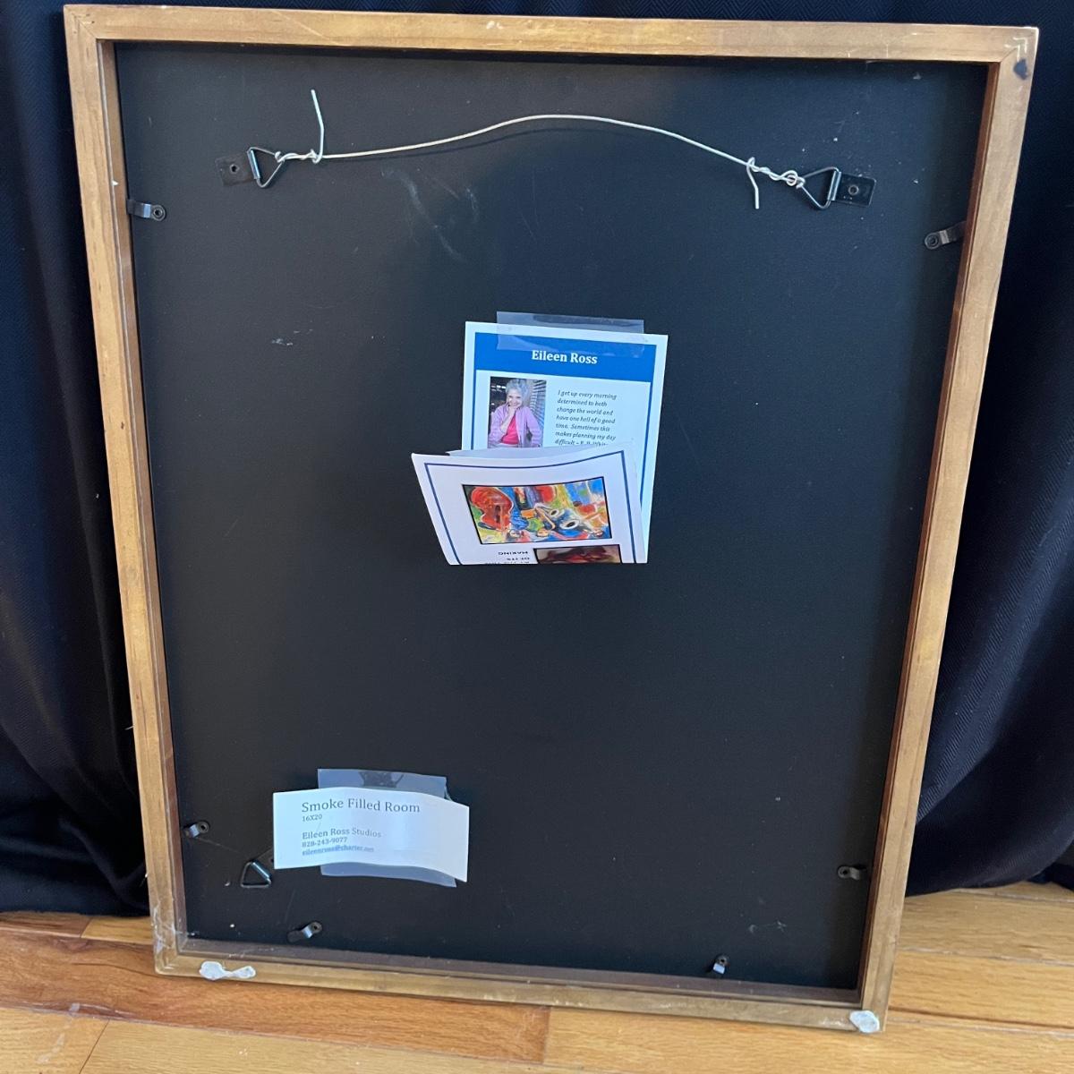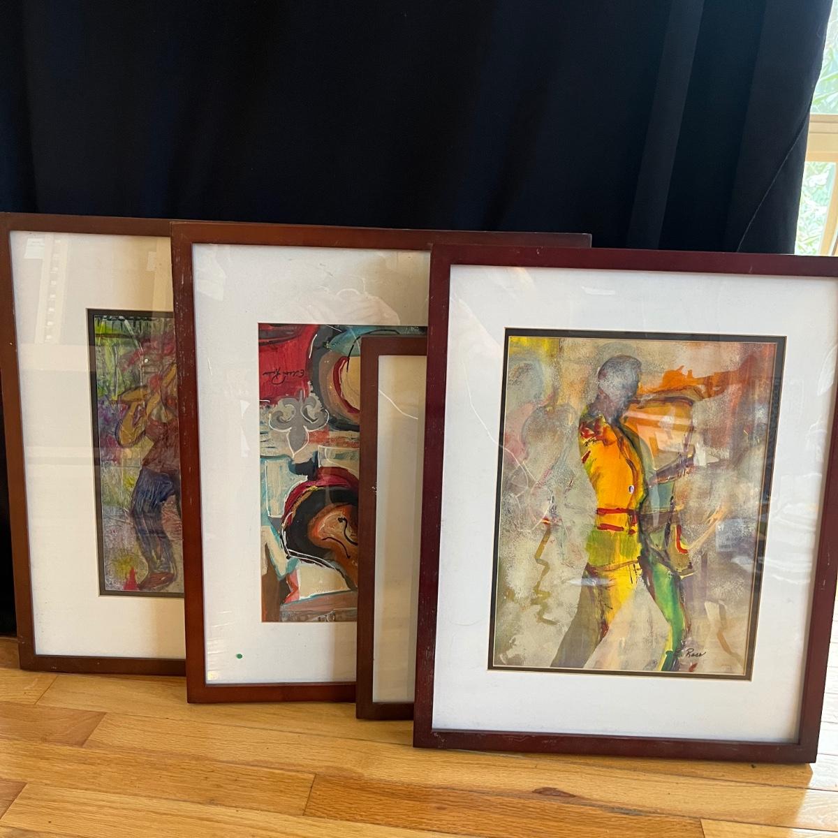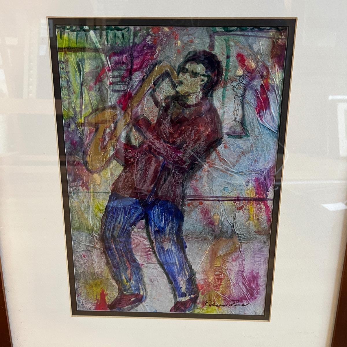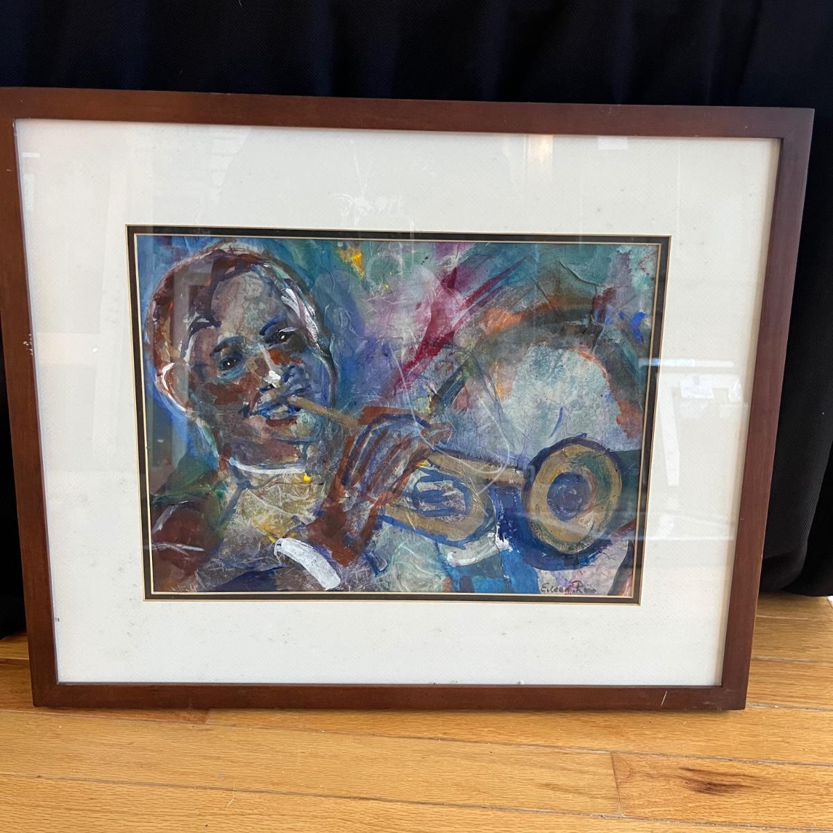 Lot contains four pieces of original art with a musical theme by Eileen Ross. Pieces are titled Smoke Filled Room, Traveling the Blues, Tangerine Blues and Blow Gabriel Blow. Art is in wooden frame under glass. Three of the frames measure 17” x 20”. Blow Gabriel has spots on the matting, see pictures.