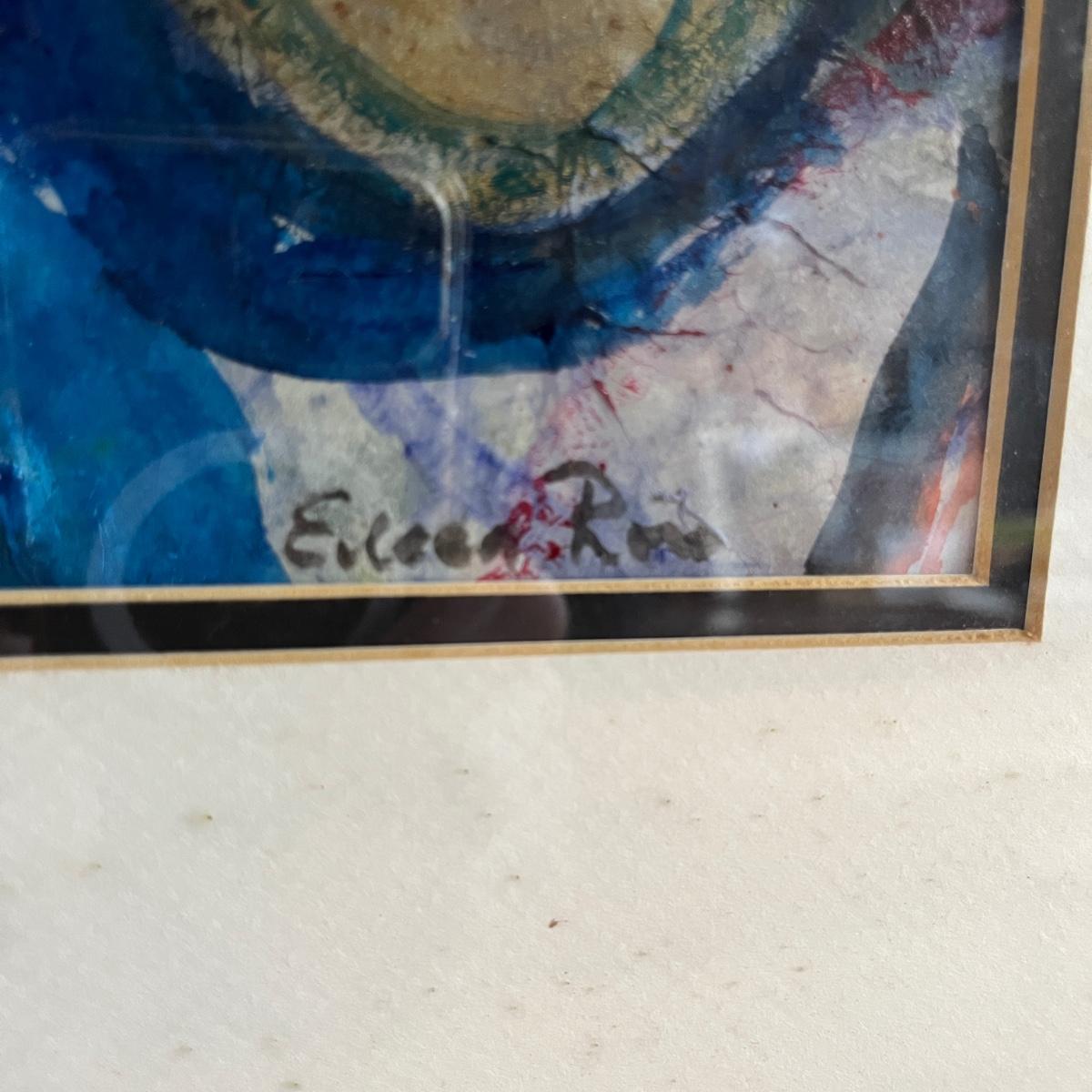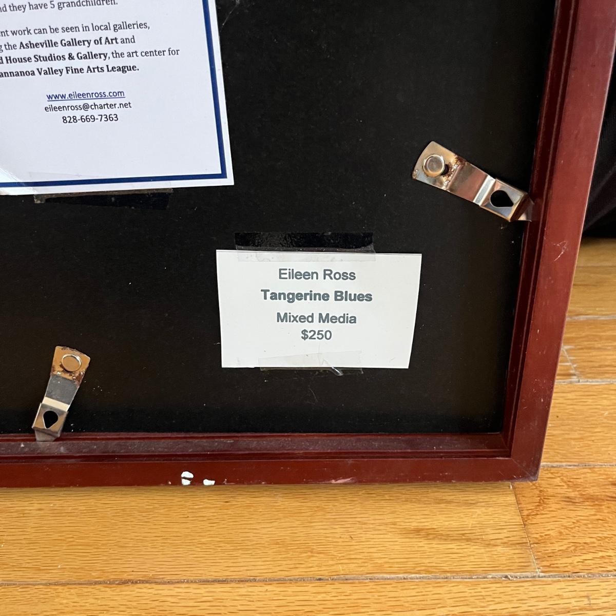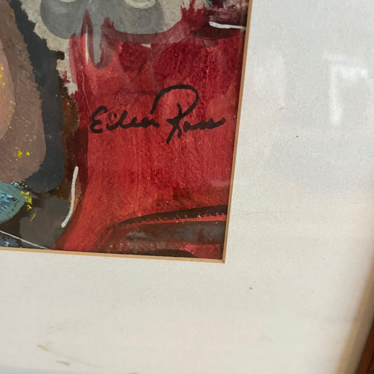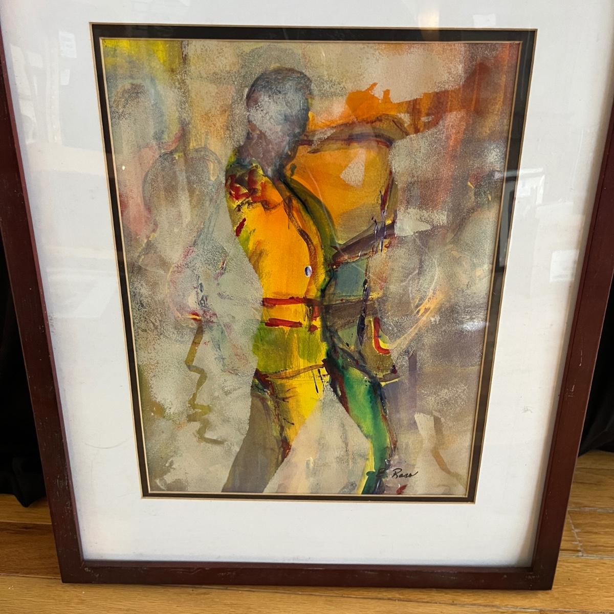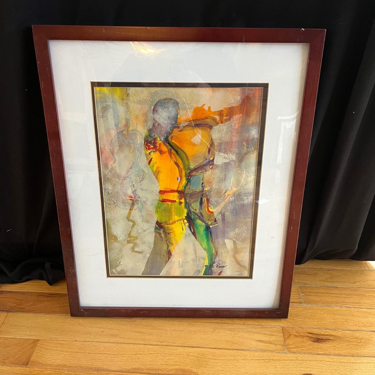 Lot contains four pieces of original art with a musical theme by Eileen Ross. Pieces are titled Smoke Filled Room, Traveling the Blues, Tangerine Blues and Blow Gabriel Blow. Art is in wooden frame under glass. Three of the frames measure 17” x 20”. Blow Gabriel has spots on the matting, see pictures.