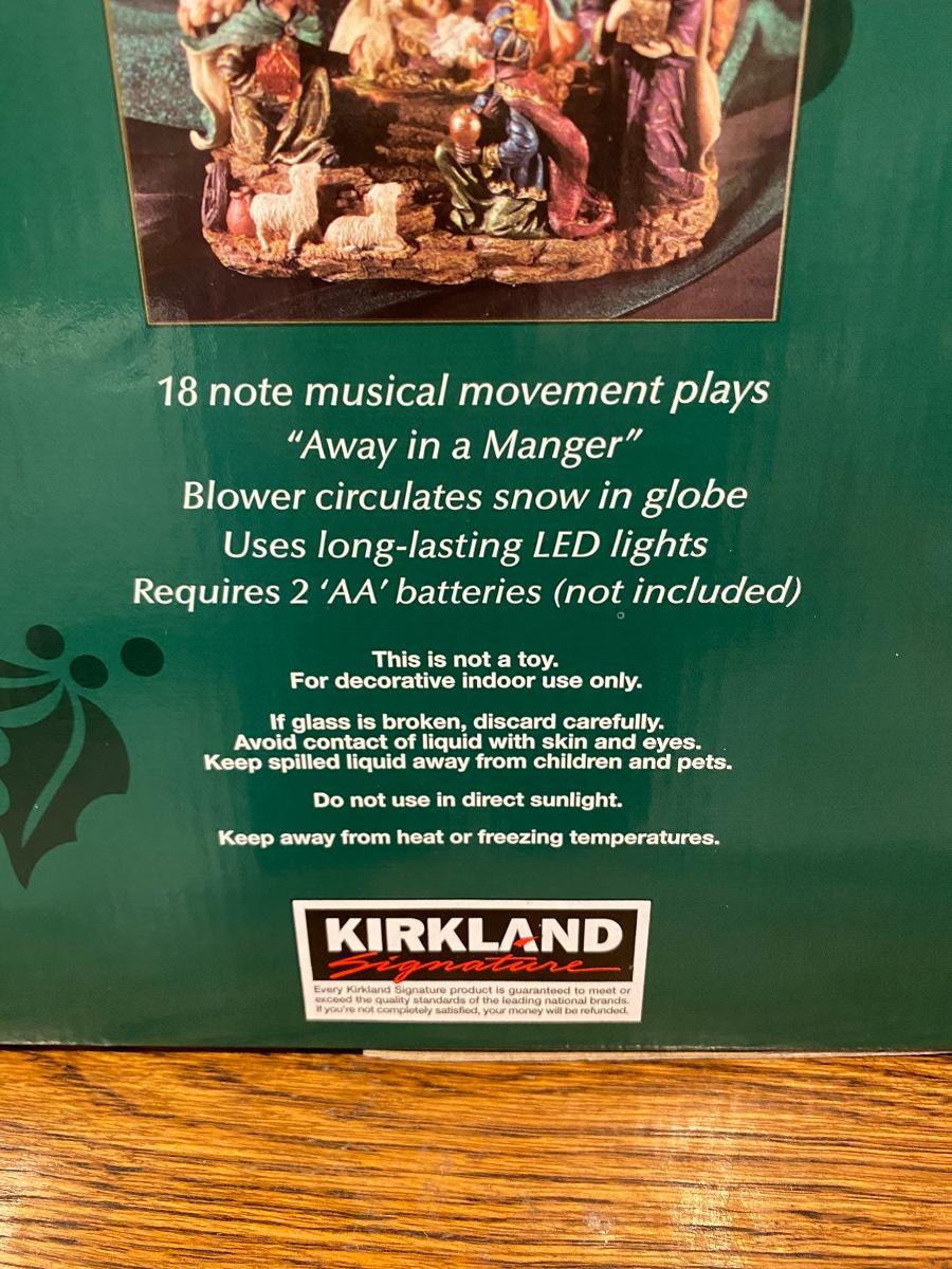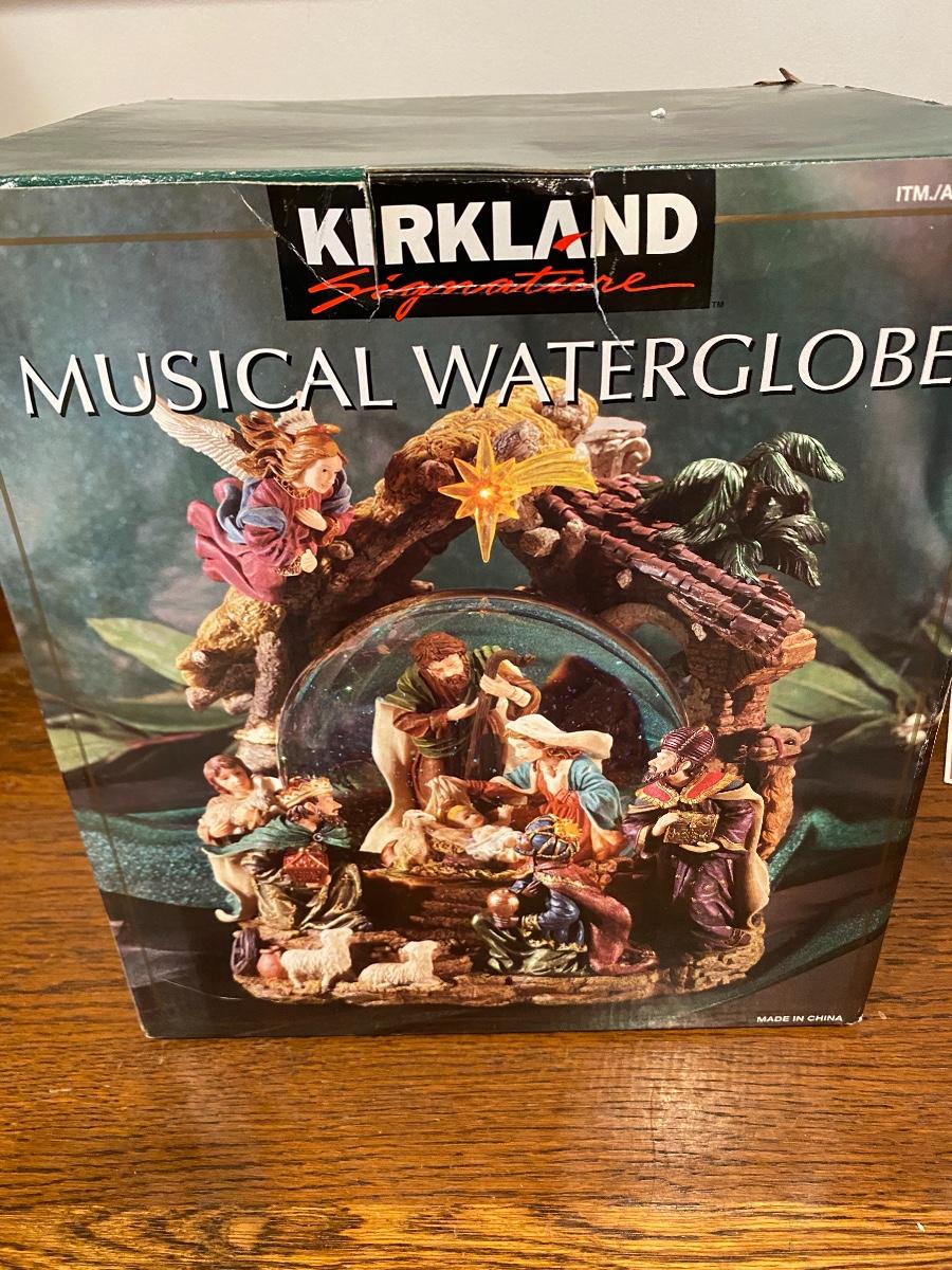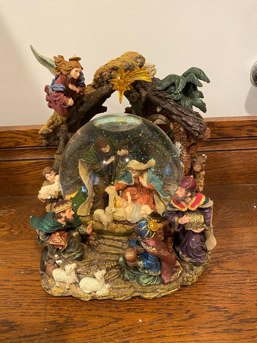 Musical water globe nativity scene music box. Plays away in the manger. Takes two AA batteries to light up and make the snow blow around globe. Box has damage but inside is good protected with Styrofoam. Very heavy.