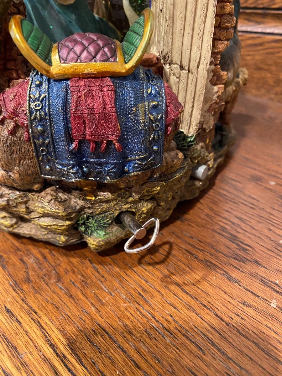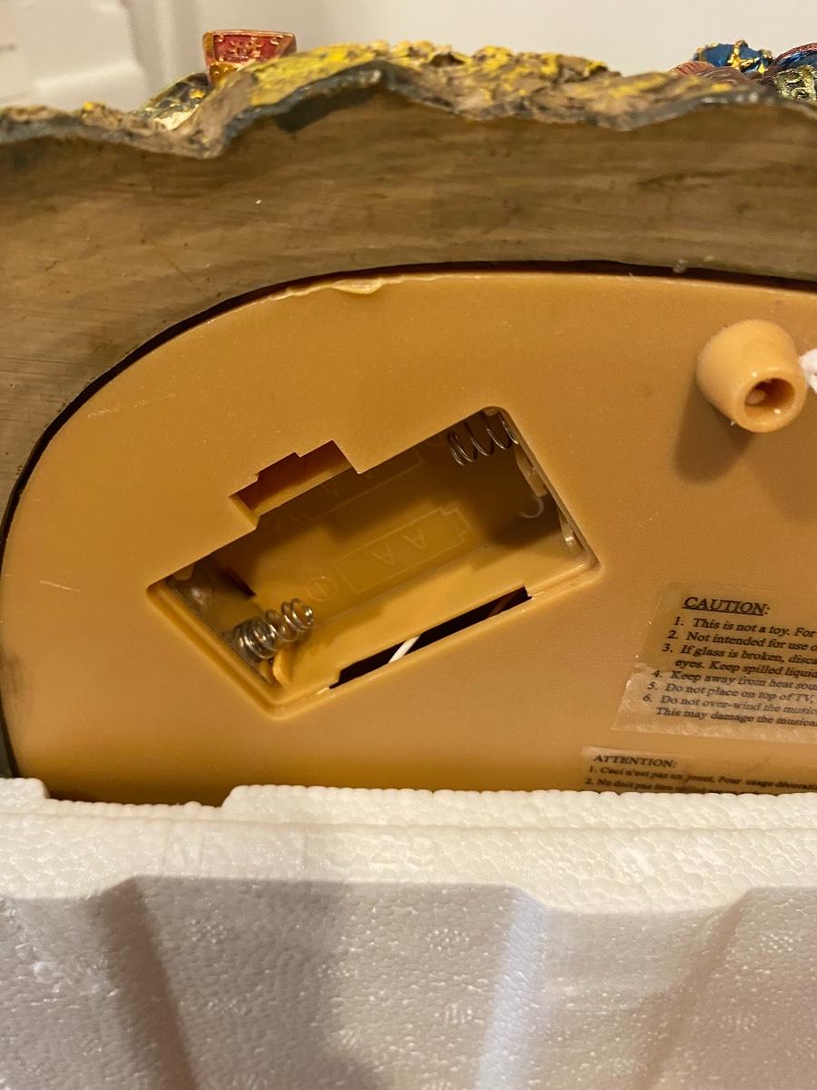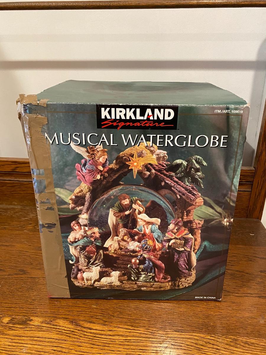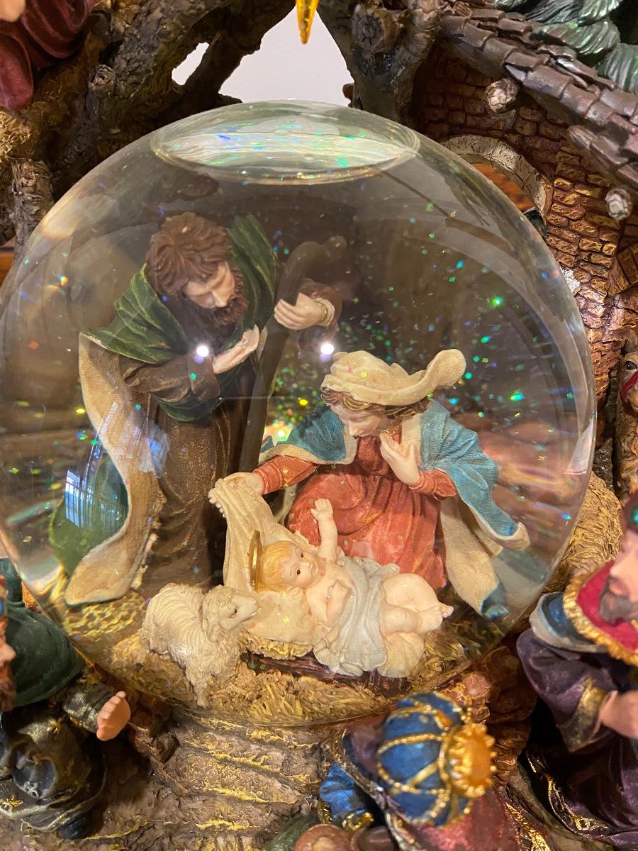 Musical water globe nativity scene music box. Plays away in the manger. Takes two AA batteries to light up and make the snow blow around globe. Box has damage but inside is good protected with Styrofoam. Very heavy.