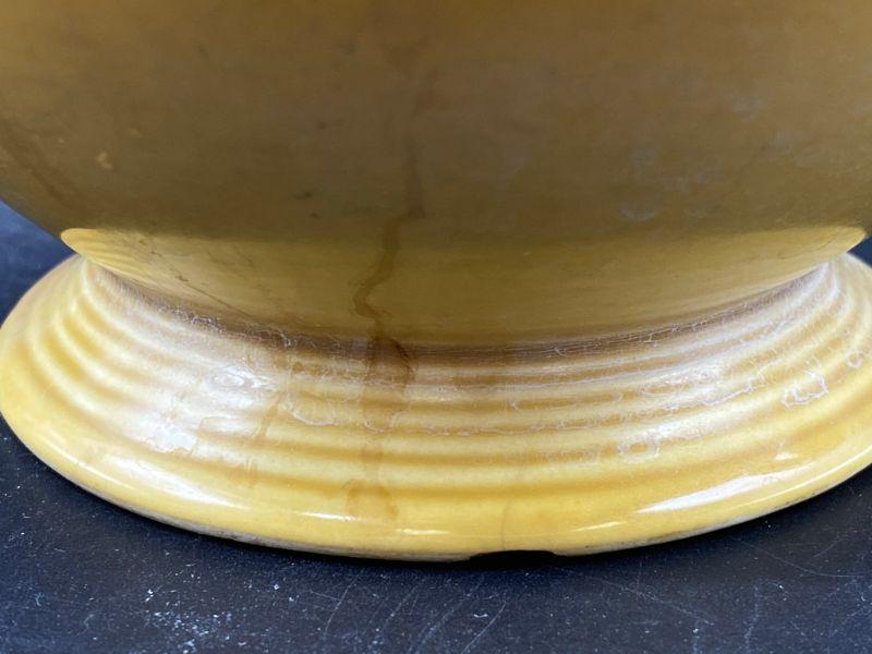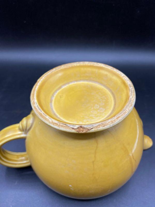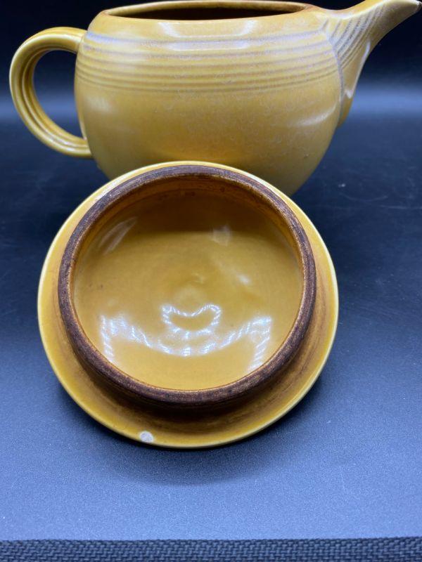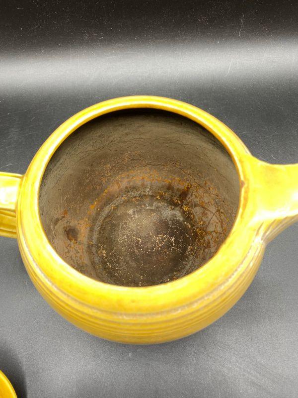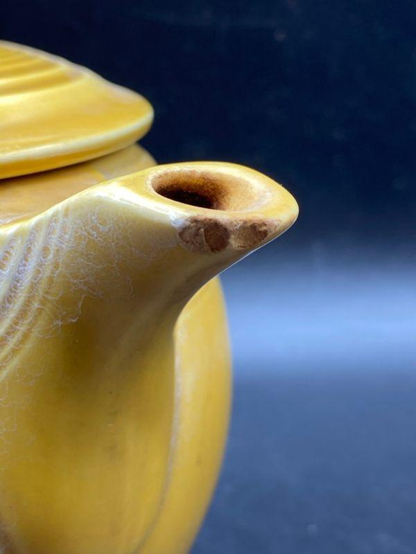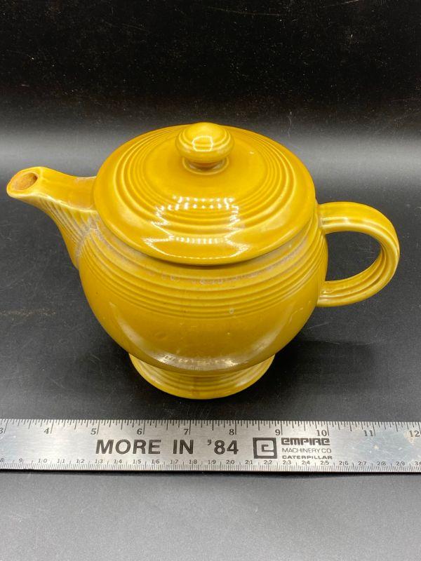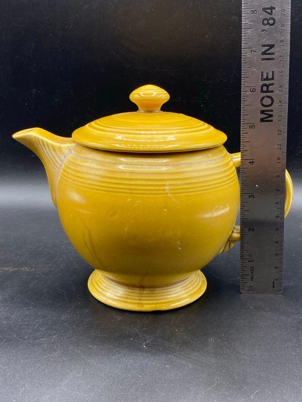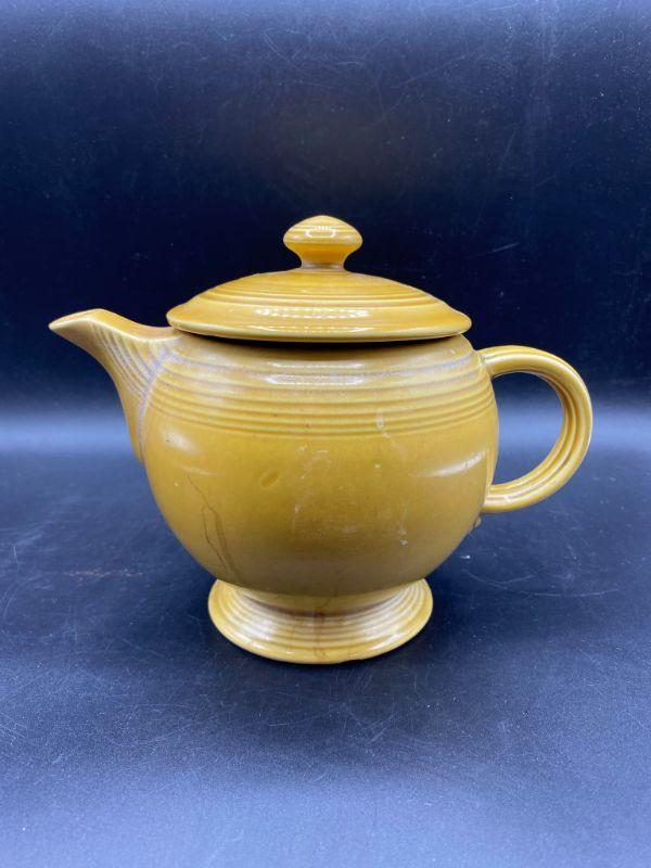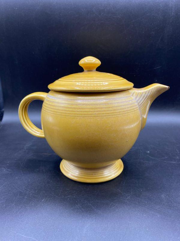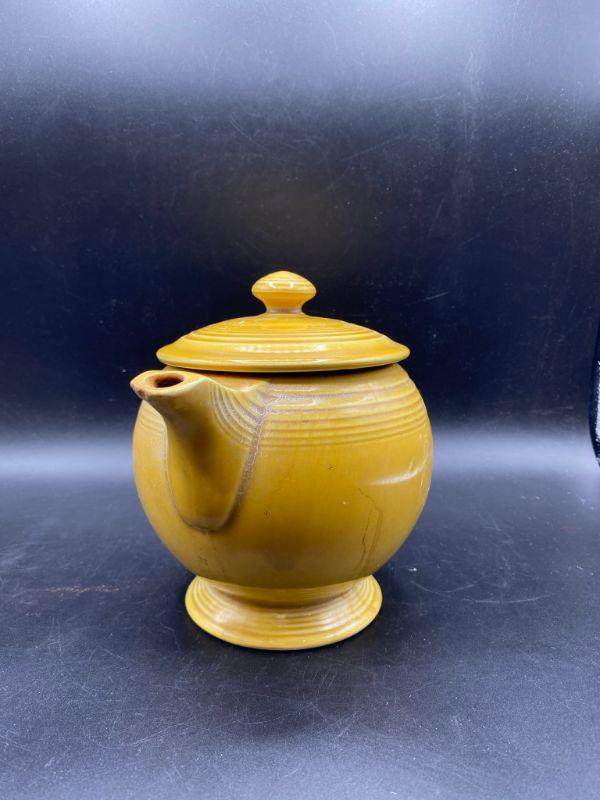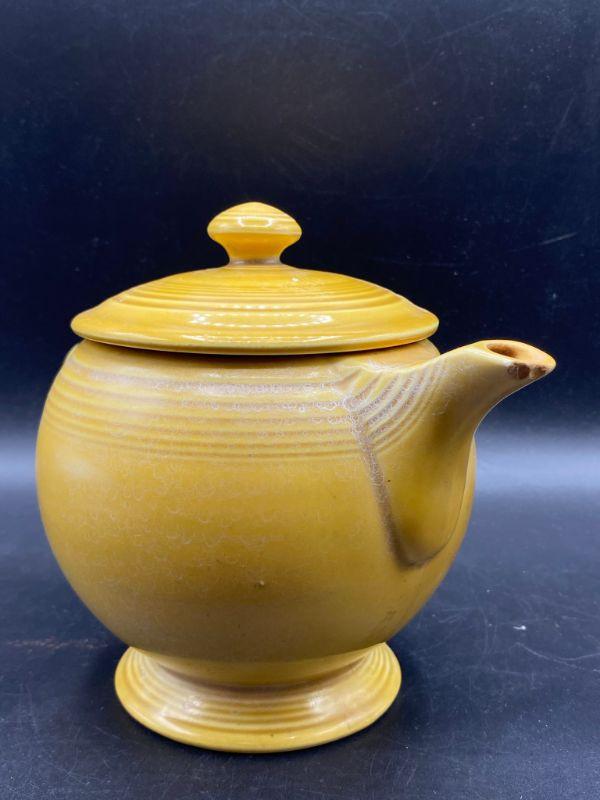Speckled mustard yellow tea pot. Rippled pottery texture. Unmarked, possibly early Franciscan or Fiesta Ware. Displays nicely. Does have a couple small chips. Stands about 6" tall.