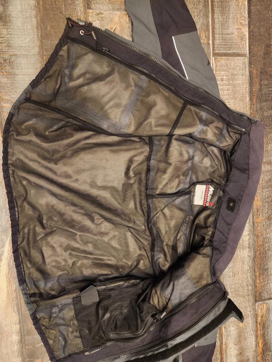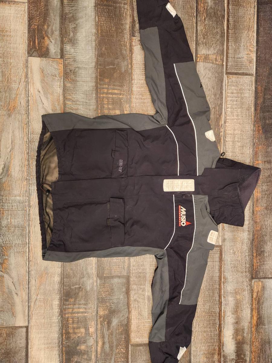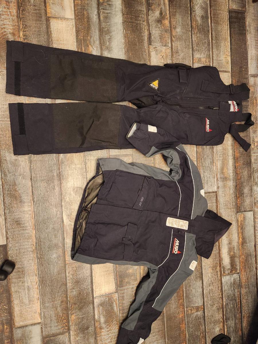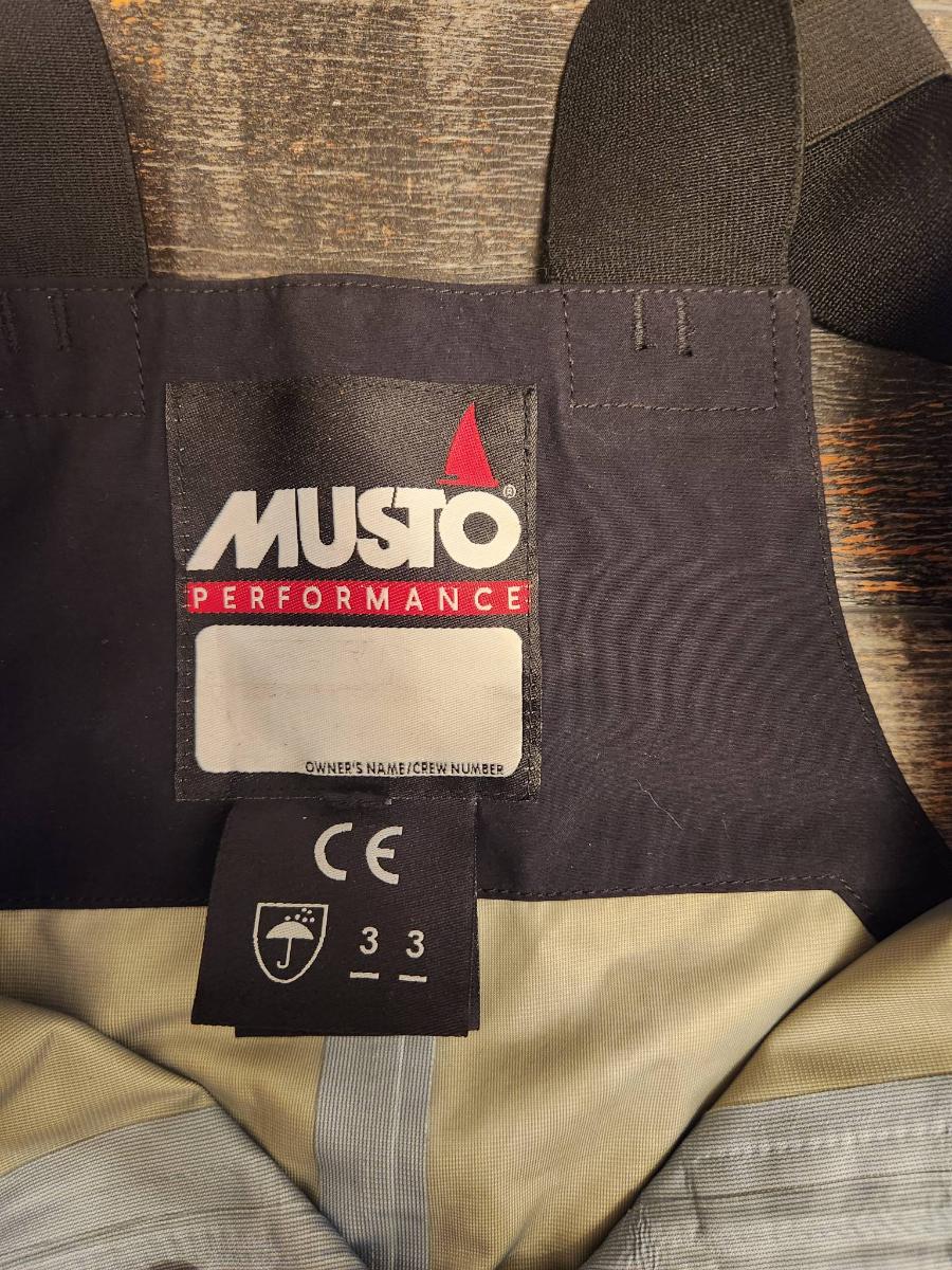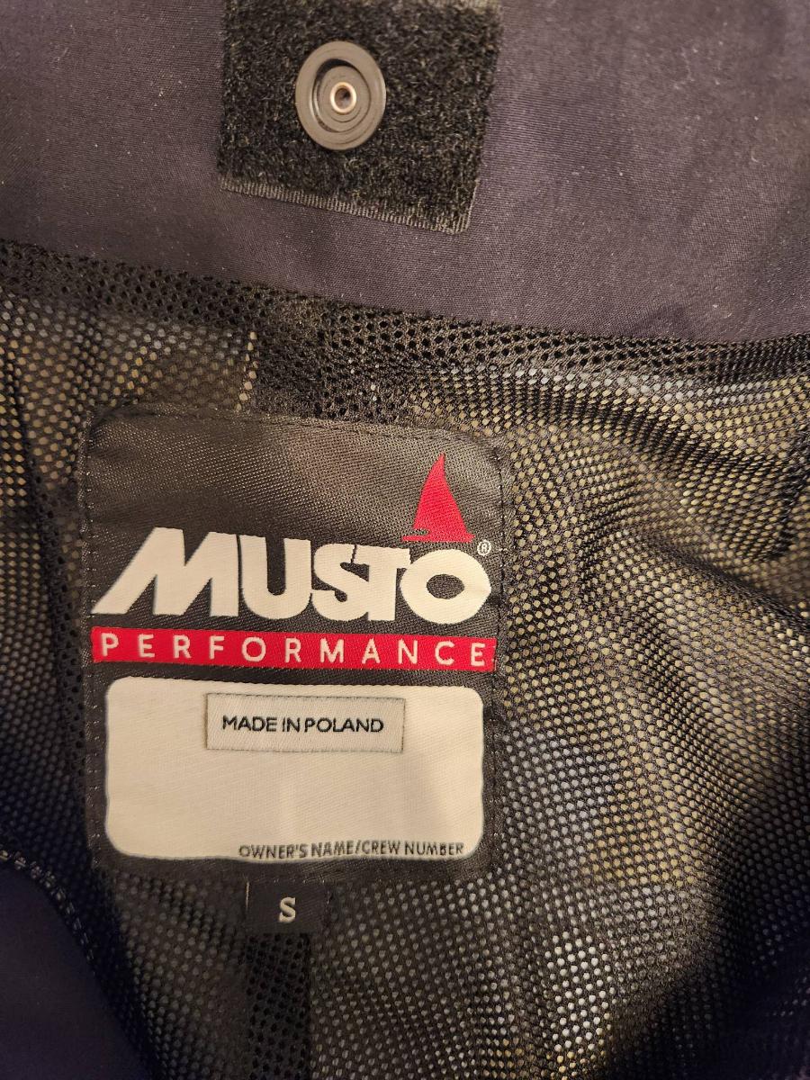 Musto Performance jacket and pants set, made in Poland. Jacket features reflective details, a hood, and multiple pockets with a mesh-lined interior. Pants include reinforced knee pads, adjustable straps, and heavy-duty construction. Both items are labeled as size S and conform to CE safety standards.