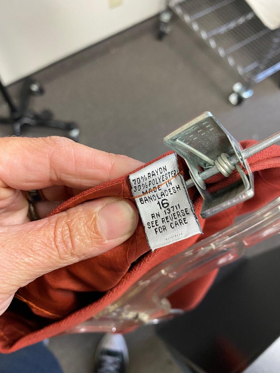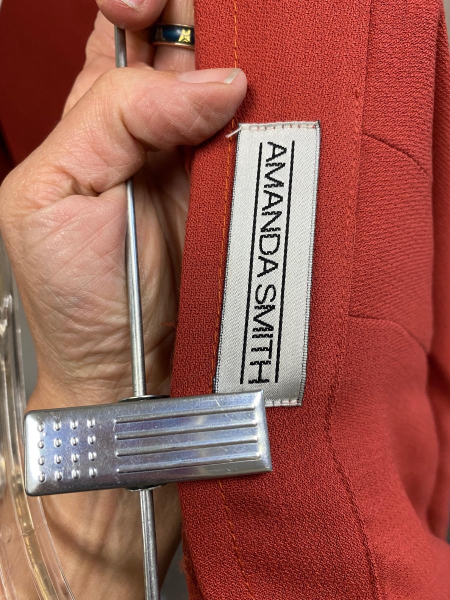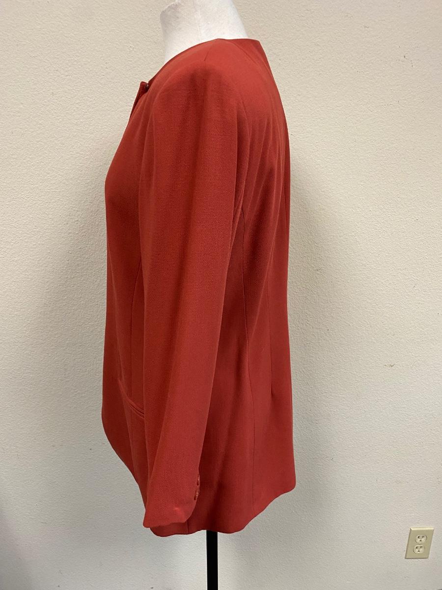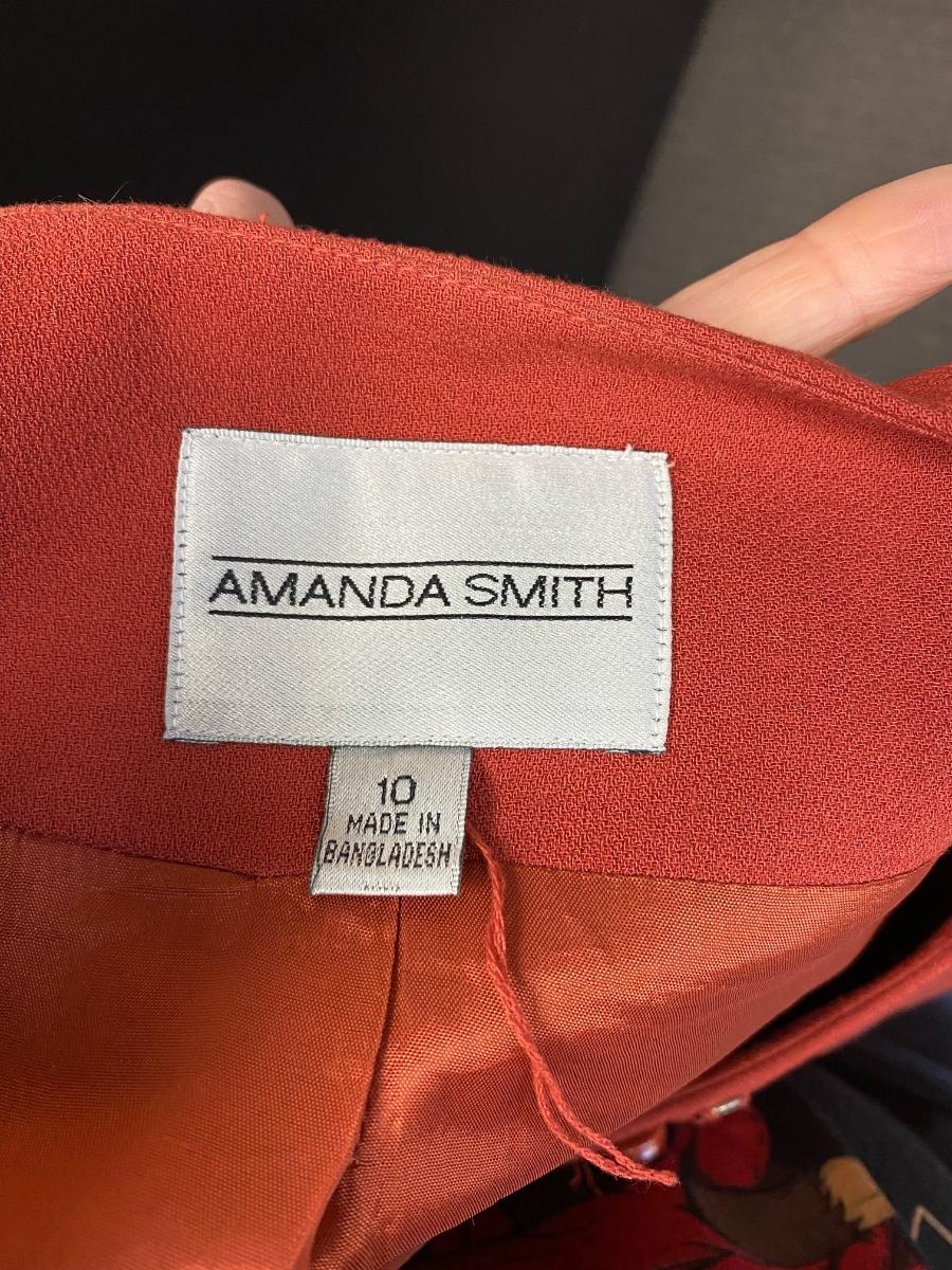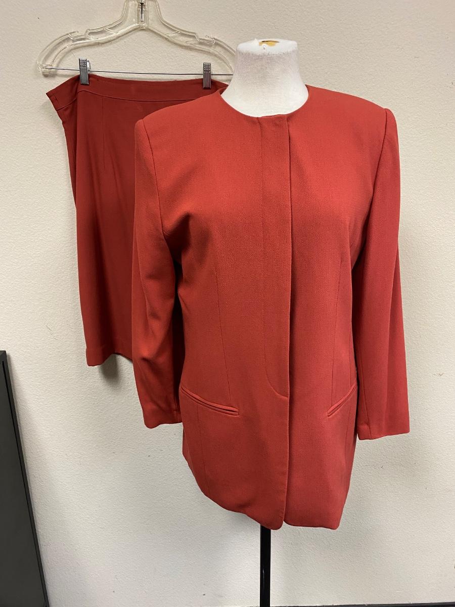 Muted Coral Red Two Piece Skirt & Suit Jacket by Amanda Smith. In good condition. The skirt is a size 16 and the jacket is a size 10. Skirt is around knee length.