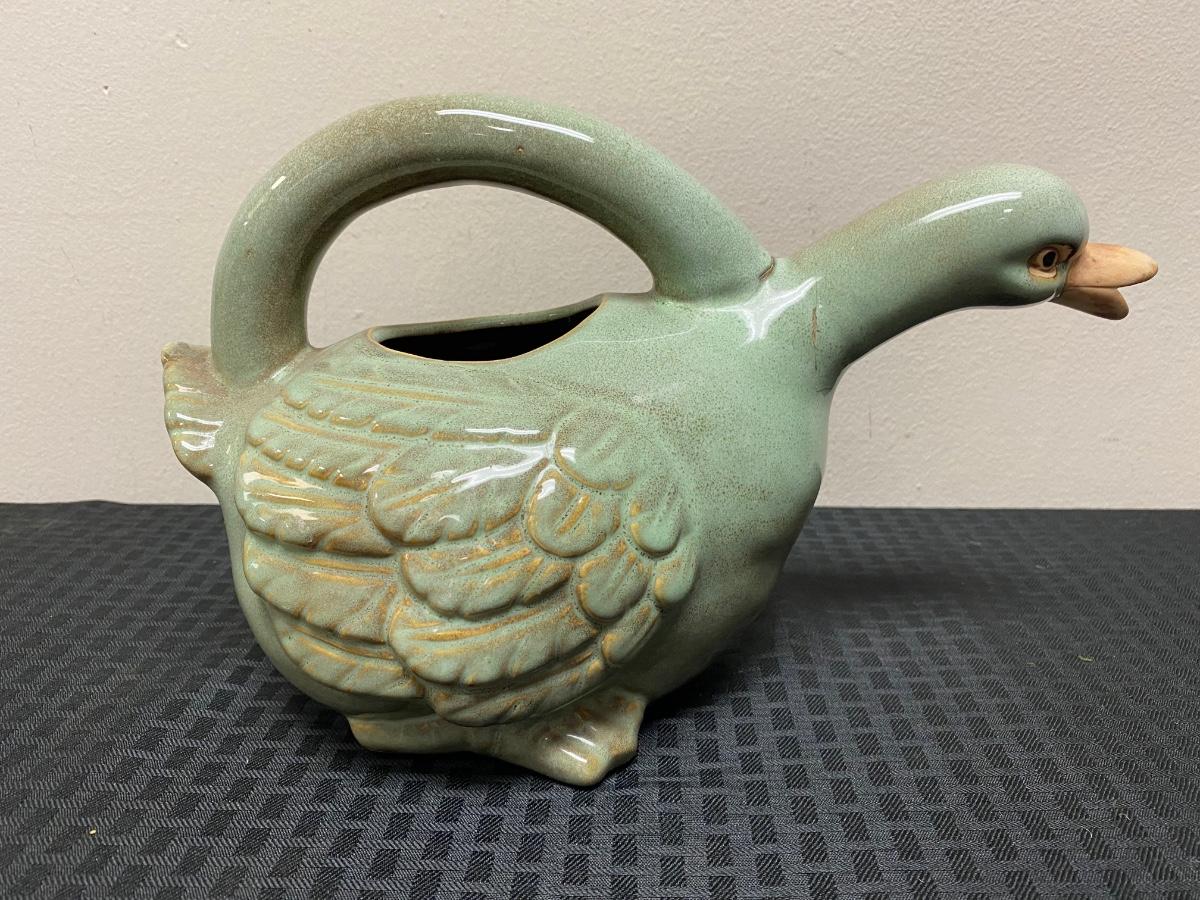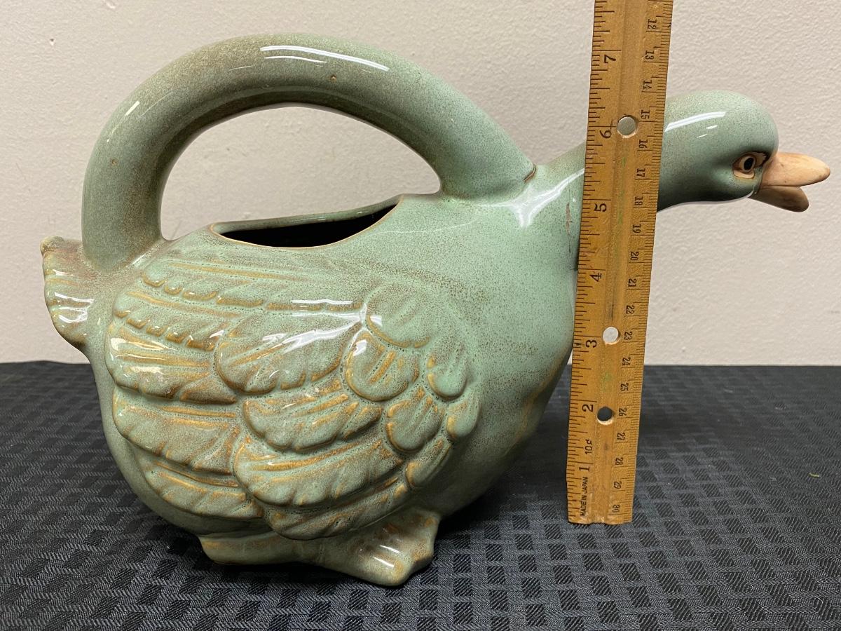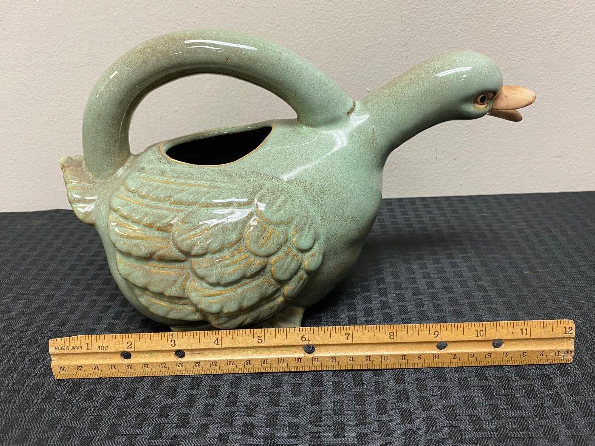 Muted Green Pottery Goose Duck Ceramic Watering Can Pitcher Yard Garden Art