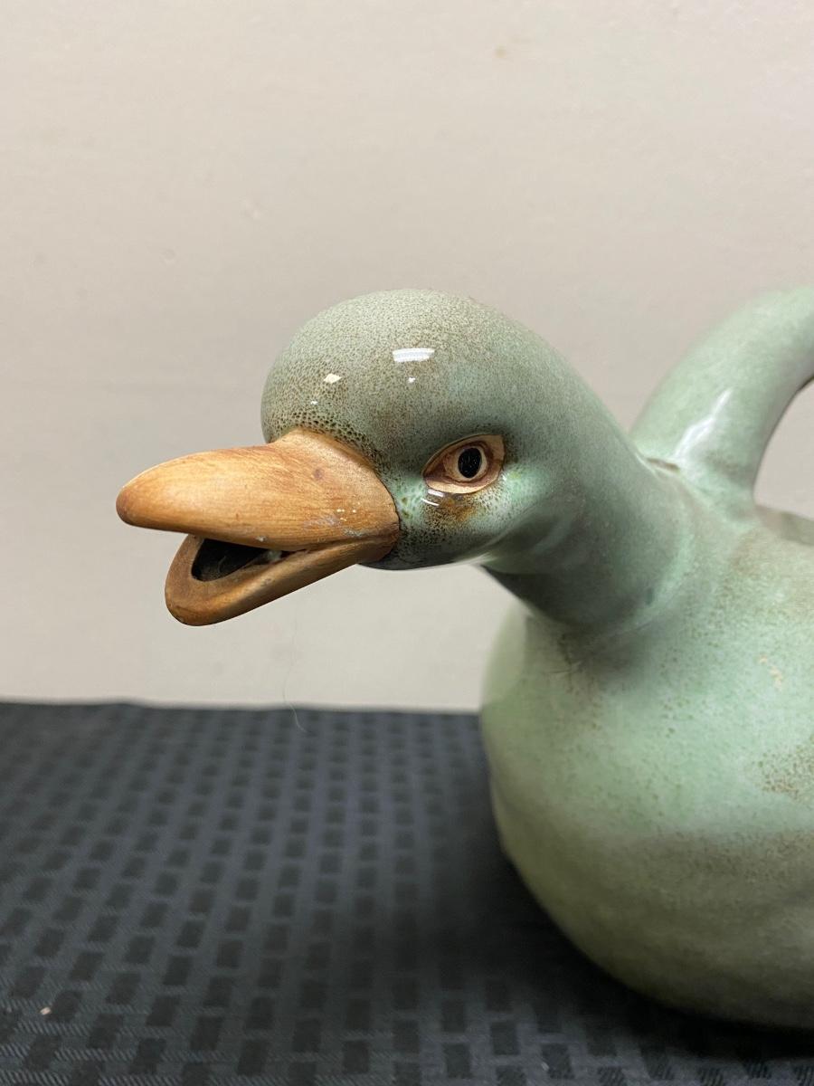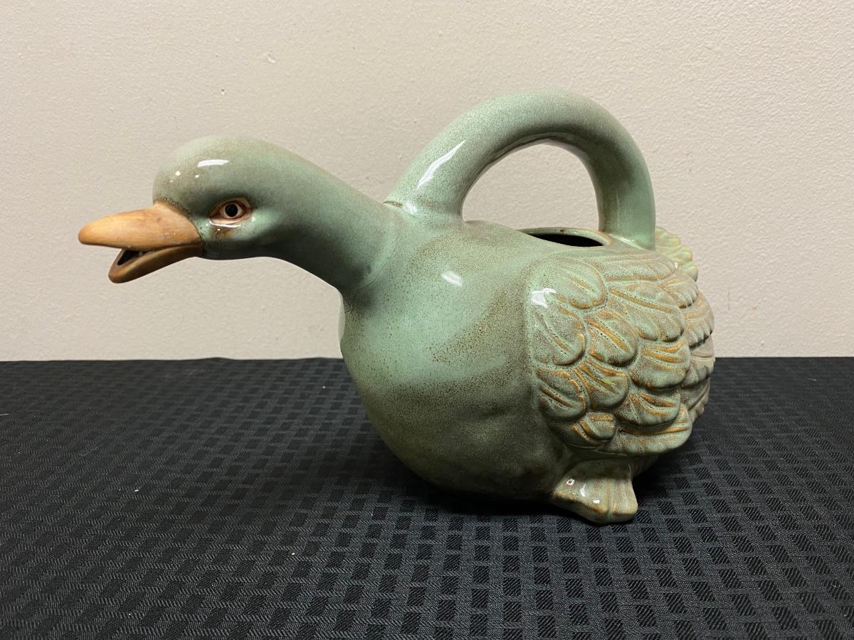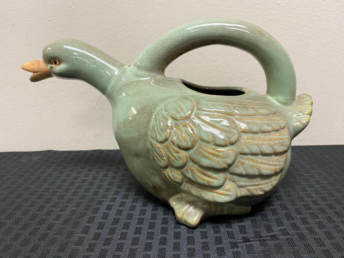 Muted Green Pottery Goose Duck Ceramic Watering Can Pitcher Yard Garden Art