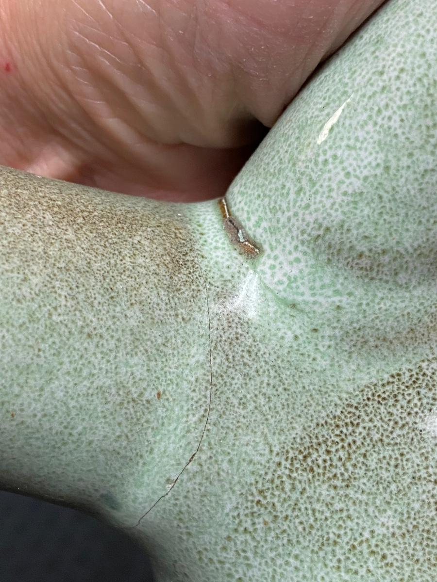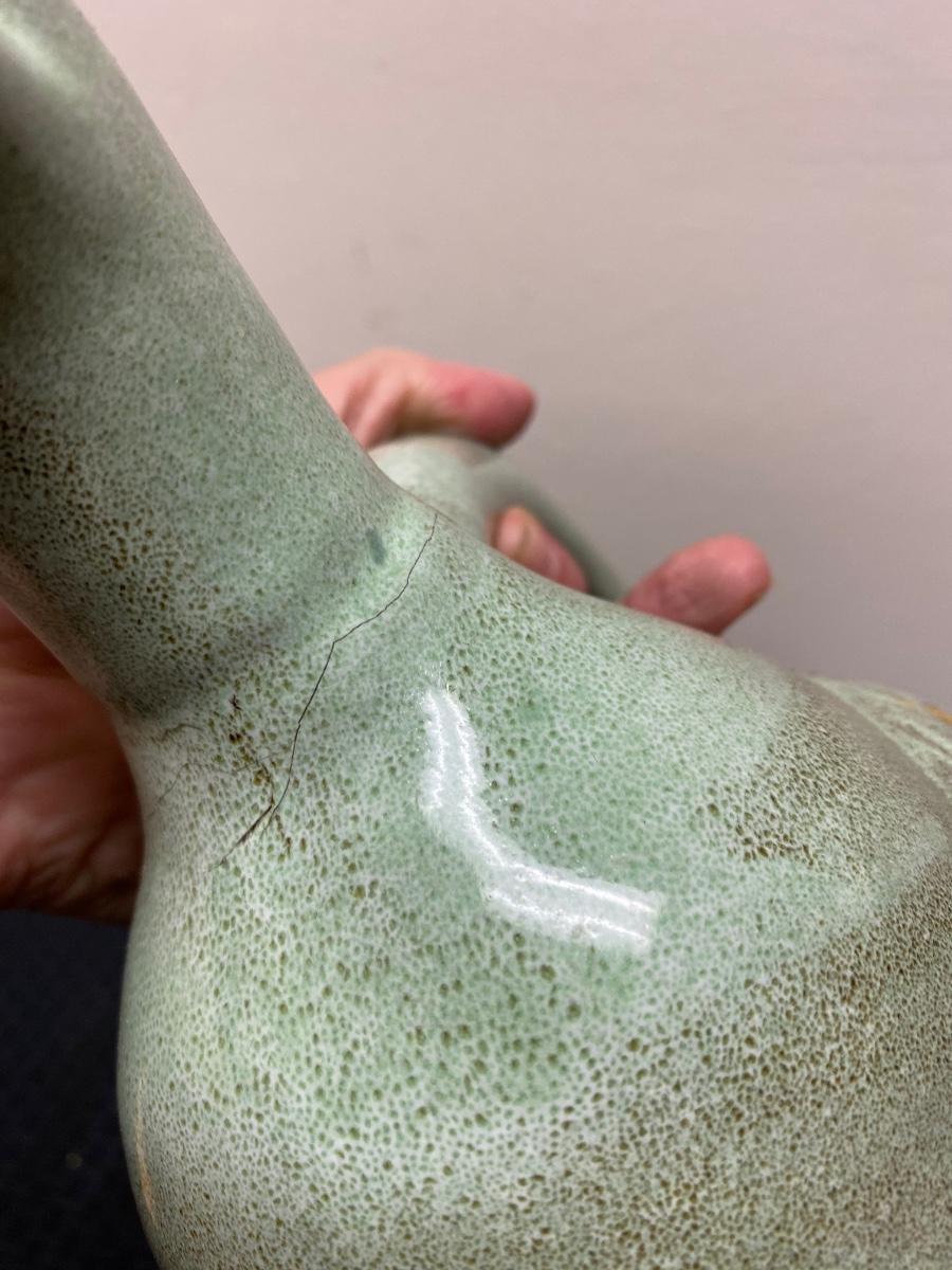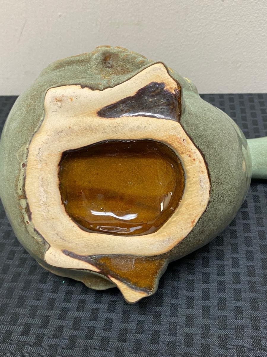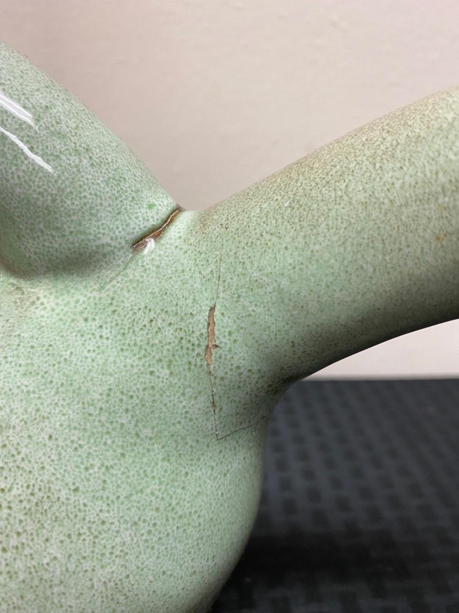 Muted green ceramic goose watering can. Looks like Frankoma with the coloring but it is not marked. There is a a crack around the neck where it meets the body. Does not look like a repair but cracked, does not go all the way around and do not know if it goes all the way through. Displays great, perfect for garden art. About 12" size.