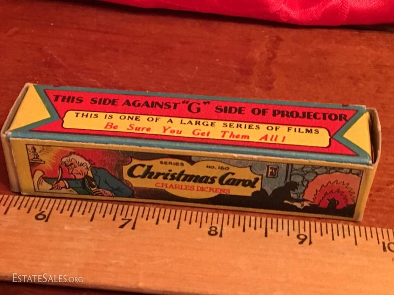 Movie reel is "Christmas Carol" By Charles Dickens. Film # 160. Box, leader, paper film all intact. Great condition with one tiny riped out part on the start edge. Minor! Was 10c.