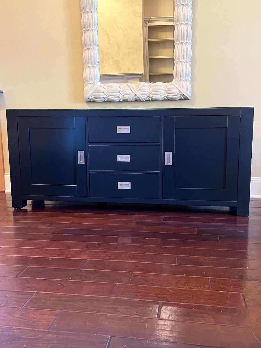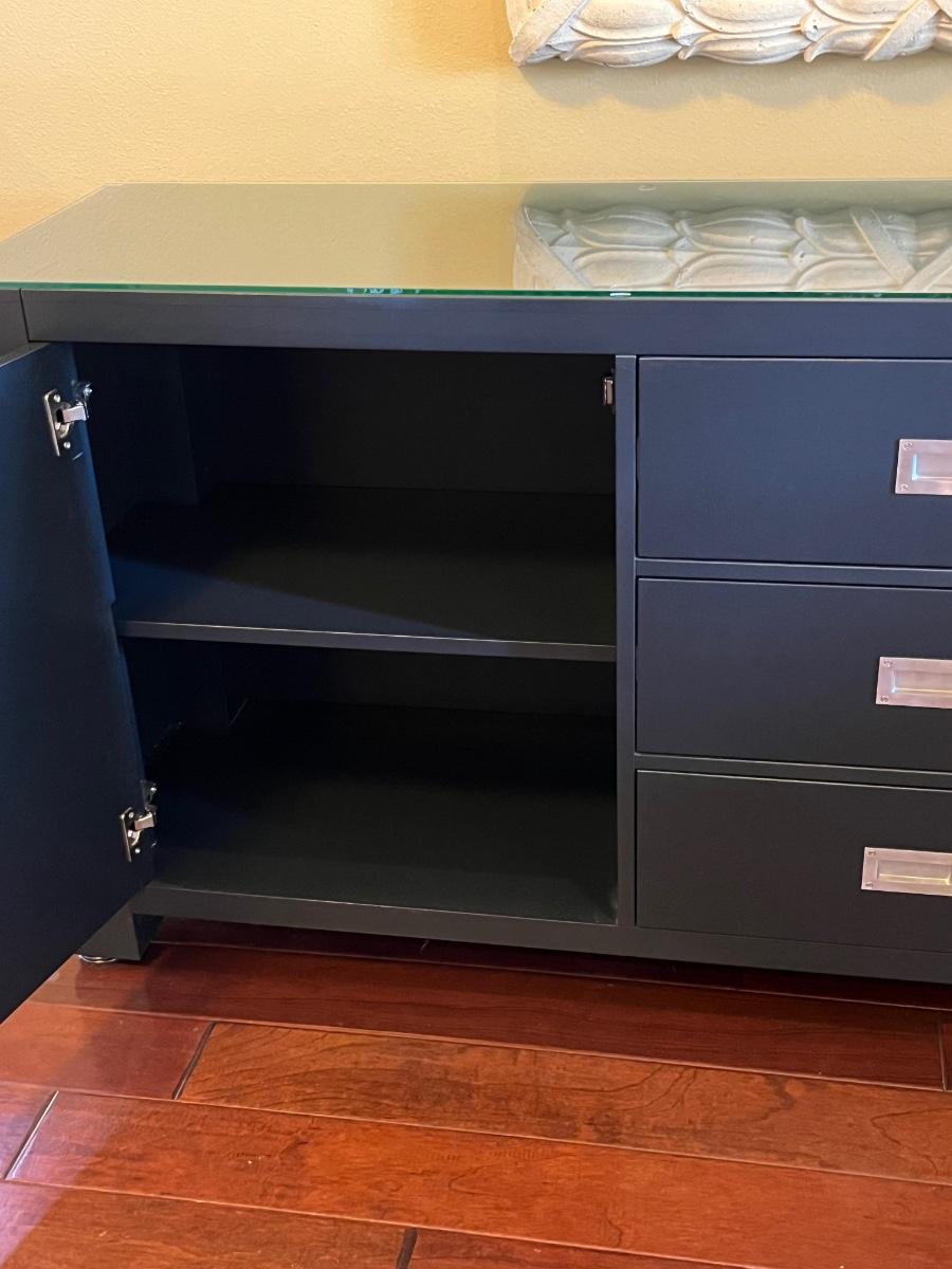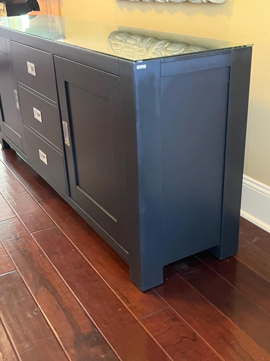 32” H x 75” W x 18” D ~ This piece has traveled far and wide and one panel has shifted slightly on one side as seen in photo ~ Drawers slide easily & shelves are adjustable ~ Included is a Custom Glass top which was made to protect the top.~ ALSO has a matching coffee table sold separately