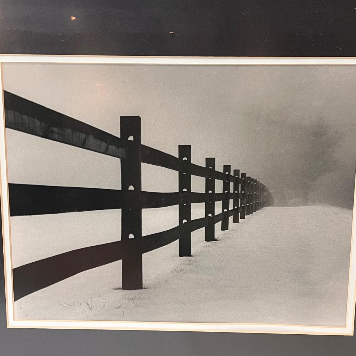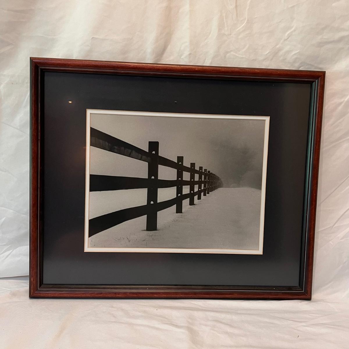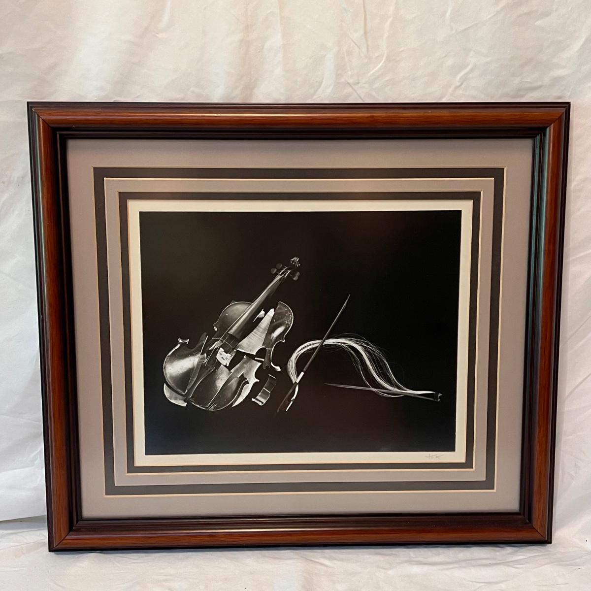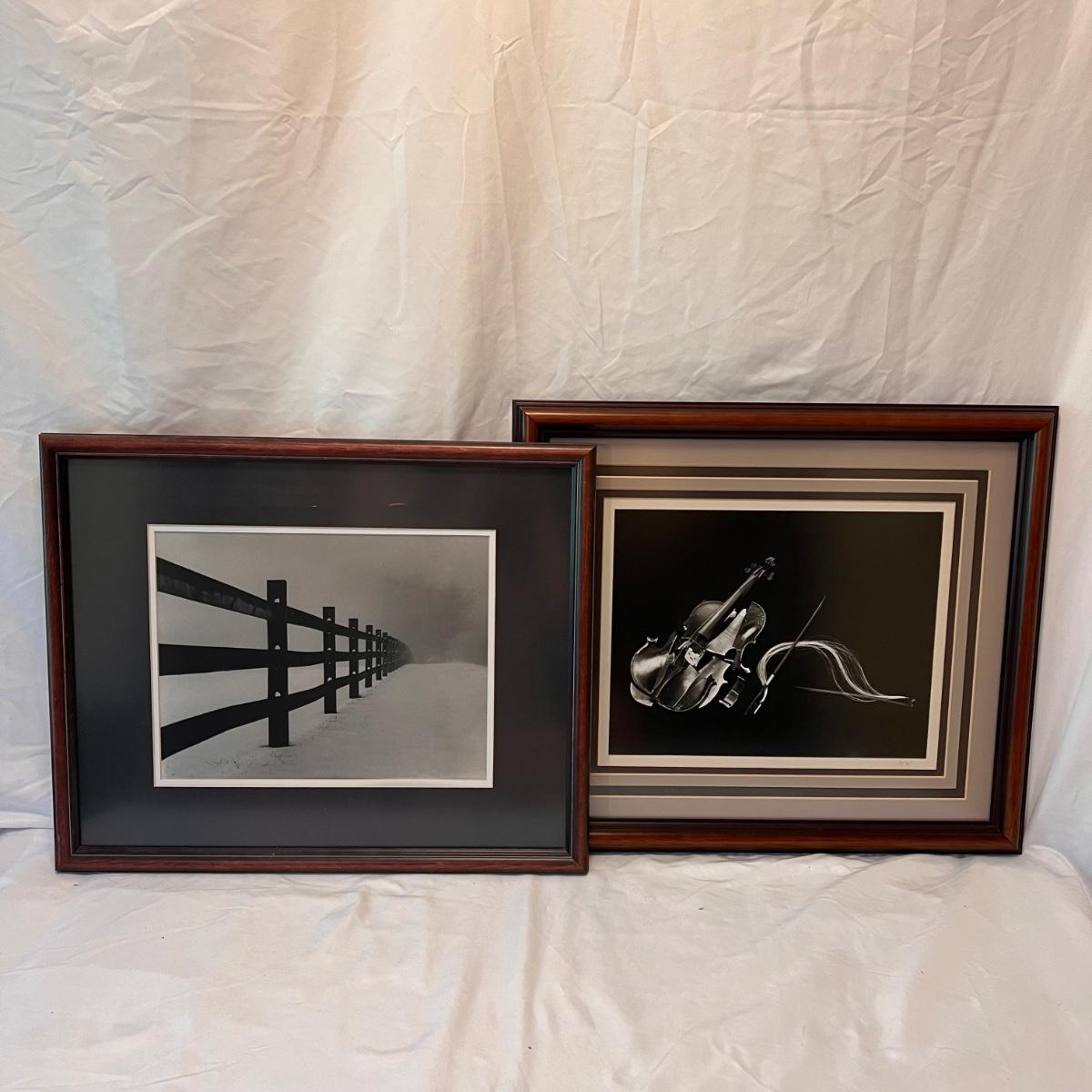 This lot includes two framed photographs, one by Richard B. Johnson and one by Myron Krasney. The violin photo appears to be signed with “M K” in the bottom right corner. This photograph is matted multiple times in a wooden frame. The fence photograph appears to be shot by Richard B. Johnson. It is matted in a wooden frame. The Myron photograph measures 22” x 18”H and the Richard one measures 21.5” x 17.5”H. Shipping available.