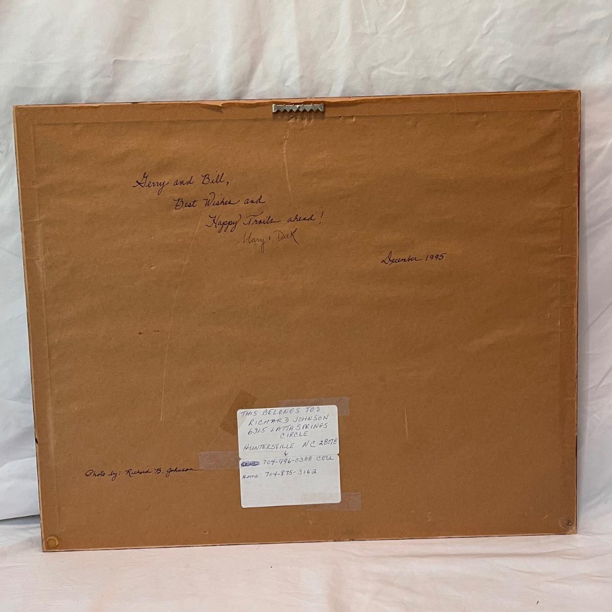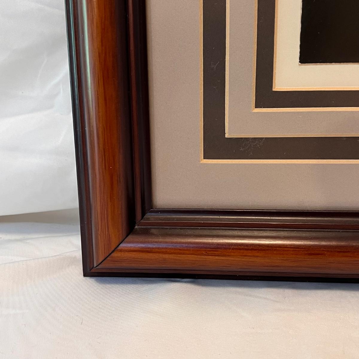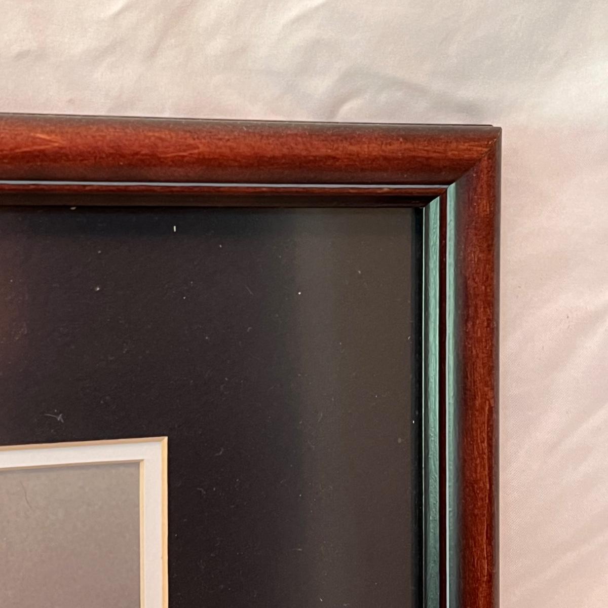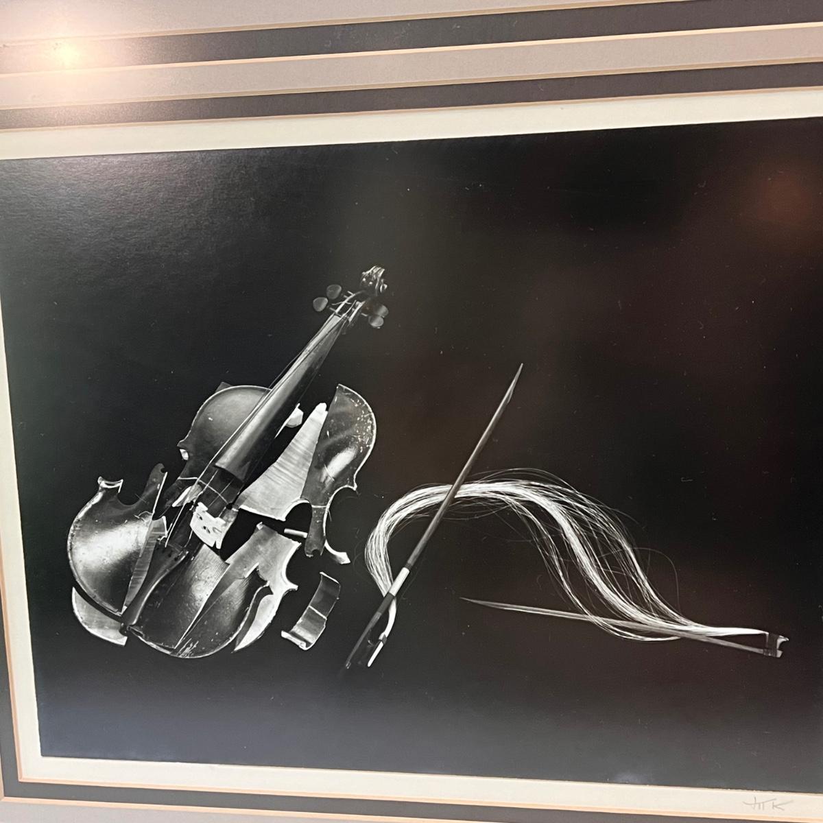 This lot includes two framed photographs, one by Richard B. Johnson and one by Myron Krasney. The violin photo appears to be signed with “M K” in the bottom right corner. This photograph is matted multiple times in a wooden frame. The fence photograph appears to be shot by Richard B. Johnson. It is matted in a wooden frame. The Myron photograph measures 22” x 18”H and the Richard one measures 21.5” x 17.5”H. Shipping available.