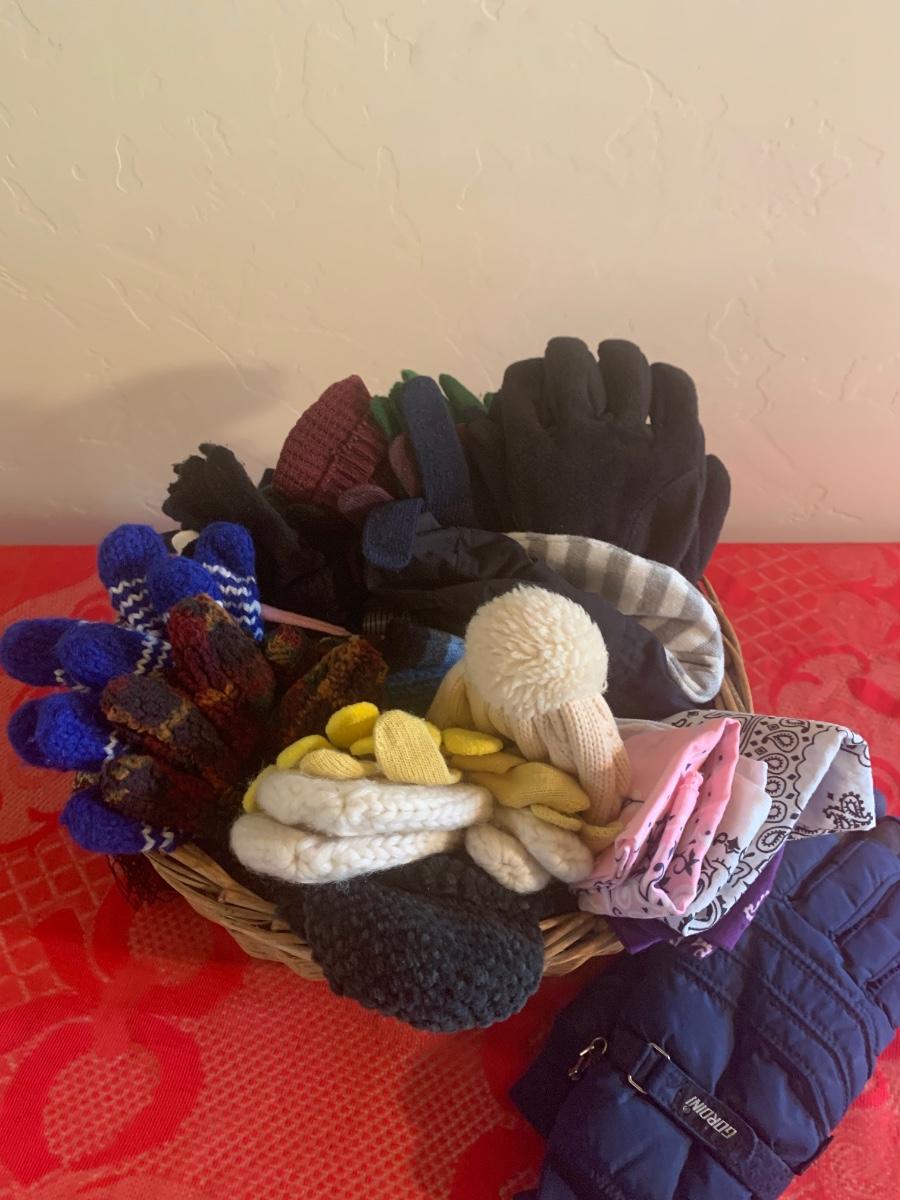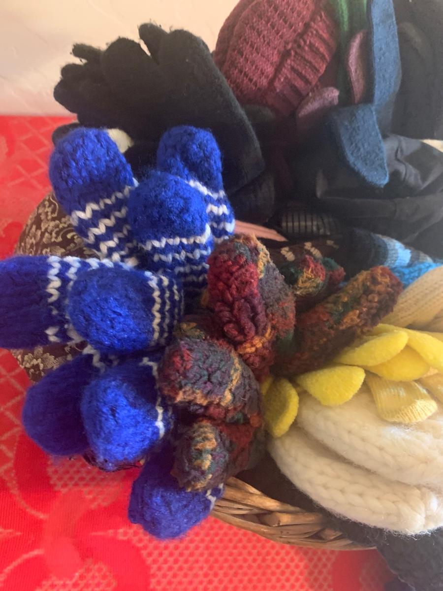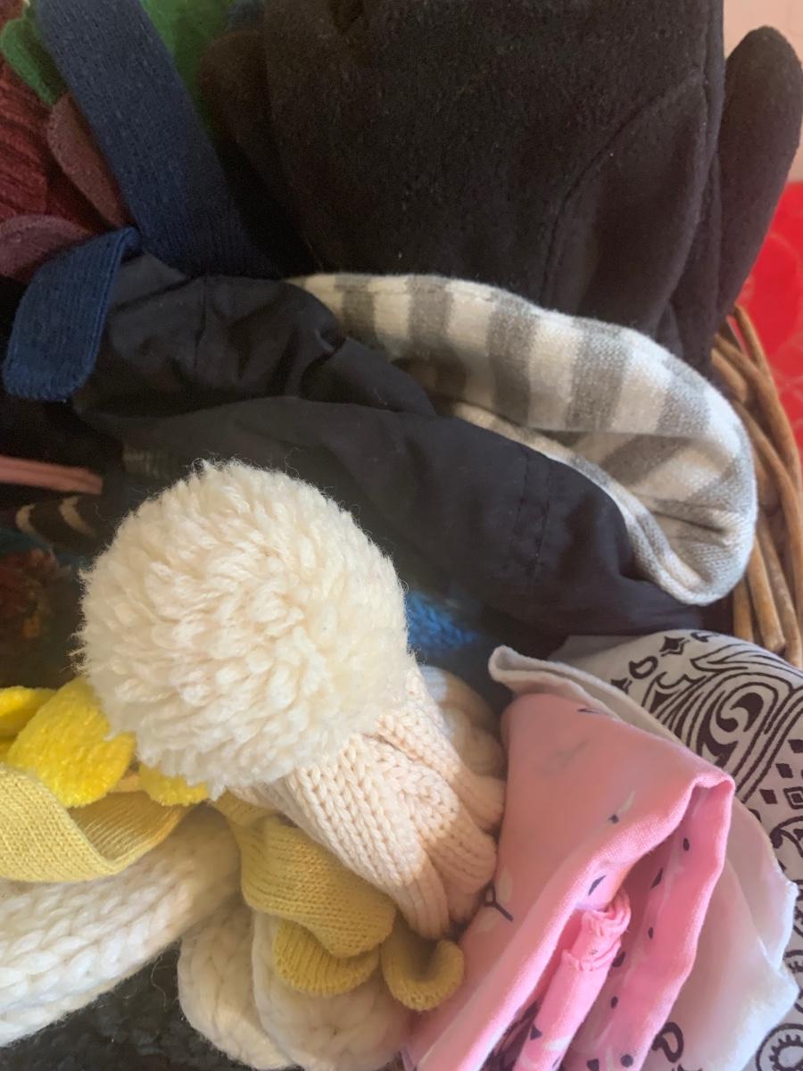 Lot includes a basket full of hats, scarves, gloves. Some of the gloves are wool and hand maid. Nice silky scarf with fringe. Ski gloves. Basket included, 15” wide.