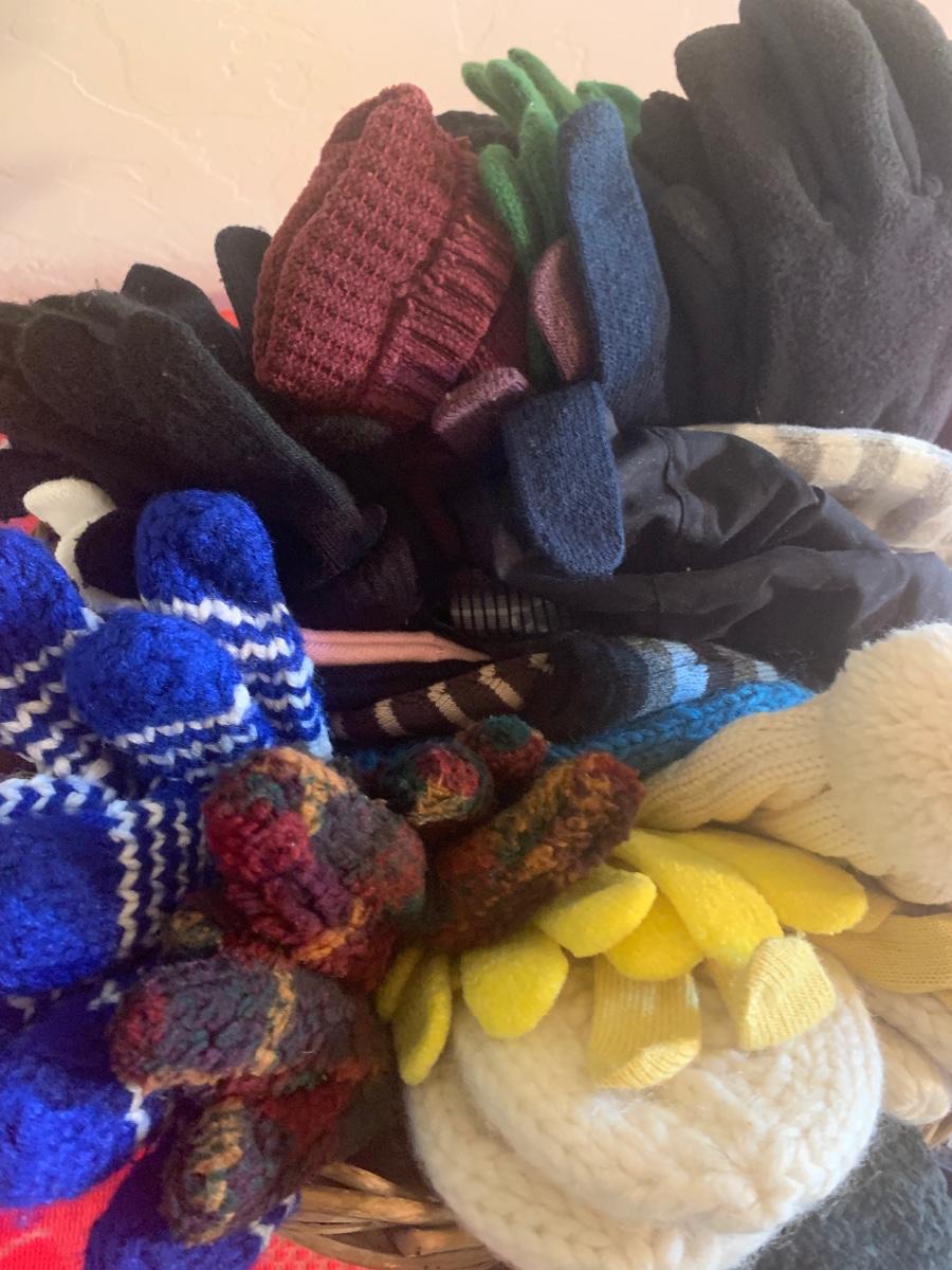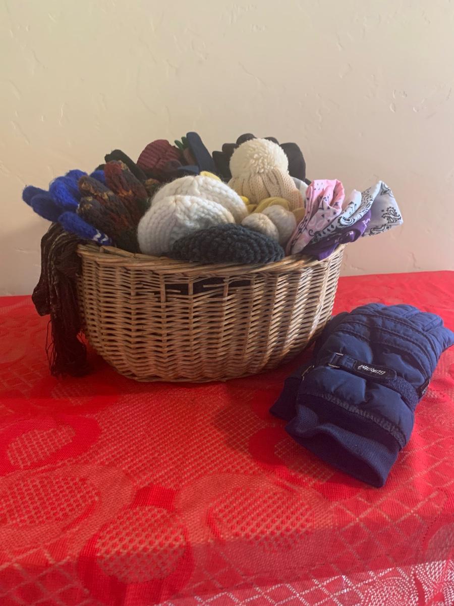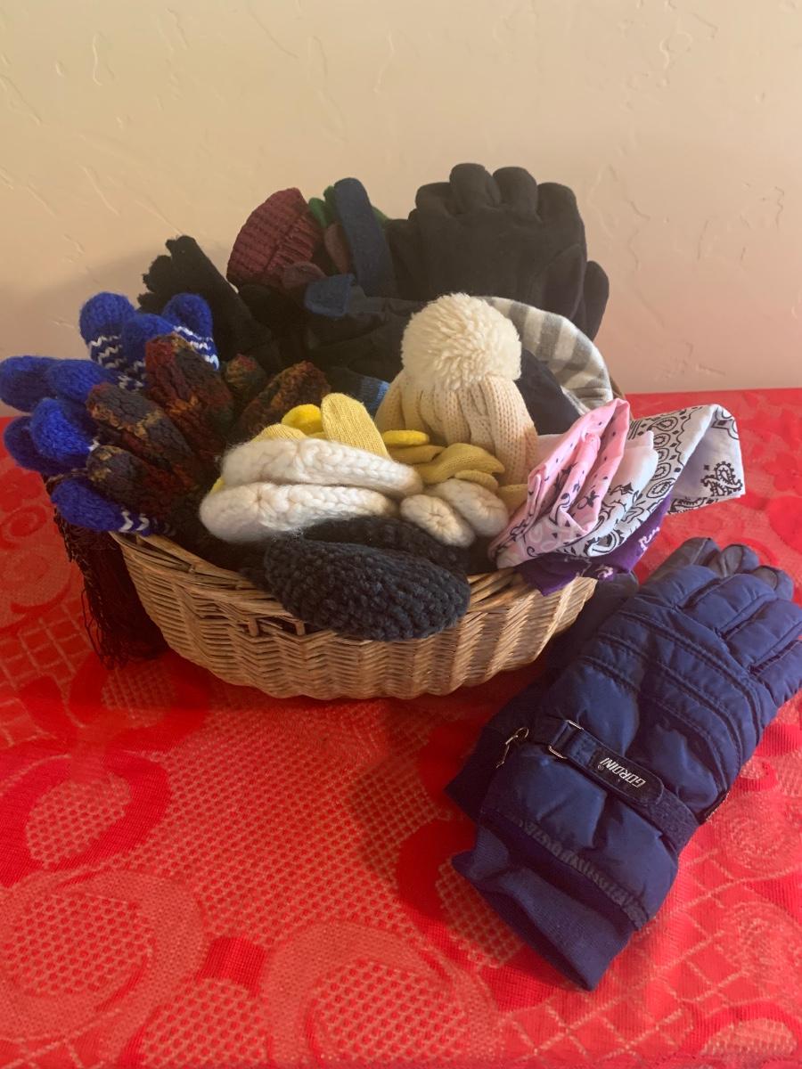Lot includes a basket full of hats, scarves, gloves. Some of the gloves are wool and hand maid. Nice silky scarf with fringe. Ski gloves. Basket included, 15” wide.
