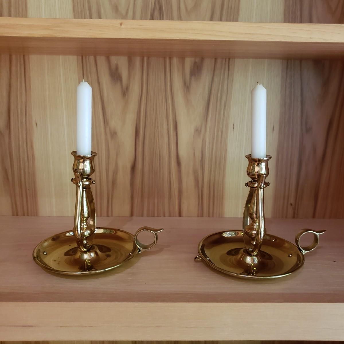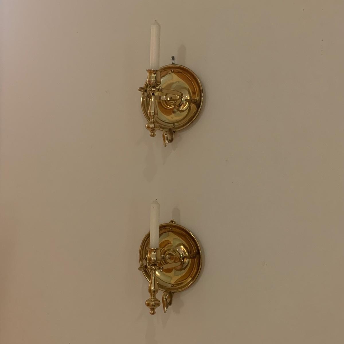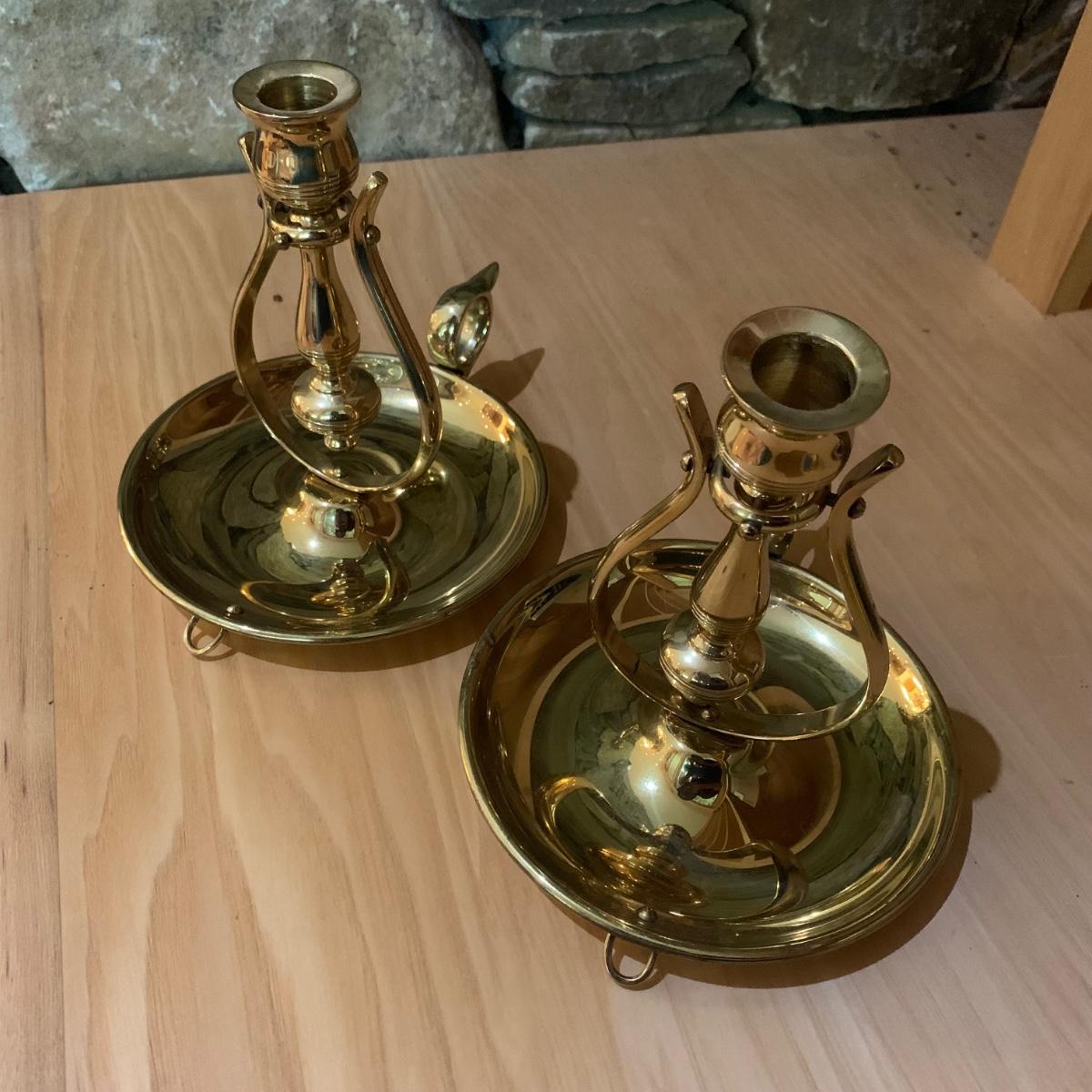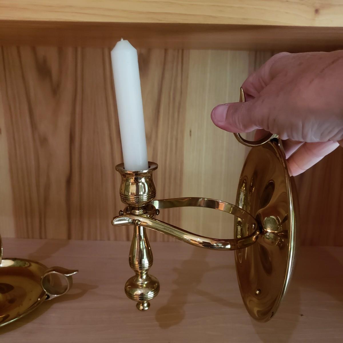 These matching pair of brass candle sconces can hang or sit on a flat surface. They measure 6"D x 6.25"H in the tabletop position. The candleholders are gimbaled on a pivoted head so they can move around while keeping the candle steady in rough seas. There is a hook for hanging on a wall.