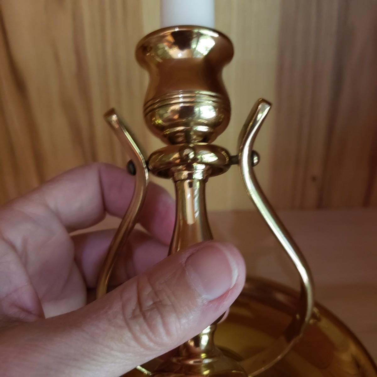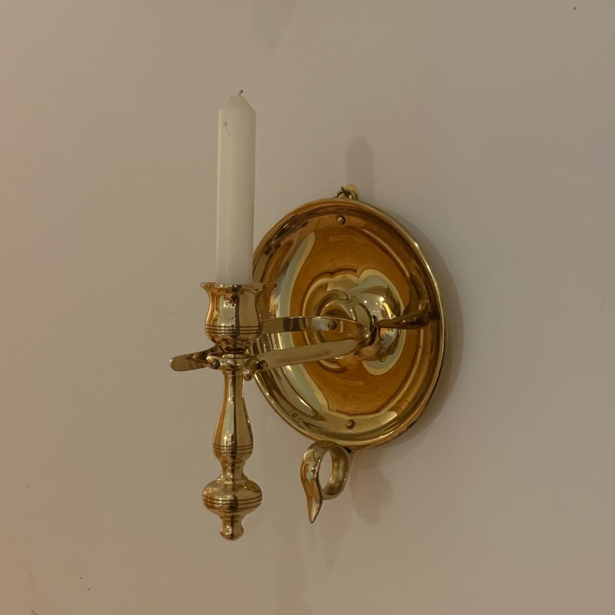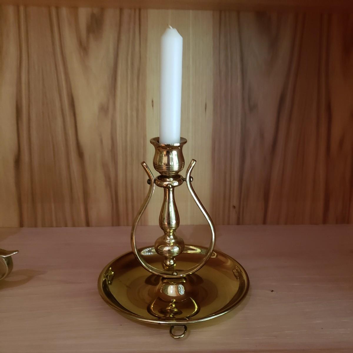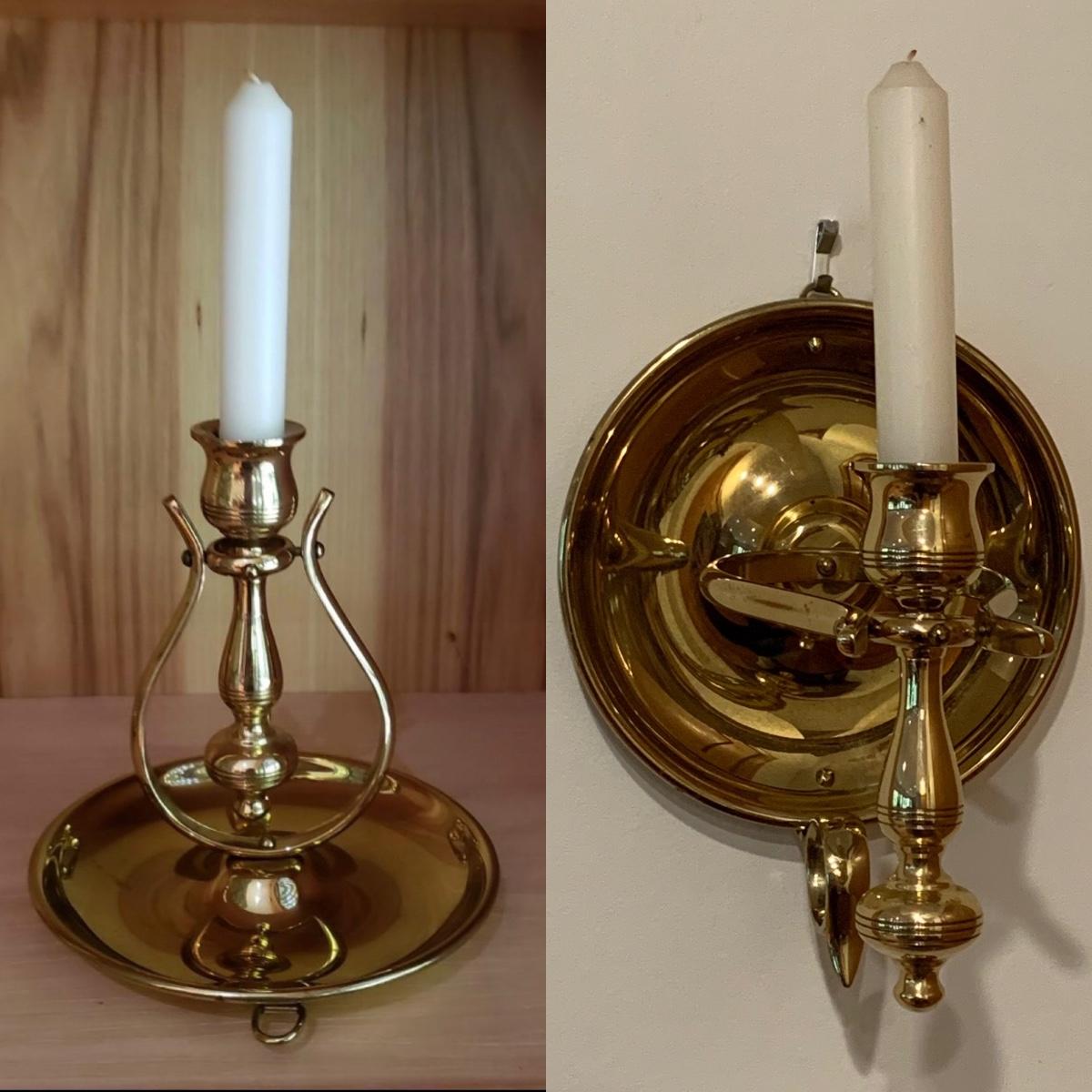 These matching pair of brass candle sconces can hang or sit on a flat surface. They measure 6"D x 6.25"H in the tabletop position. The candleholders are gimbaled on a pivoted head so they can move around while keeping the candle steady in rough seas. There is a hook for hanging on a wall.