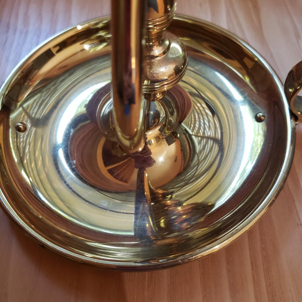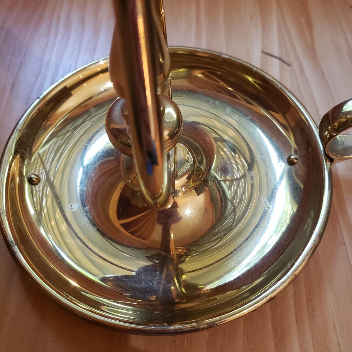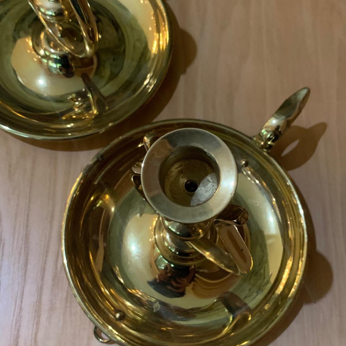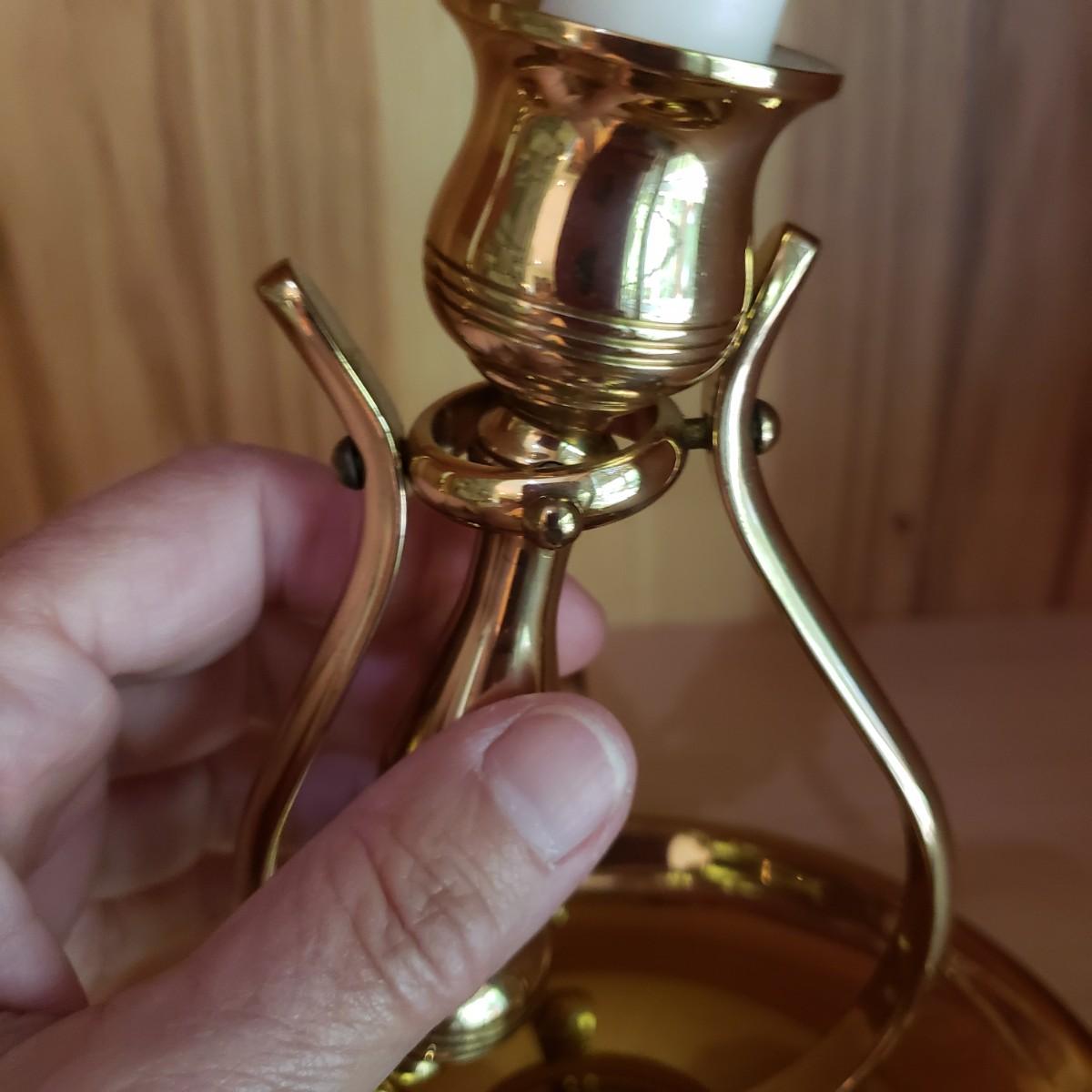These matching pair of brass candle sconces can hang or sit on a flat surface. They measure 6"D x 6.25"H in the tabletop position. The candleholders are gimbaled on a pivoted head so they can move around while keeping the candle steady in rough seas. There is a hook for hanging on a wall.