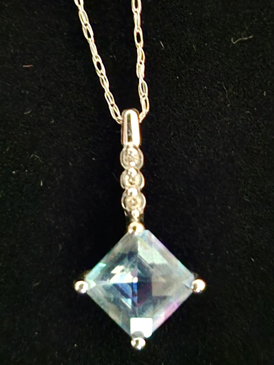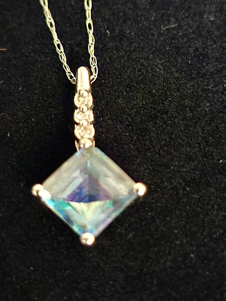 Mystic Topaz set in 10K white gold with 3 diamond accents. Chain is 18 inches.