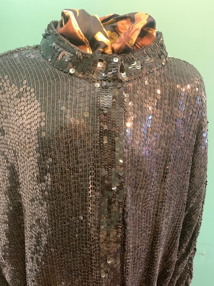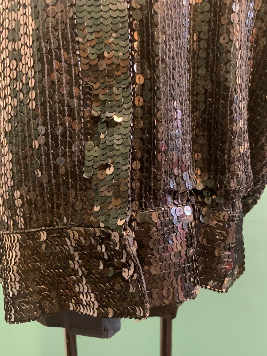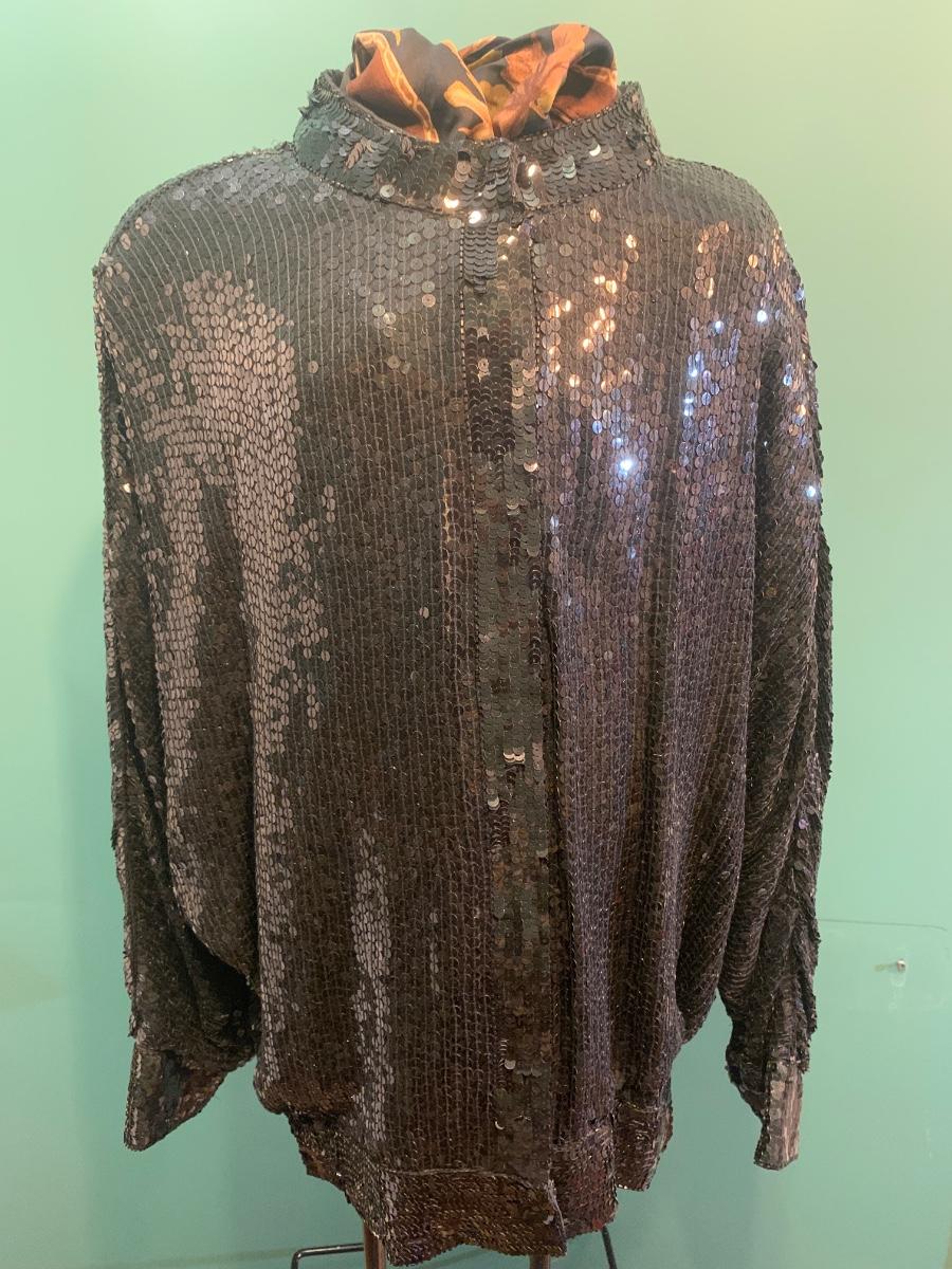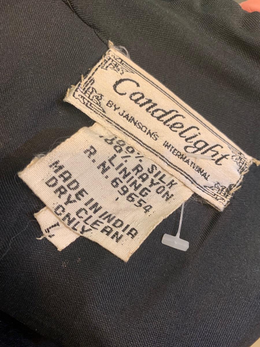 Embark on a night of mystery and elegance with this exquisite vintage jacket from Candlelight by Jainson’s International. Crafted in 100% silk, adorned with intricate black sequins and beads, this batwing party jacket, size large, beckons the allure of the past. Step into the New Year with glamour and mystique, making a statement at every turn. Uncover the magic of the season with this stunning piece that seamlessly blends luxury and vintage charm. Accessories not included,