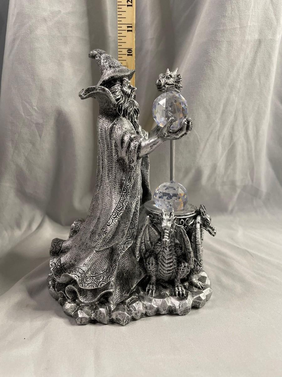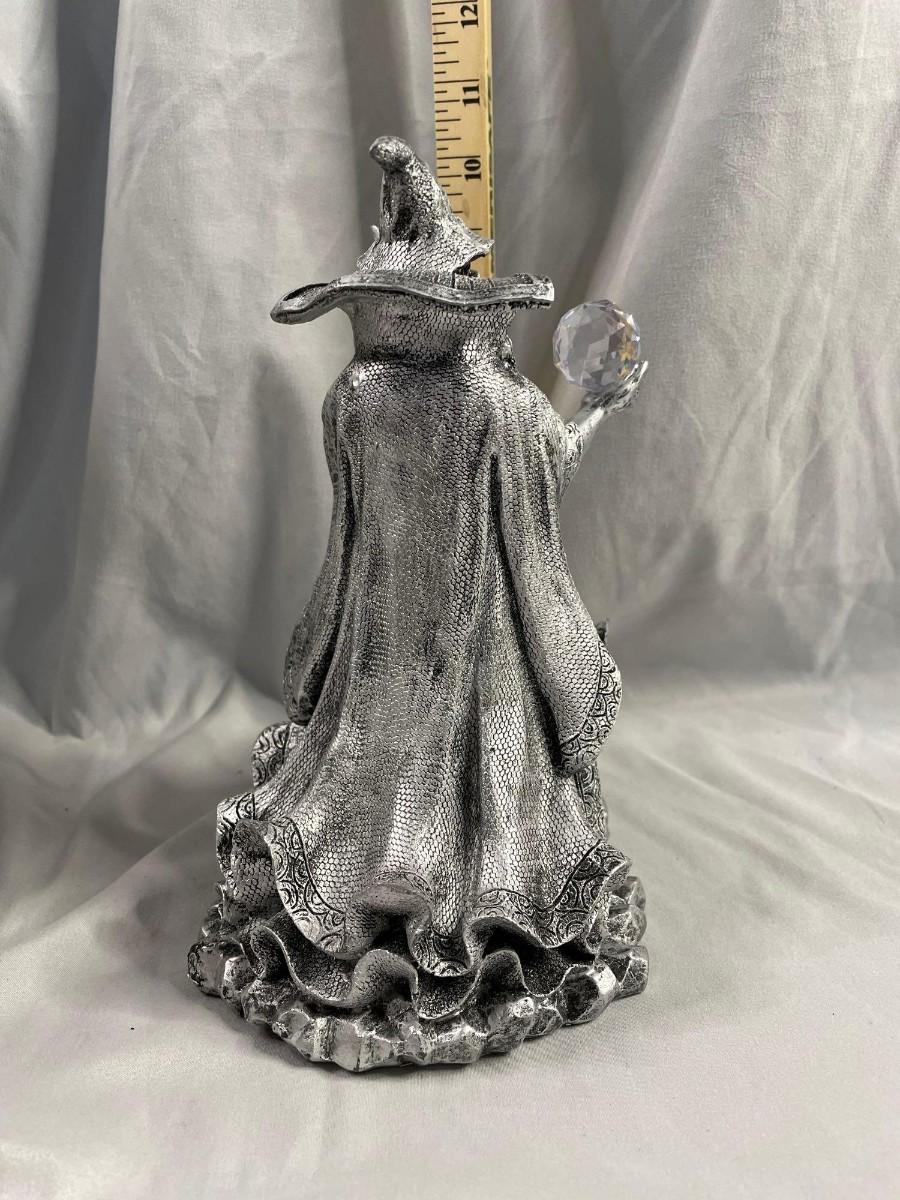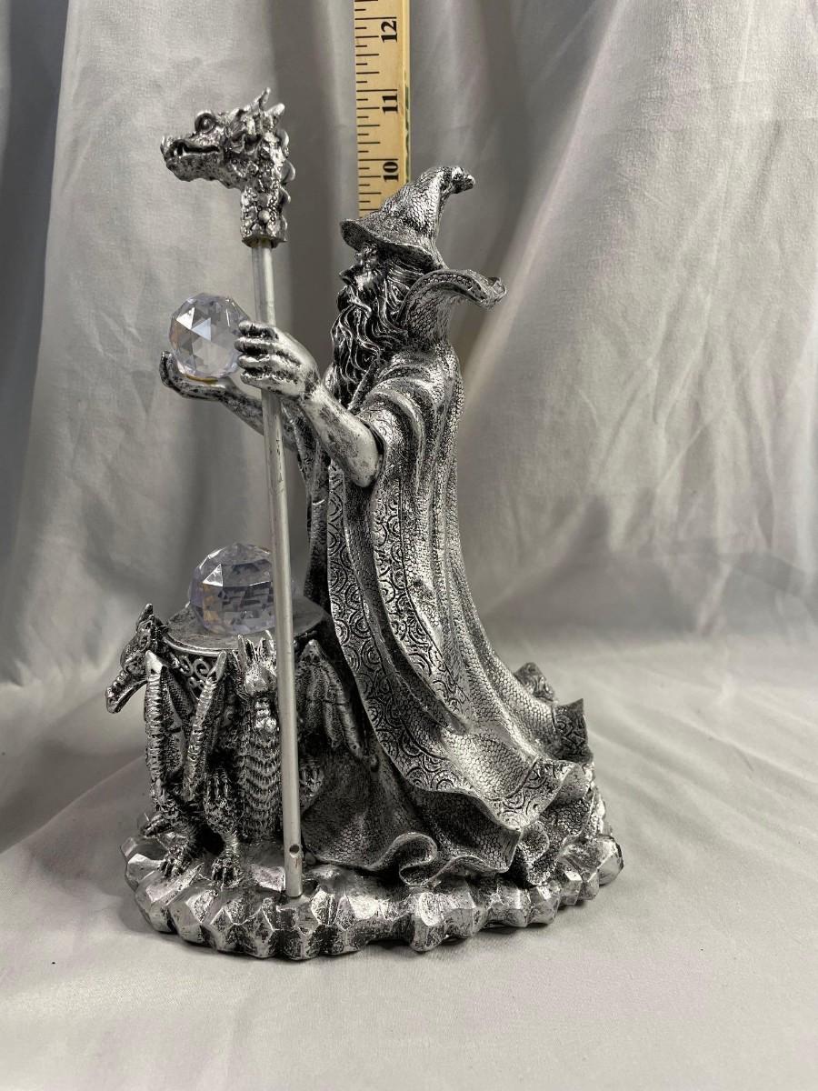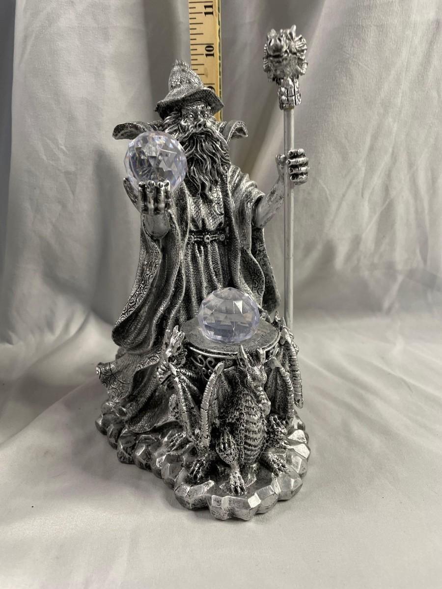 This magician is made of a resin type of material and both faceted balls are made of a plastic material. The staff is removable. No issues found.<br />