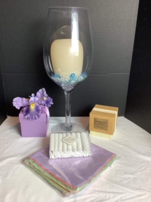 Large Wine Glass with Decorative Glass Pebbles and Large White Candle ,
