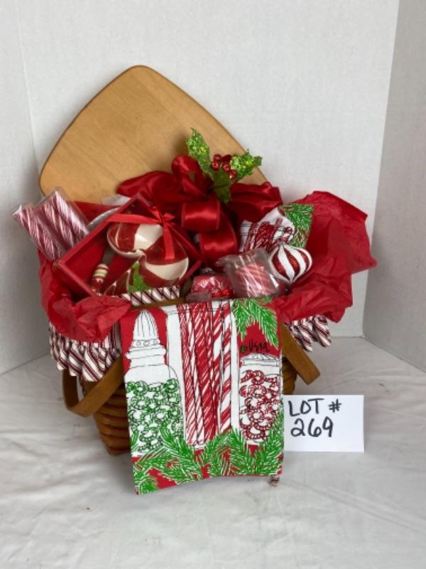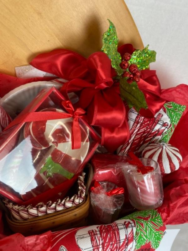 Ornaments, tea towel, apron, candy dish , spreader, paper products with large Longaberger basket and lid with liner