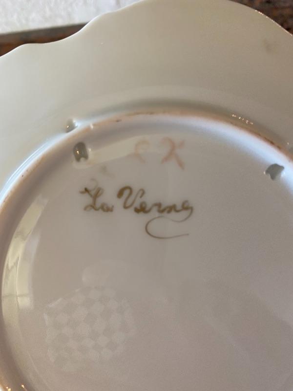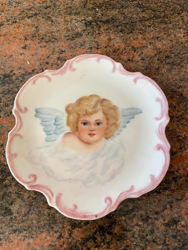 Vintage cherub plate. Hand painted. Pink edge detail. Signed La Verne on the back. There is two holes to run string through for wall hanging. About saucer size.