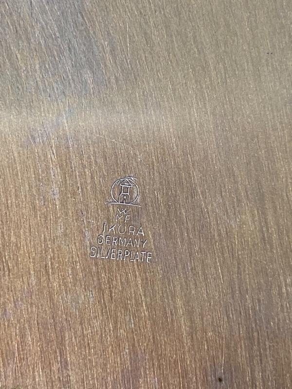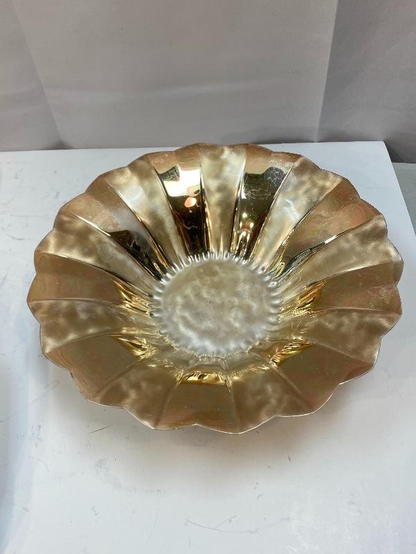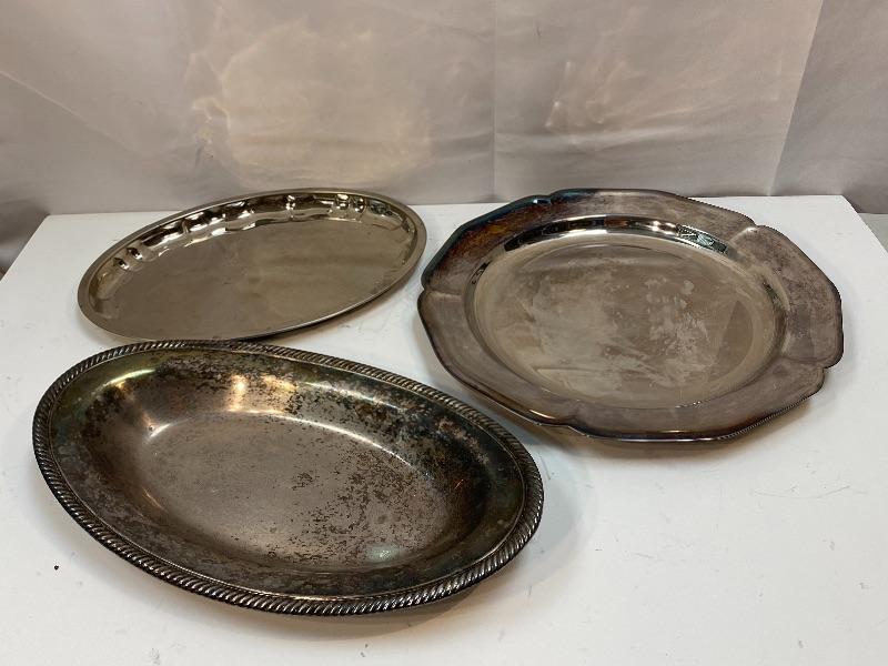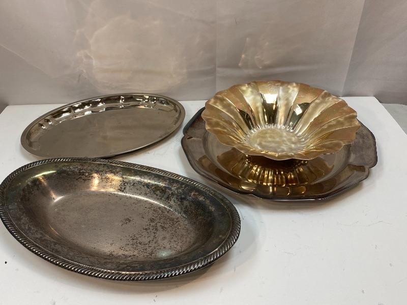 4 piece lot of mixed silver plate serving platters, plates and bowl. Need to be polished. Only two pieces had marks.