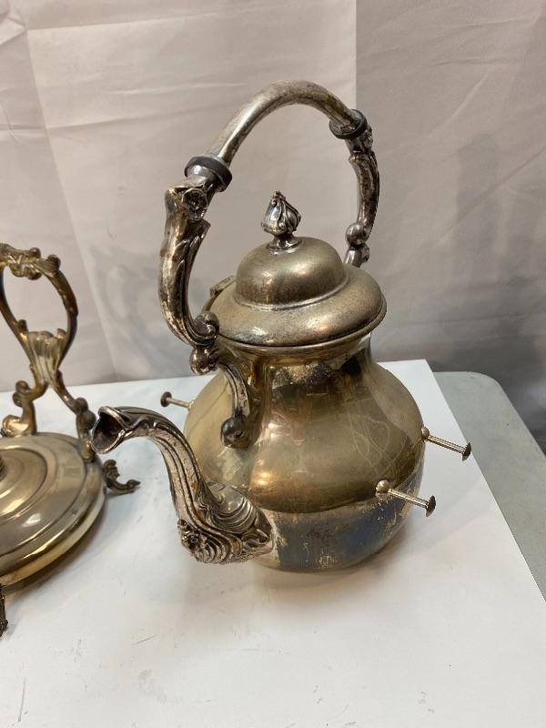 Vintage Sheridan silver on copper coffee/tea pot with warming stand. Beautiful design. Kettle has pegs that holds it in place above burner. Sits about 14" on top of stand. No dings or dents just tarnish.