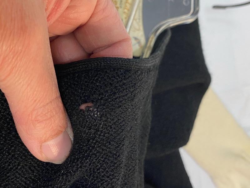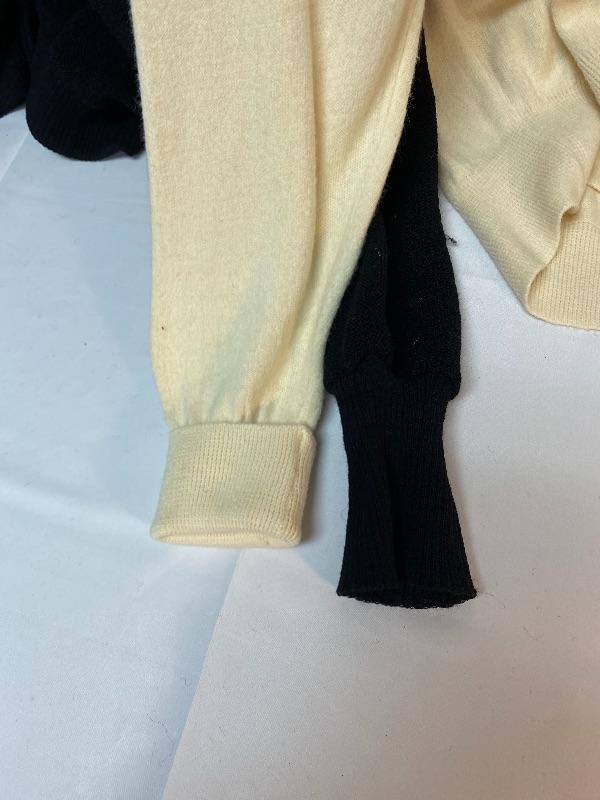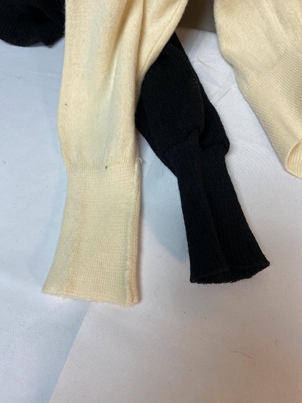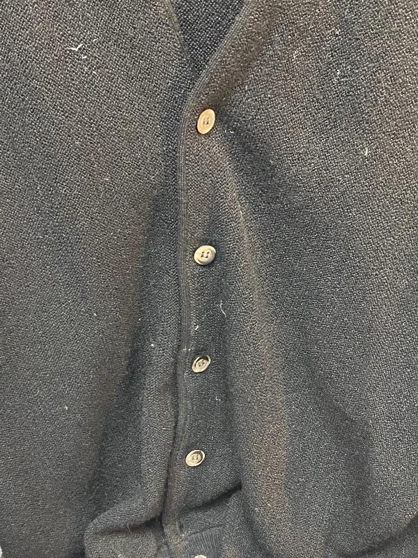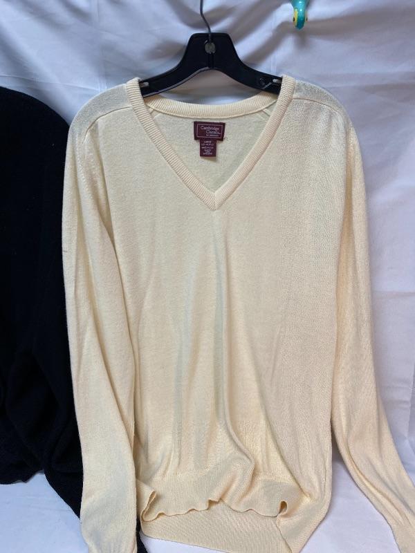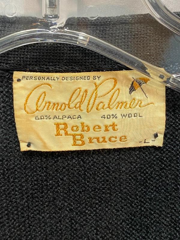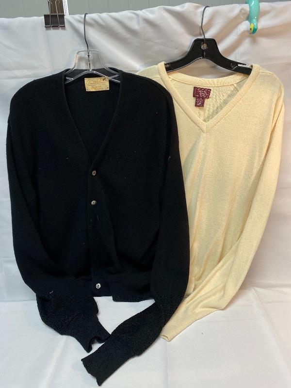 Pair of men's vintage sweaters. Black button front from Arnold Palmer for Robert Bruce, size large. Cream color v-neck pullover from Cambridge Classics, size large. No obvious stains or spots. Small hole along neck line seam of black sweater, not noticeable unless stretched.