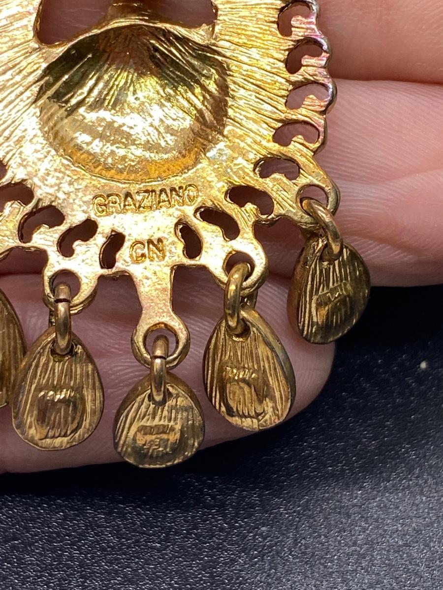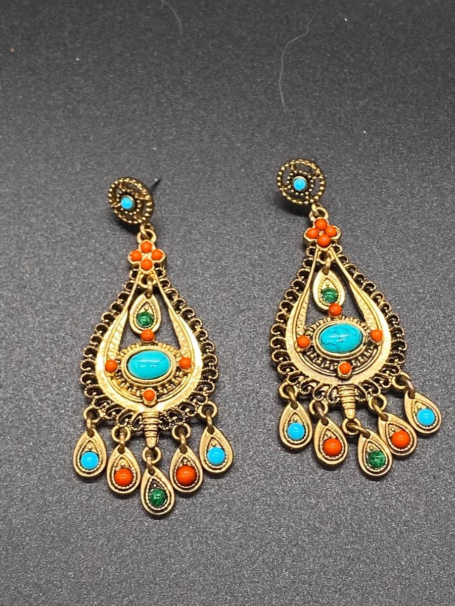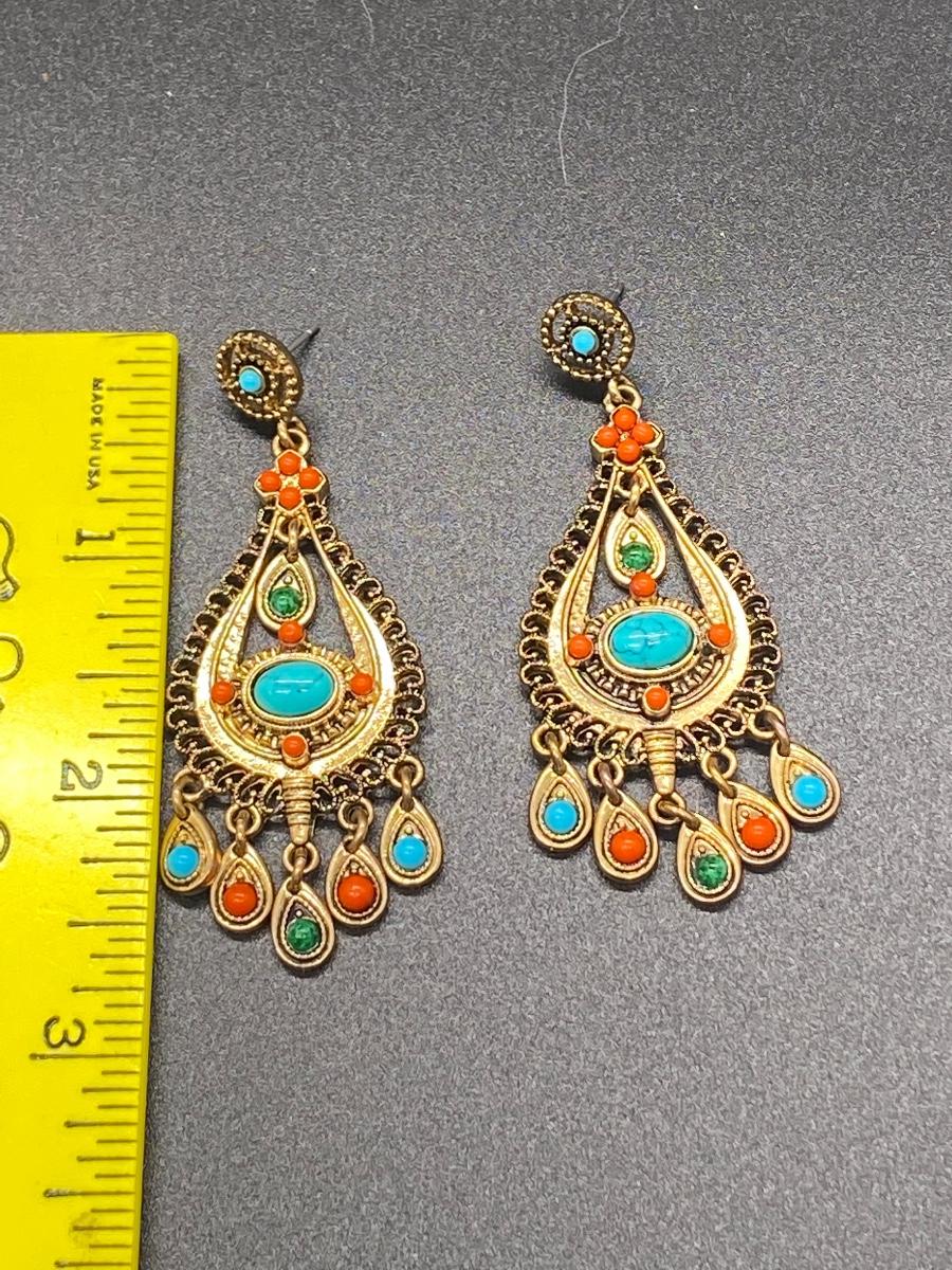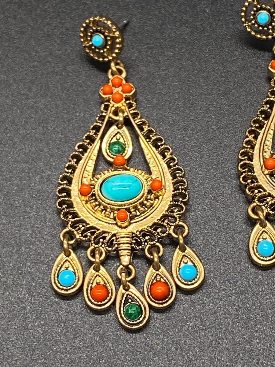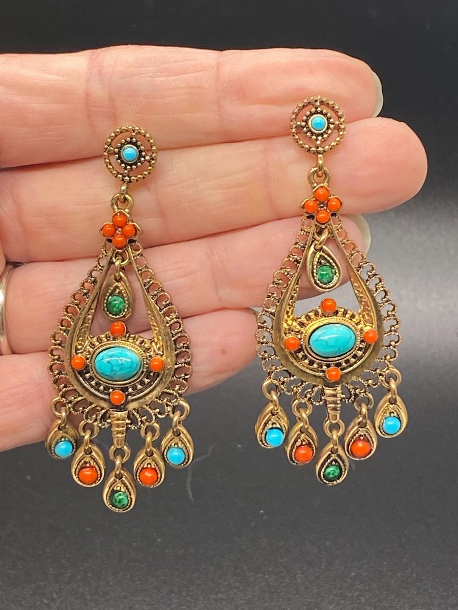 Vintage Graziano dangle earrings. Gold tone setting with faux turquoise, coral, and jade cabochons. Good condition. About 2.5" length.
